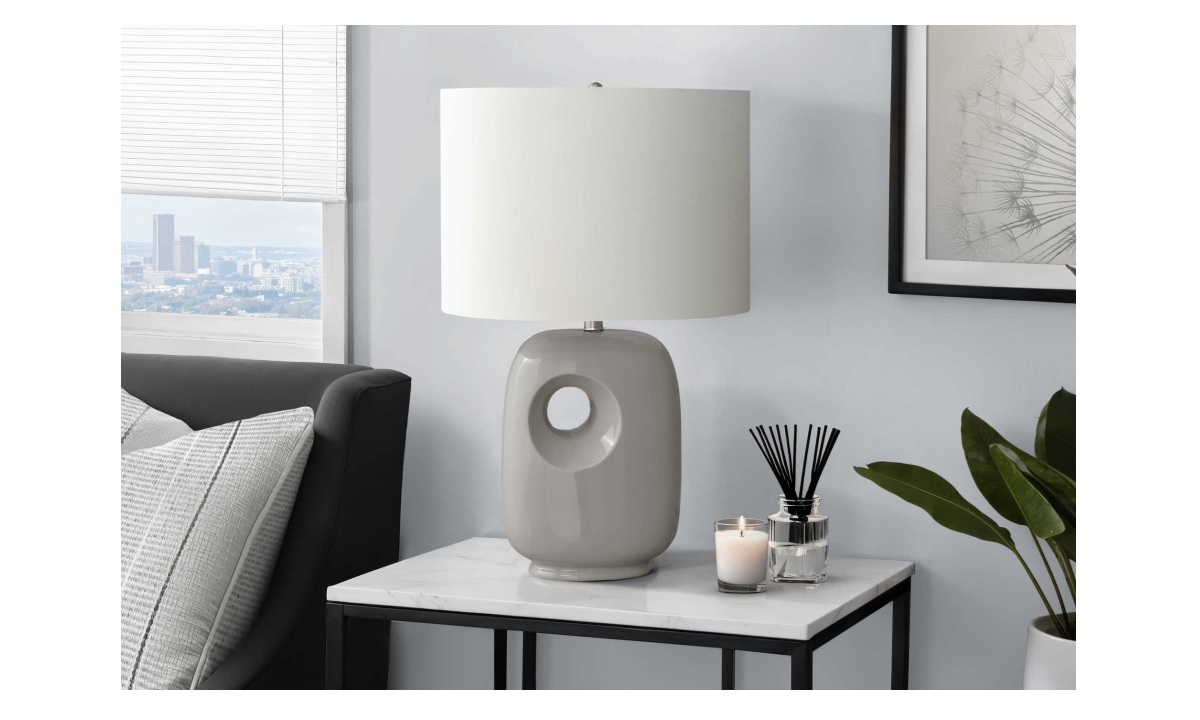 Illuminate your space with this modern and trendy 26″h table lamp with a sleek light grey ceramic base and topped with a linen-blend, ivory fabric shade. The architectural and contemporary cut-out design on this lighting piece will easily brighten and elevate your home decor whether placed on an end or side table, or on a nightstand as a chic decorative and functional accent. The convenient on/off rotary switch operates up to a 100W bulb (not included) to instantly brighten up a living room, office, or bedroom space. Only minimal assembly is required, and this eye-catching lamp will be ready to add some fashionable and functional ambiance to a room.