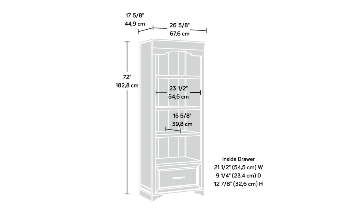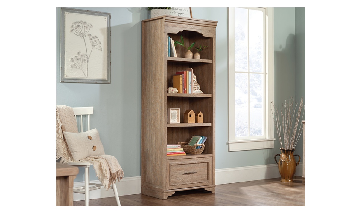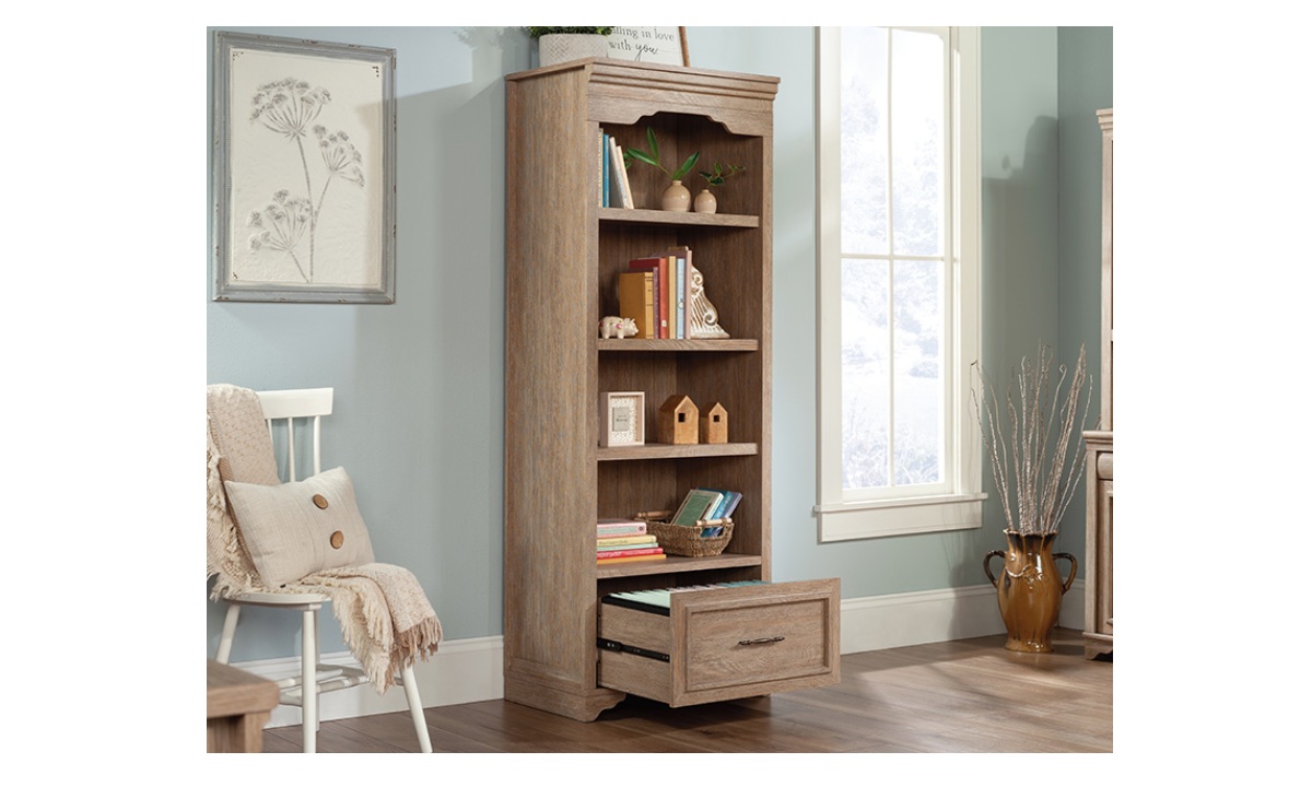 Add a touch of timeless beauty and charming style to your home with this bookcase with drawer from the Rollingwood® collection. This bookcase with storage features three adjustable, spacious shelves that are ideal for storing and displaying anything you need – from collectibles and prized possessions to knick-knacks and decorative plants. Create flexible storage options in your office with your display bookcase that will hold items of all different shapes and sizes from awards to textbooks, manuals to schedules. This 4-shelf bookcase features a lower file drawer with full extension slides to hold your most important letter or legal-size hanging files. Or use the drawer for general storage if you don’t have a need to house hanging files. Finished in Brushed Oak™, this office bookcase offers open and file storage for a versatile piece you could use to elevate your home office space or any other setting in your home.