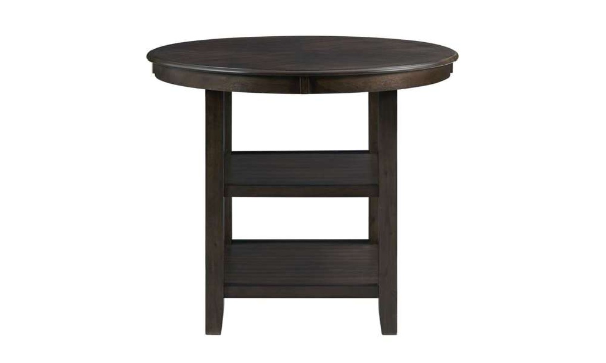 The Amherst Counter will be the heart of your entertaining ensemble in your dining space. Not only is it the spot where you serve up dinner party courses and festive family feasts, but it sets the aesthetic tone for your room and allows you to stage centerpieces that are all your own. The dark, walnut finish is striking and will look great with any decor you might have. The kicked out legs definitely add extra style to this already stunning piece. This table features storage shelving on the base and link spired detailing on the chair backs. The contrasting upholstered seats complete this easy yet elegant look.