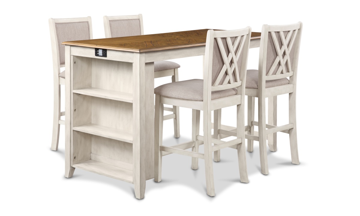 The Amy collection offers a creamy farmhouse bisque finish, making it easy to beautify your dining space. The counter set is meticulously crafted of solid Rubberwood and Mindi wood veneers, ensuring both durability and aesthetic appeal. Comfort takes center stage with the chairs, boasting 100% polyester upholstered seat and back cushions, supported by solid wood legs. The distinctive design elements, including a fancy face reverse diamond veneer tabletop, interlocking double X frame chair back, and tapered table legs, add a touch of sophistication. This super functional 60” rectangle counter table complete with shelf storage and built in power out and USB charging ports is sure to meet your needs. Don’t want the storage end installed?  No problem!  Easy removal turns this into a slender counter table.  Enjoy the charm of the Amy Dining Collection – a perfect blend of durability and style.