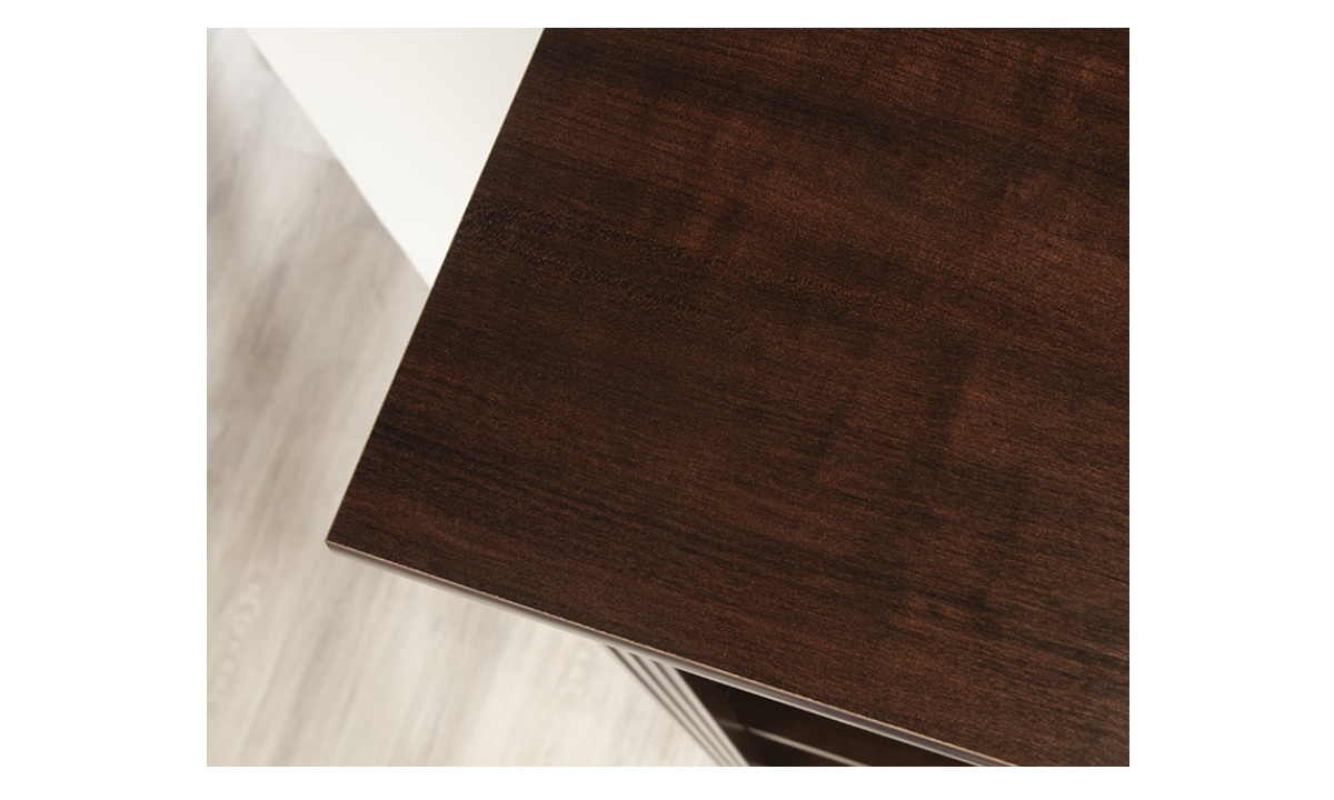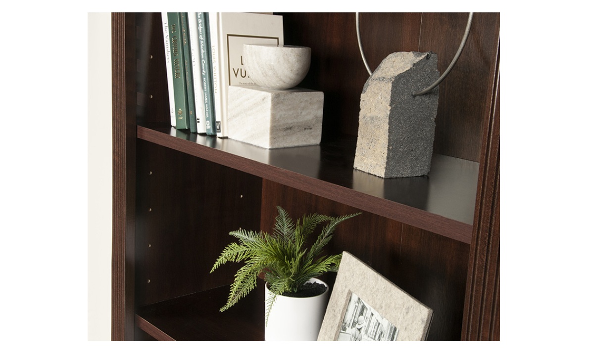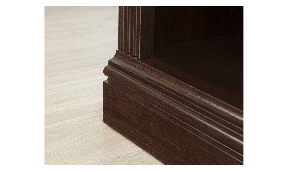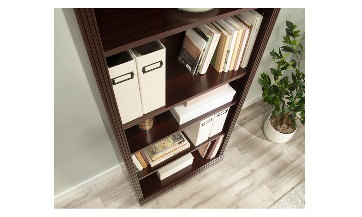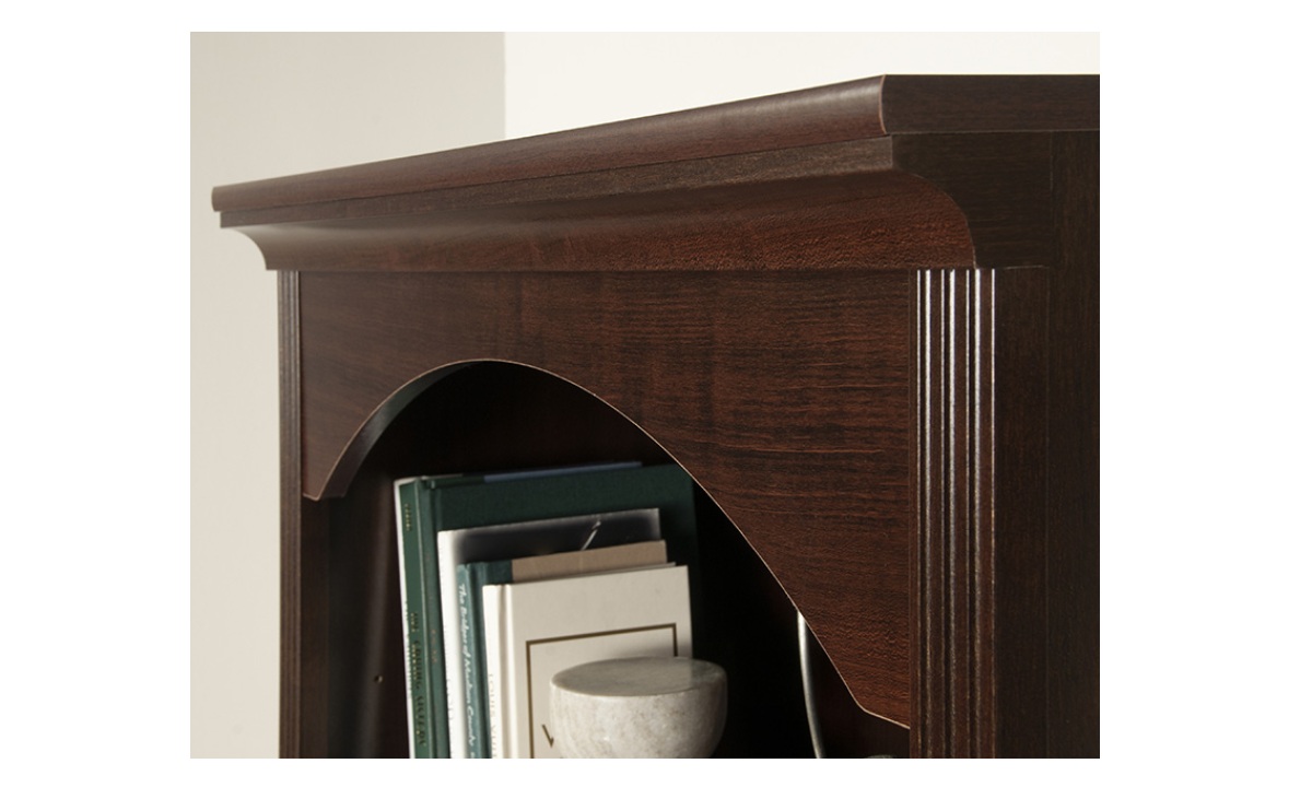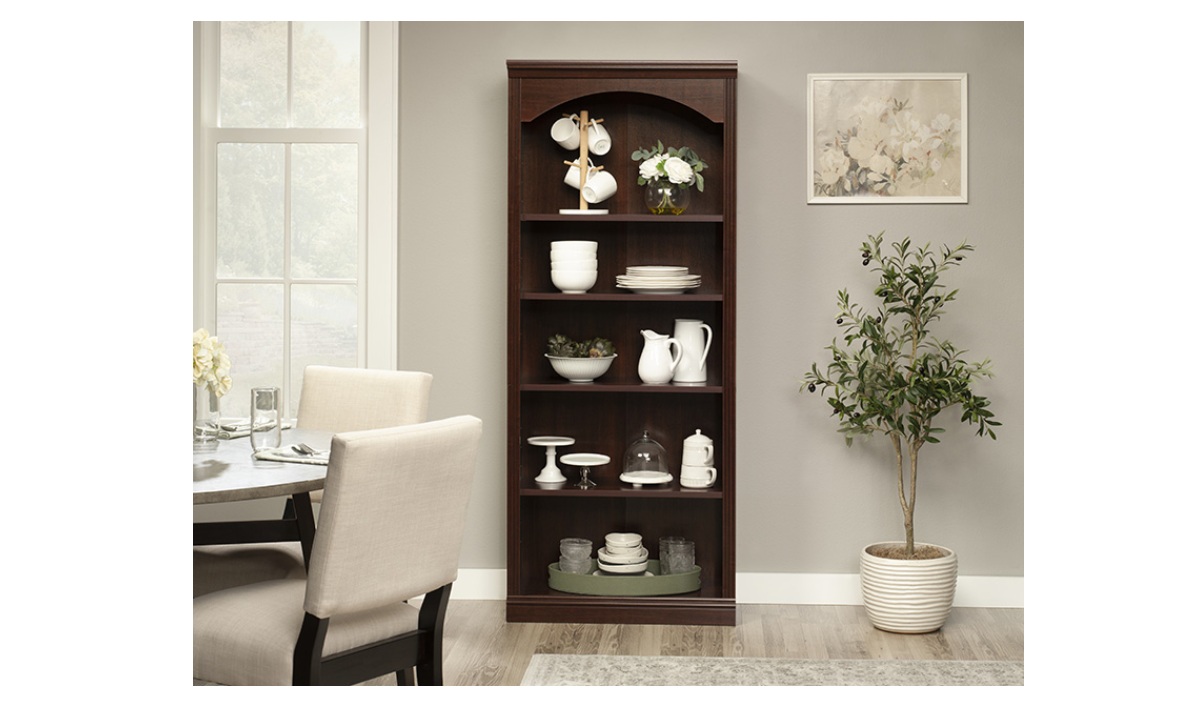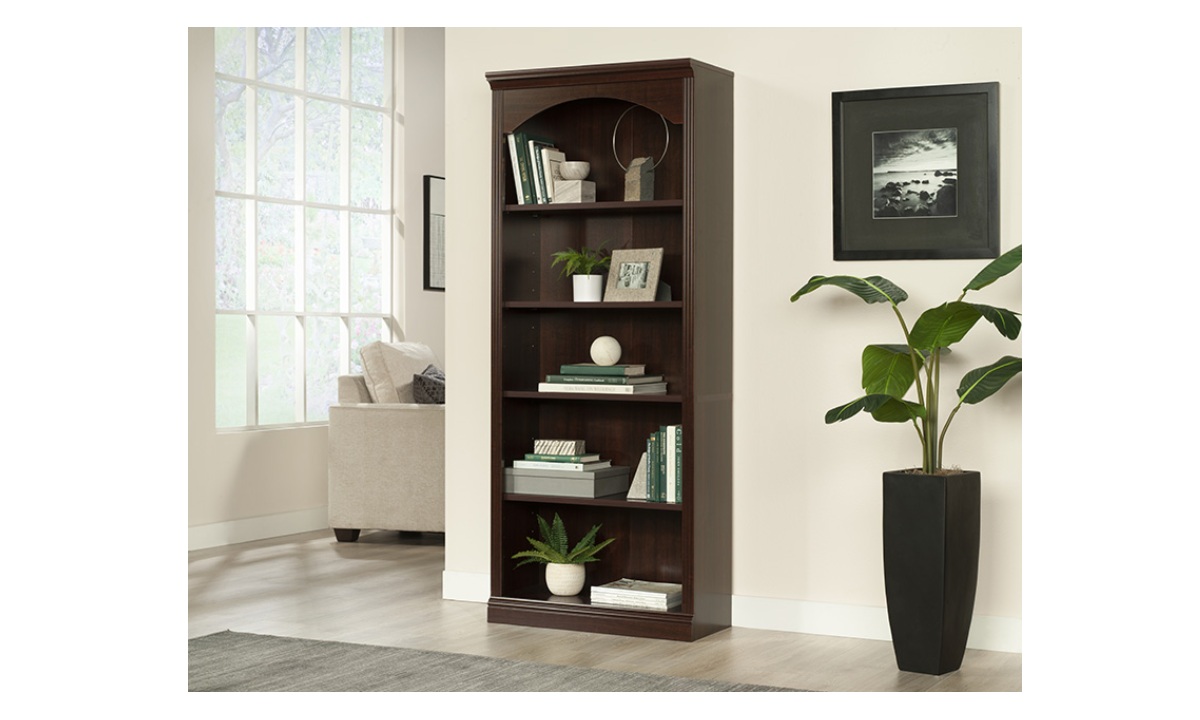 The 5-shelf bookcase from Sauder® finished in the timeless beauty of Select Cherry is designed to enhance the home with its sophisticated style and steadfast functionality. With three adjustable shelves, this engineered wood bookcase provides customizable storage of books, kitchen pantry items, craft supply surplus, bathroom essentials, and more. This display bookcase not only provides ample storage, but also illustrates that small design elements can make a big difference in interior style. The enclosed back panel of this living room bookcase hides unsightly cords ensuring a tidy appearance. This classically charming and versatile display bookcase is a must-have for any place from the living room to the home office, the bedroom, the utility room, or even the bathroom. This 5-shelf bookshelf offers the little details that go an extra mile for interior style, featuring simple yet elegant arch moldings, that will add a touch of classic charm to any room.