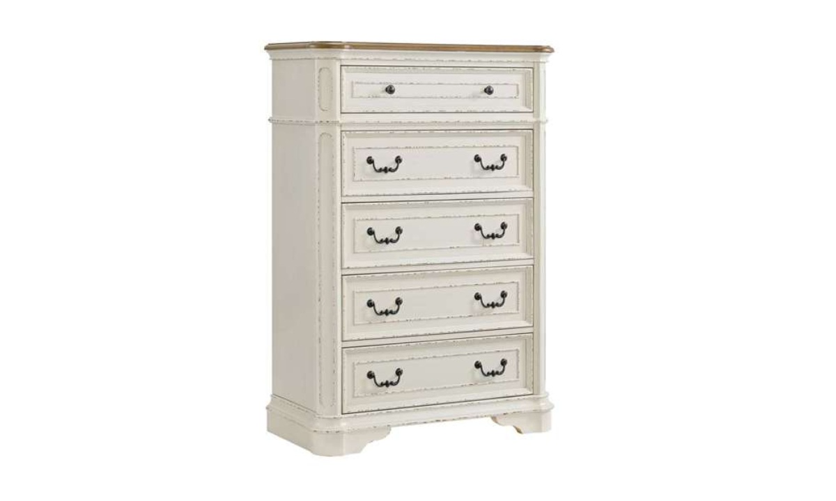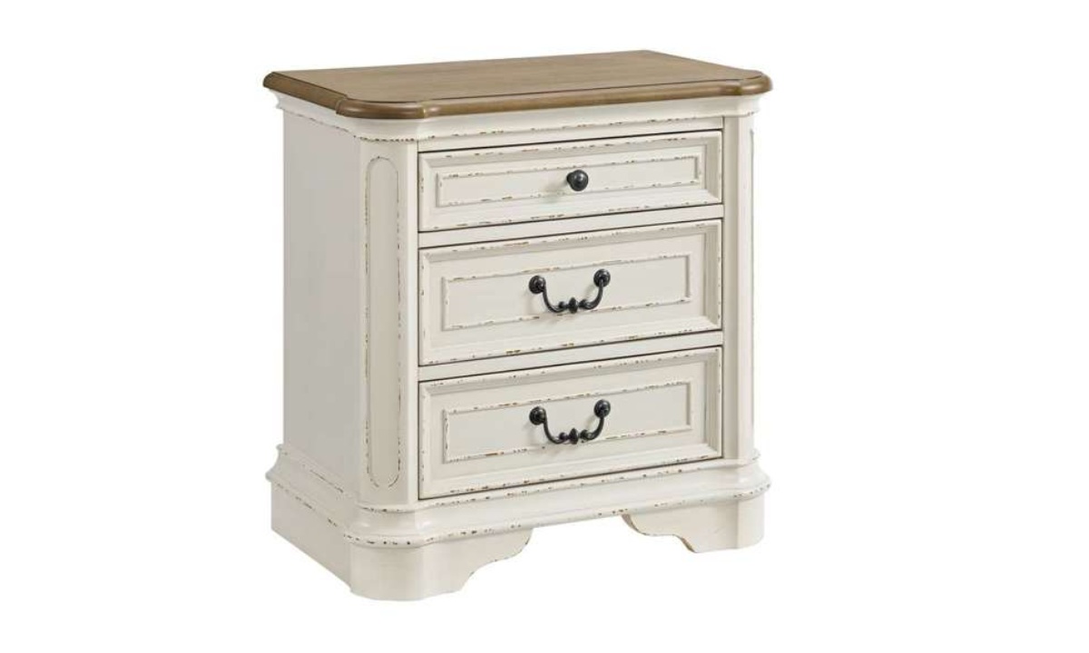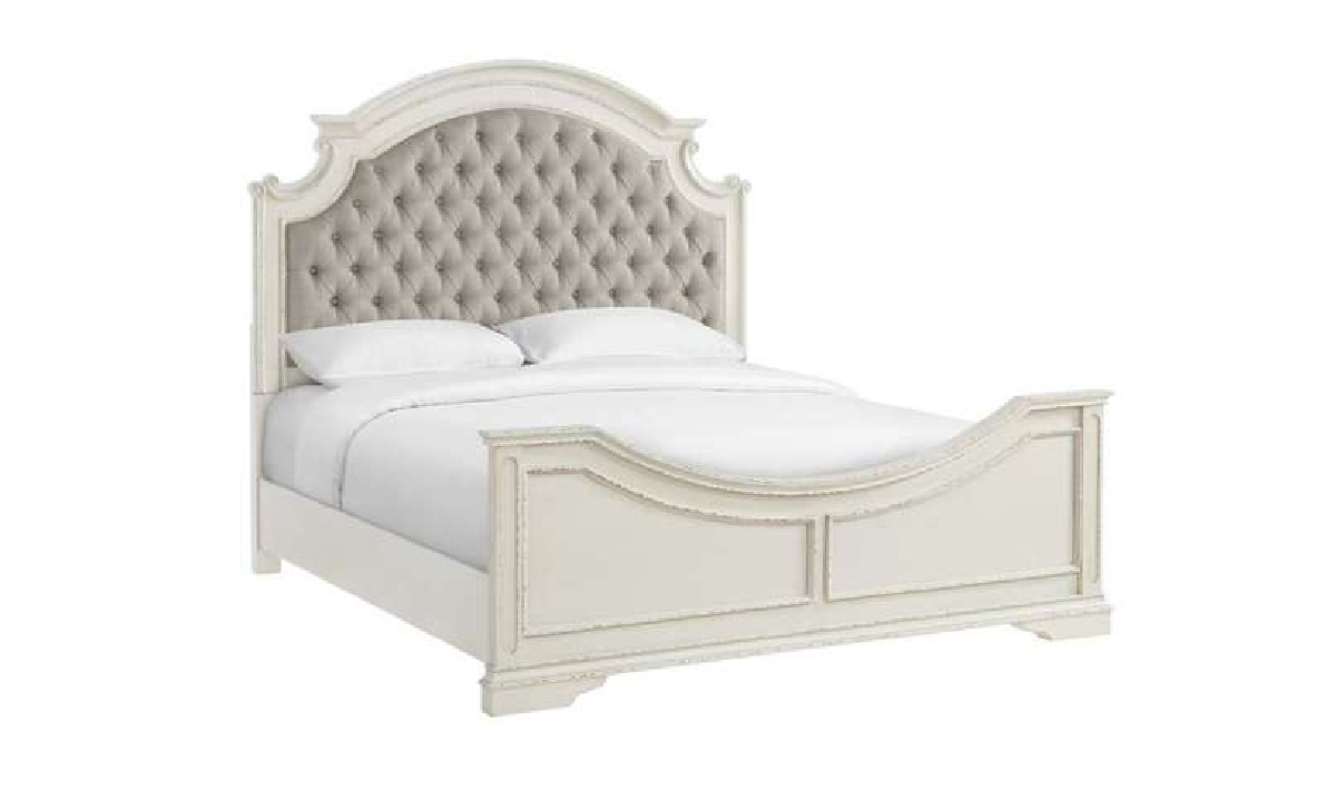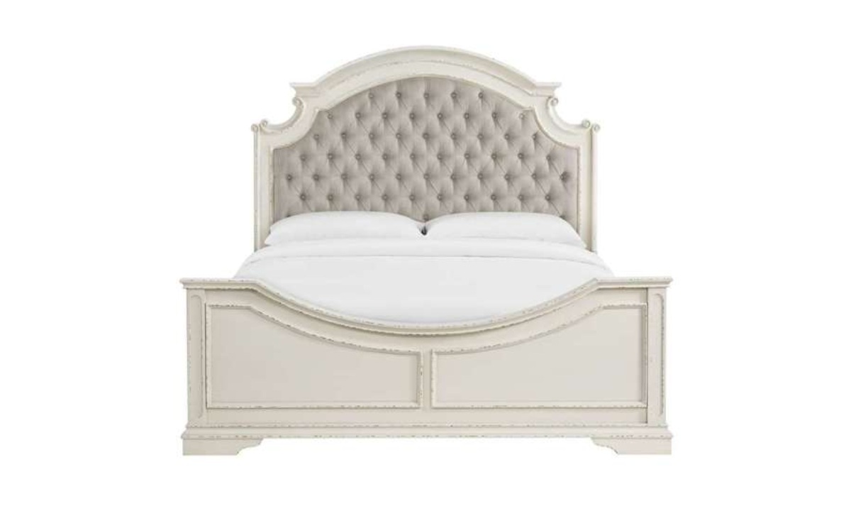 The Bellevue Bedroom set will look fantastic in your bedroom! The high profile headboard features an upholstered headboard , while the footboard has beautiful cutout details. Gorgeous Antique White colour and dark metal hardware to complement.  The top drawers of the dresser and chest are felt lined and have cedar bottom drawers.  The nightstand features a USB port, letting you keep your devices charged while you sleep. Chest sold separately.