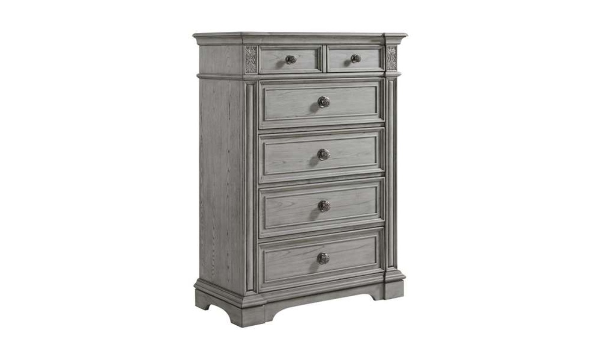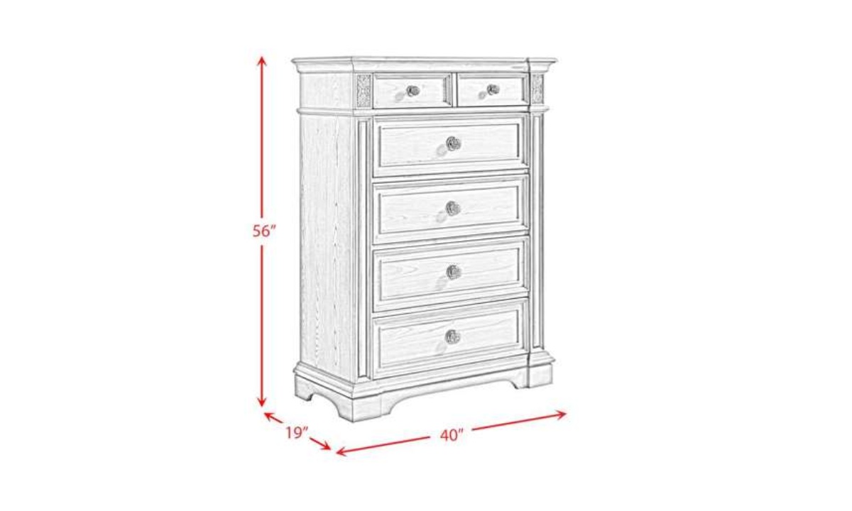 The Glenmore Chest offers the perfect blend of classic charm and modern functionality. Its five-drawer design provides ample storage, while the rich wood grain wire brushed finish adds a touch of rustic elegance. Crown molding and framed drawer panels enhance the traditional aesthetic, complemented by decorative knobs with intricate detailing. The raised pedestal feet ensure stability and style, making it a versatile addition to both traditional and transitional bedroom settings. The cedar-lined bottom drawers keep your belongings fresh. Elevate your bedroom with the timeless beauty of the Glenmore Chest.