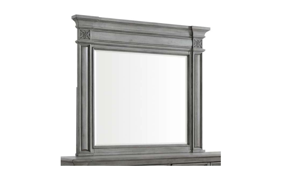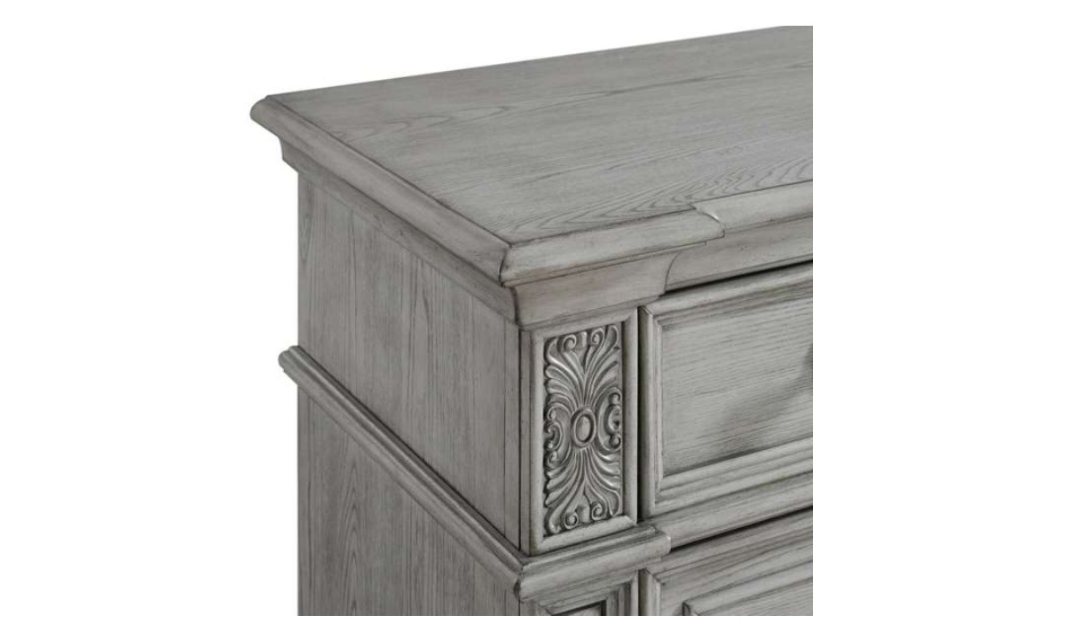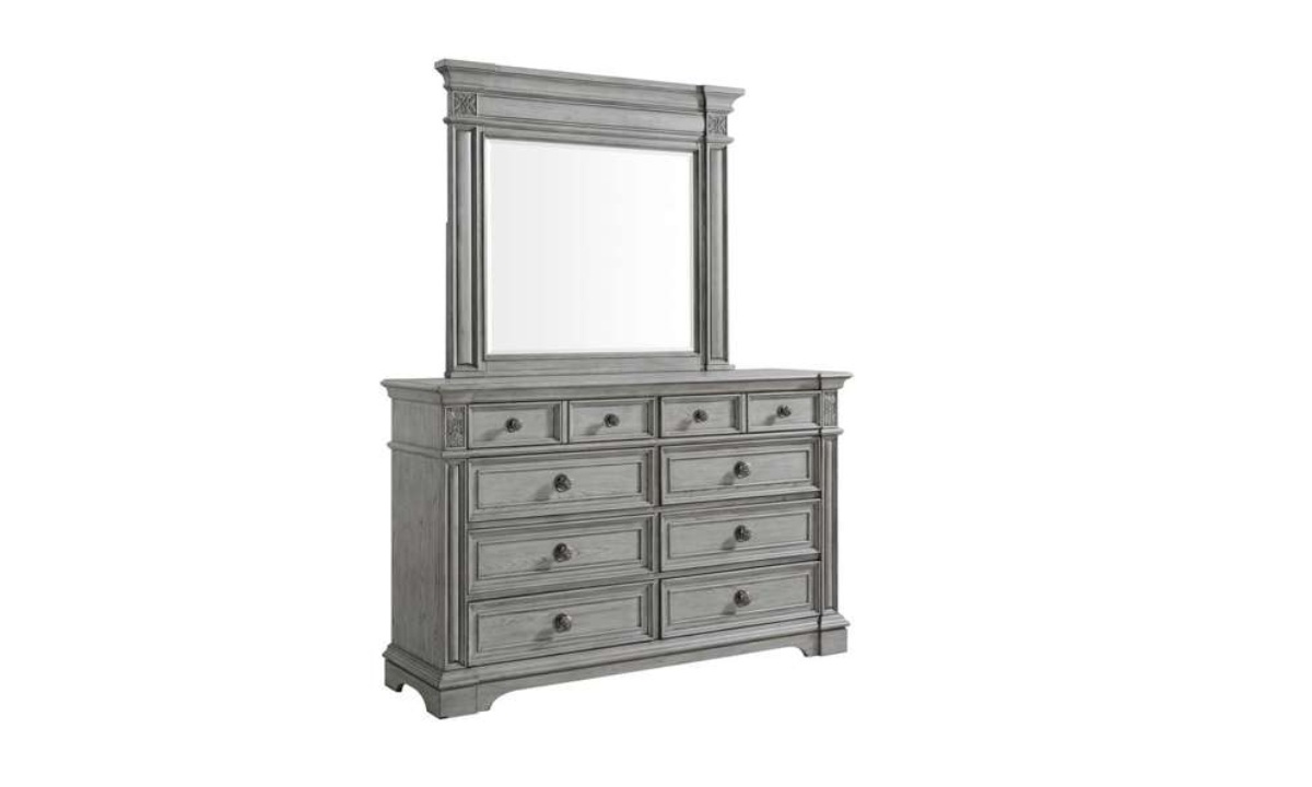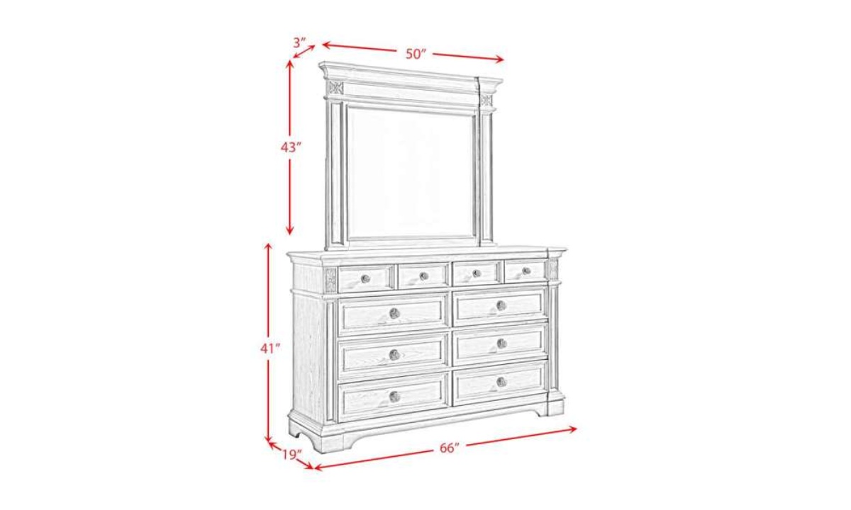 Elevate your bedroom with the timeless elegance of the Glenmore Dresser & Mirror Set. Featuring a classic nine-drawer design, this stunning piece offers ample storage space while exuding sophistication with its rich wood grain wire-brushed finish. The matching mirror, adorned with decorative carvings, adds height and elegance to the room, while crown molding and framed drawer panels provide exquisite classic detailing. Decorative knobs with intricate touches and raised pedestal feet offer both style and stability. With cedar-lined bottom drawers for freshness and protection, this set effortlessly complements both traditional and transitional bedroom settings, blending beauty with practicality.