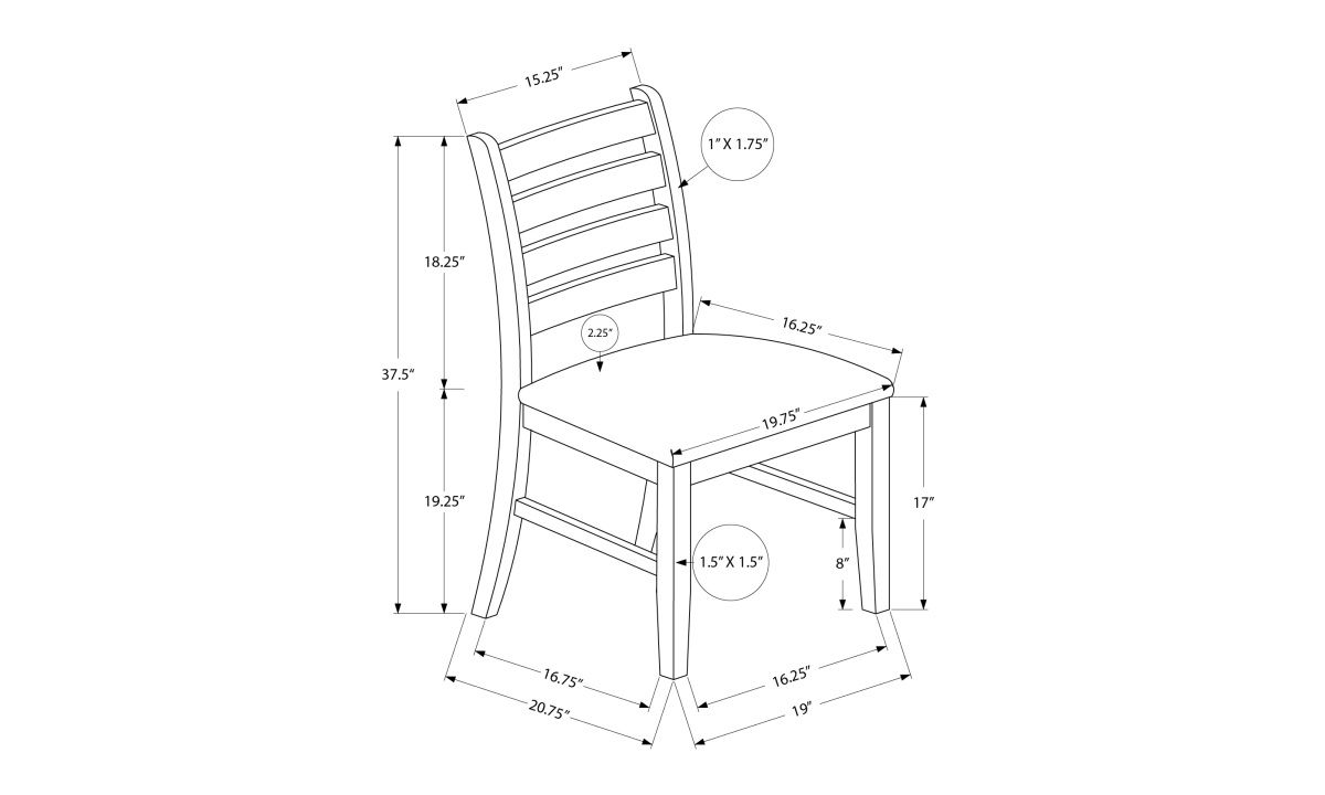Introducing the ultimate dining chair set for your casual family dining experience. This set of 2 dining chairs with a warm antique cherry finish and upholstered in brown fabric, is not only comfortable with foam cushioning, but the solid wood legs are durable with sturdy construction for long, lingering conversations at the dinner table. The ladder back design brings solid back support while adding a touch of fashionable style to your dining room or kitchen. With a 38″ height, these transitional style side chairs are the perfect addition for a chic dining table. Weight capacity 250lbs.