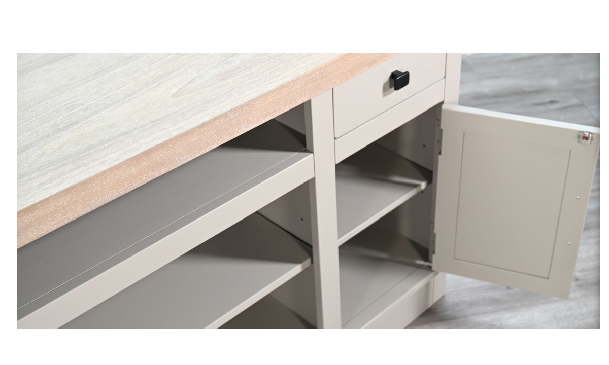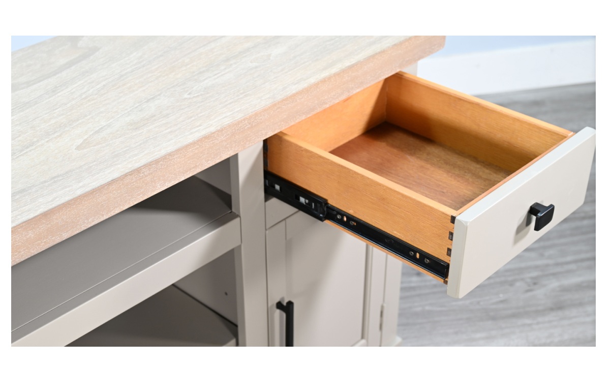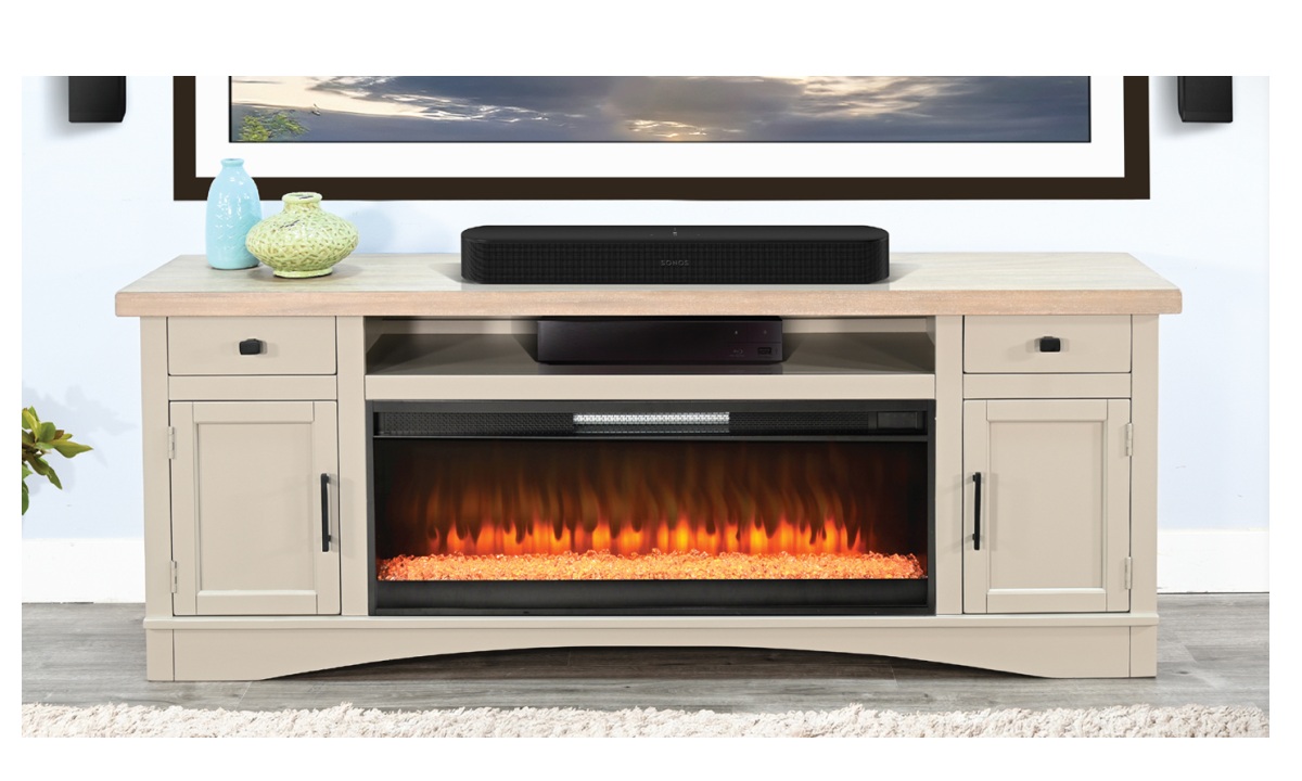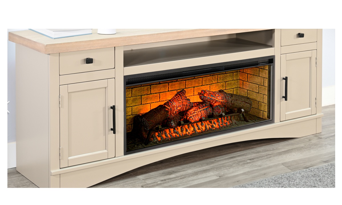 These media fireplaces will elevate your living space. This two-tone media console features a soft finish that is appealing and elegant with a contemporary feel. They are meticulously crafted from mindi solids and veneers. The elegant Wheat and Pavestone finish adds a touch of sophistication and style.