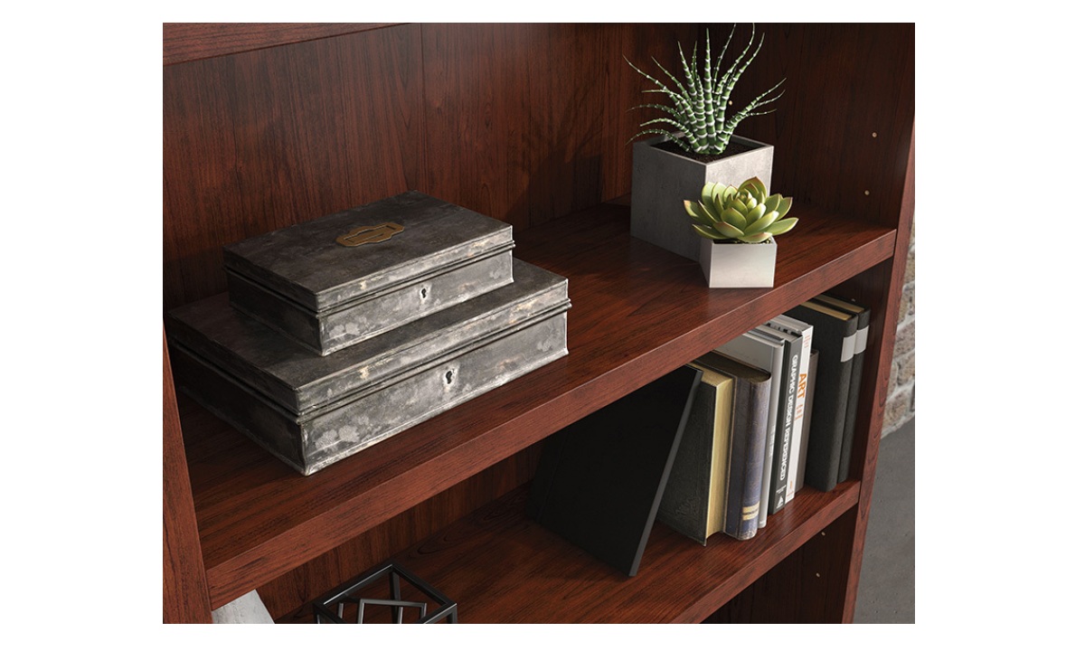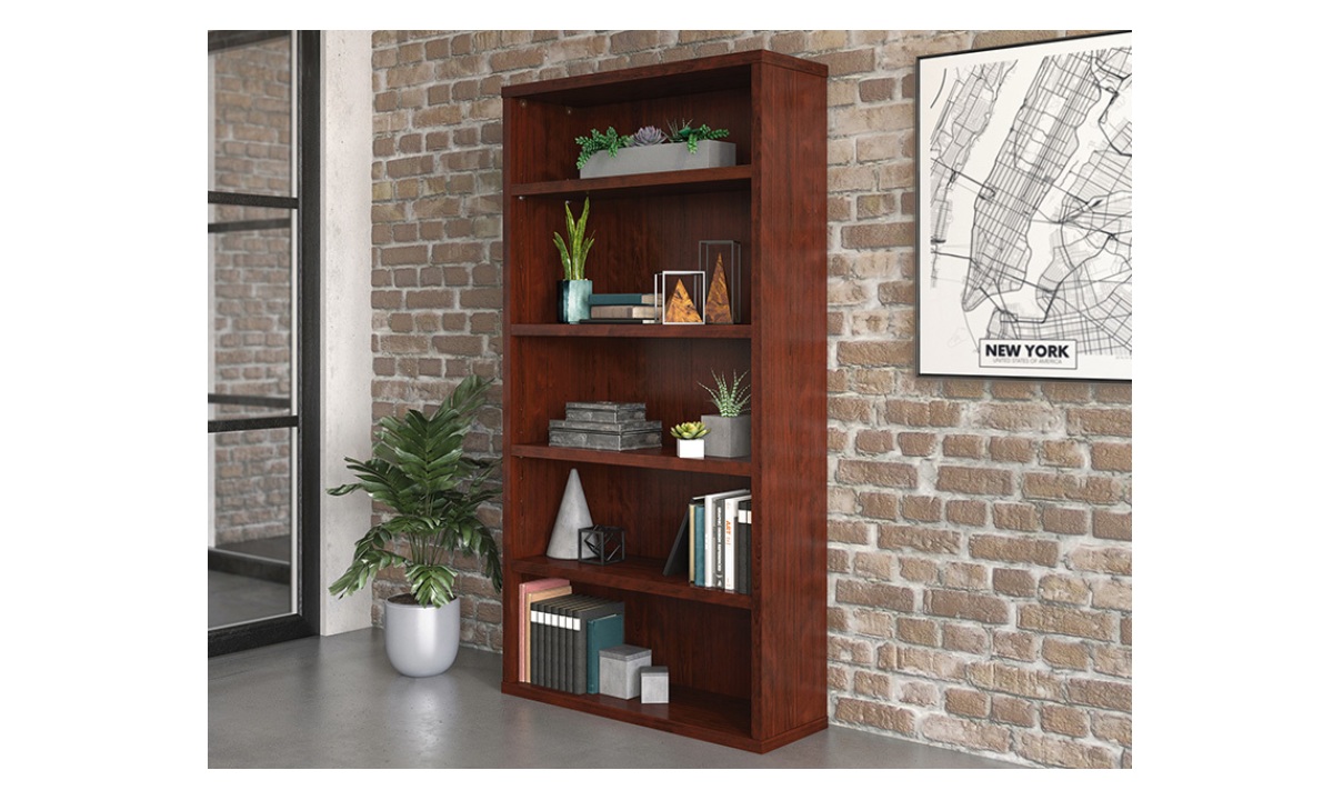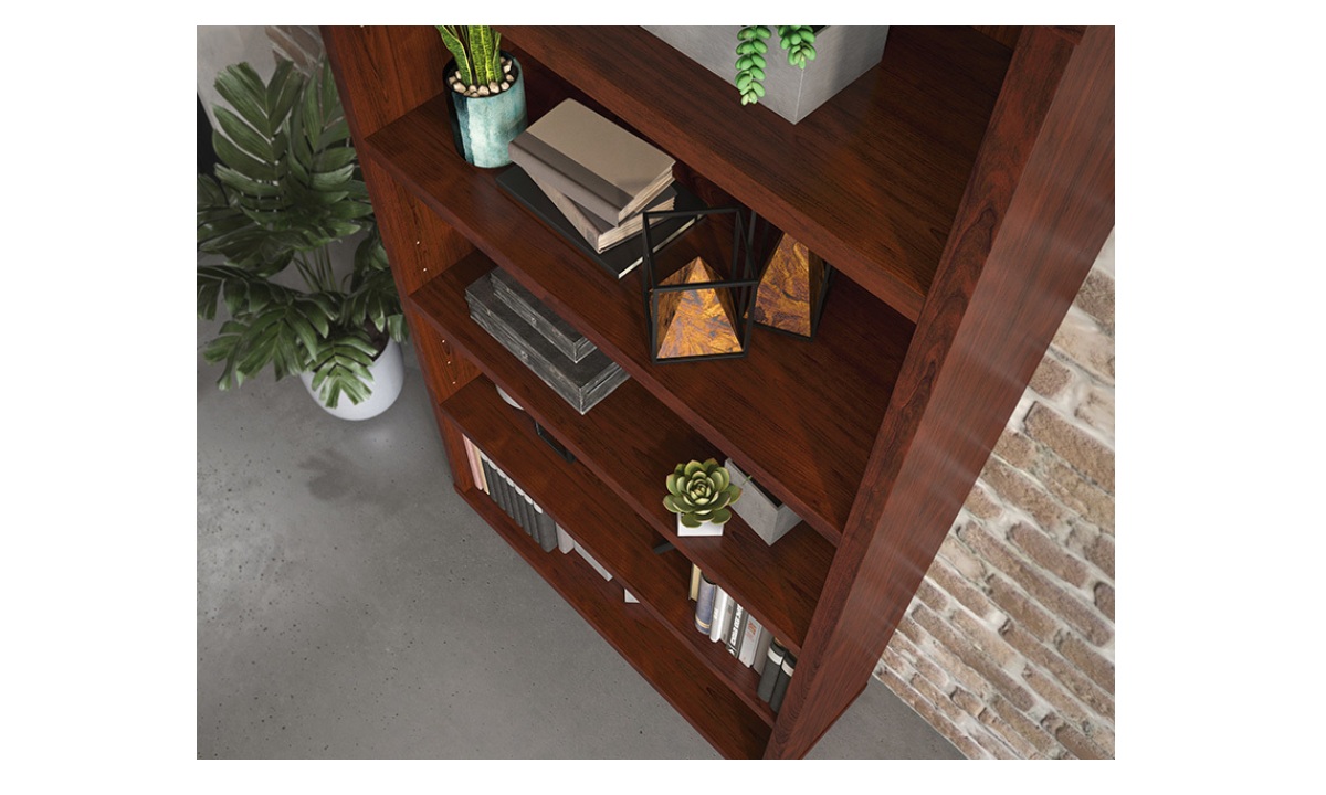 Sooner or later, you find yourself with piles of binders or books scattered around your office in a maze-like fashion. The 5-shelf bookcase from the Affirm™ collection is here to deconstruct the labyrinth of paper and return your office to its former glory. Office shelving units should offer durability without weighing a ton: This commercial bookcase is designed with a strong but lightweight 1 ¼” panel construction—making it strong enough to hold your endless array of files, books, or even home décor, without being too heavy to move or rearrange when needed. This commercial office storage unit includes three adjustable shelves that offer flexible storage options to accommodate items of various heights. Finished in a Classic Cherry, this office storage furniture restores your office space to an organized, calming space, ripe with productive energy.