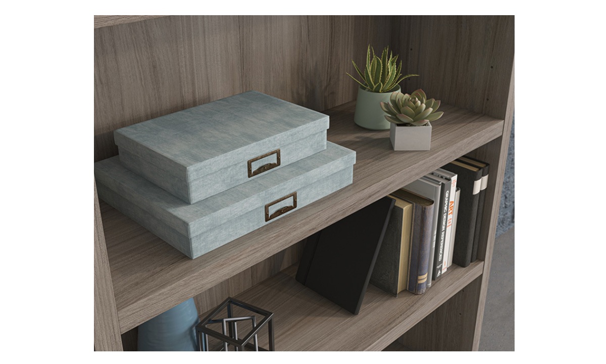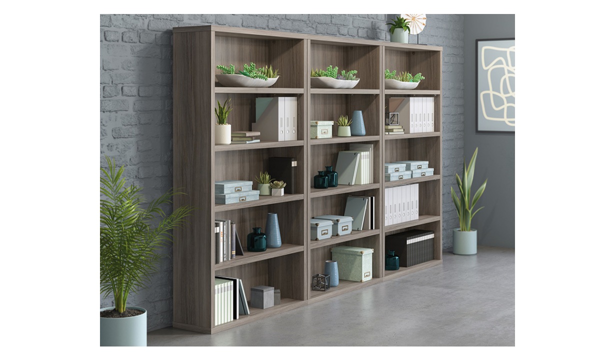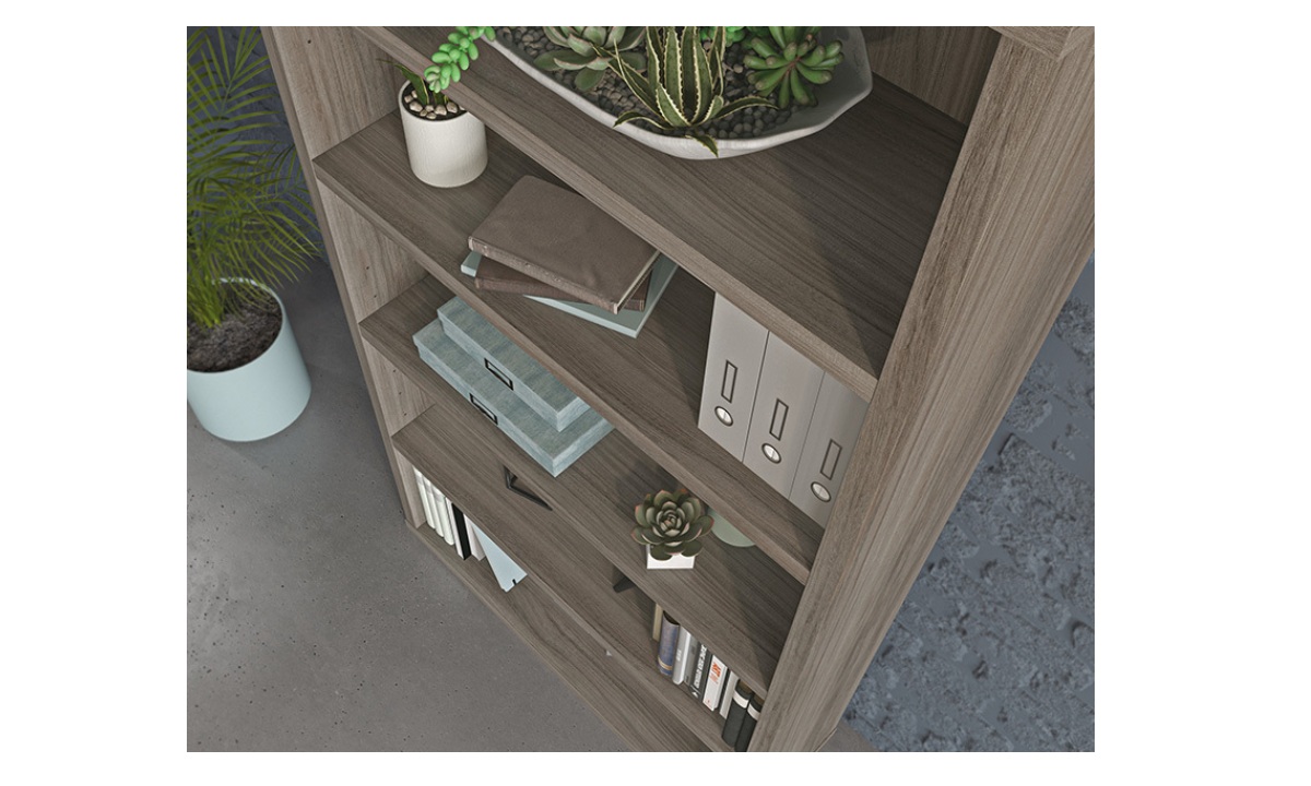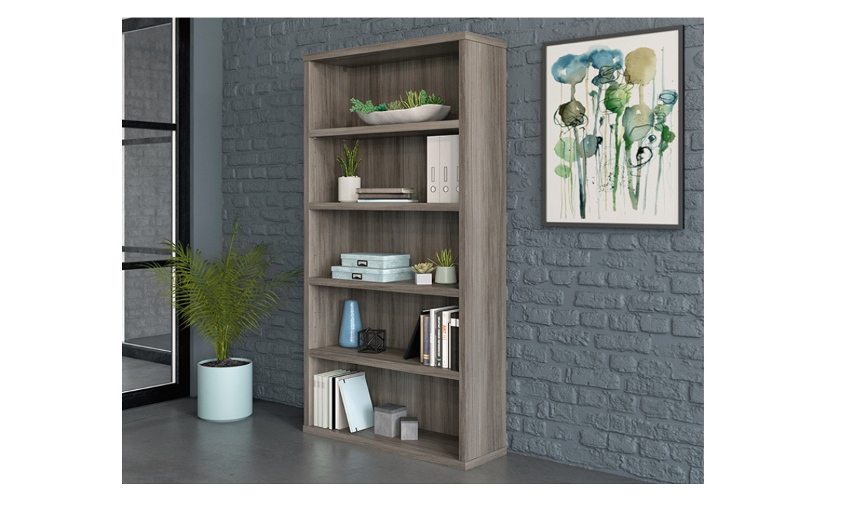 Sooner or later, you find yourself with piles of binders or books scattered around your office in a maze-like fashion. The 5-shelf bookcase from the Affirm™ collection is here to deconstruct the labyrinth of paper and return your office to its former glory. Office shelving units should offer durability without weighing a ton: This commercial bookcase is designed with a strong but lightweight 1 ¼” panel construction—making it strong enough to hold your endless array of files, books, or even home décor, without being too heavy to move or rearrange when needed. This commercial office storage unit includes three adjustable shelves that offer flexible storage options to accommodate items of various heights. Finished in a Hudson Elm, this office storage furniture restores your office space to an organized, calming space, ripe with productive energy.