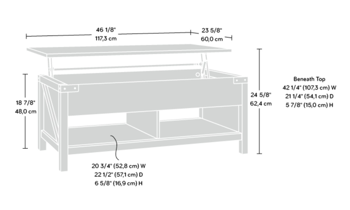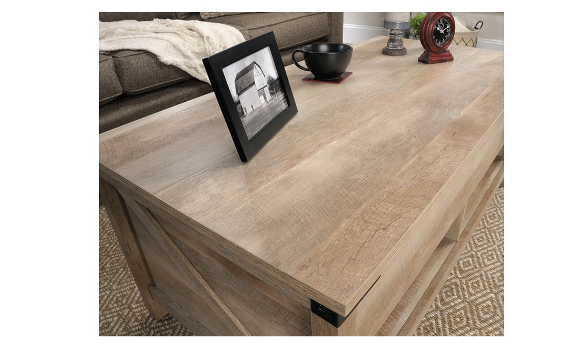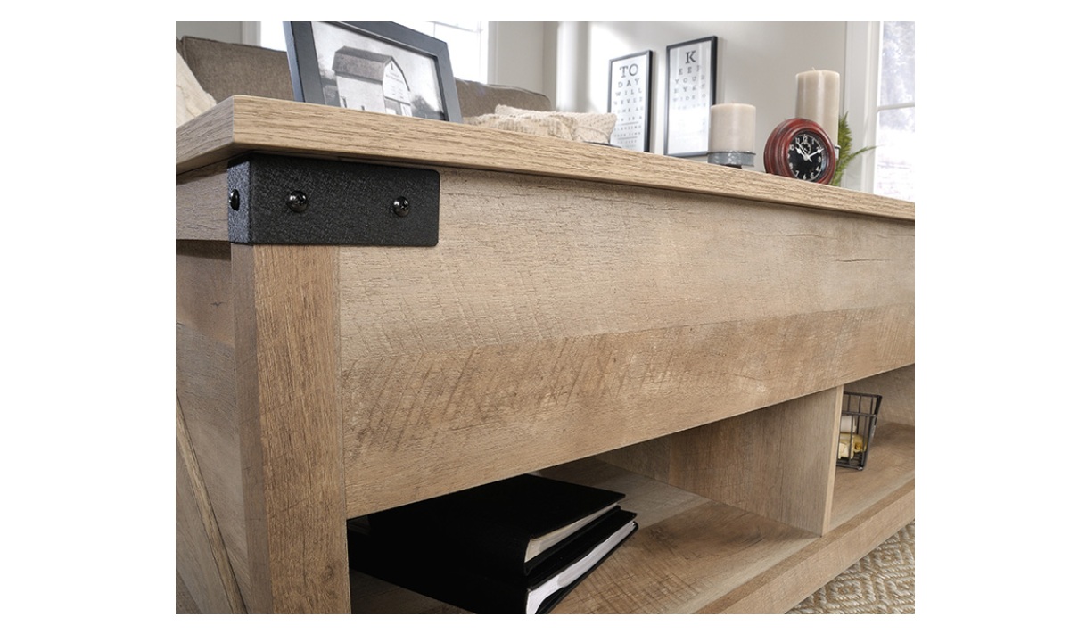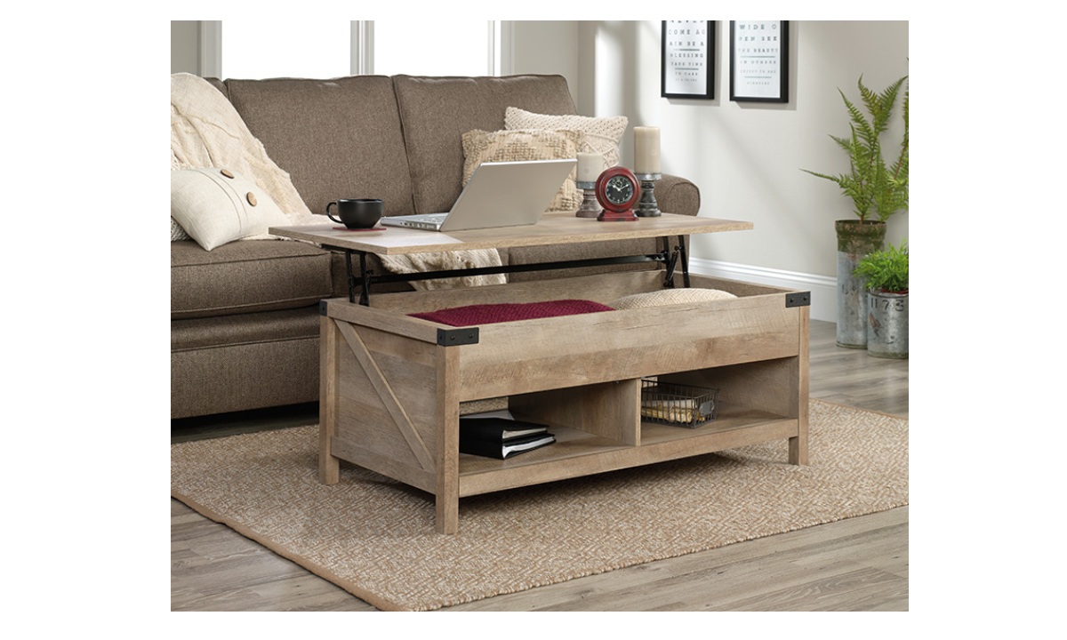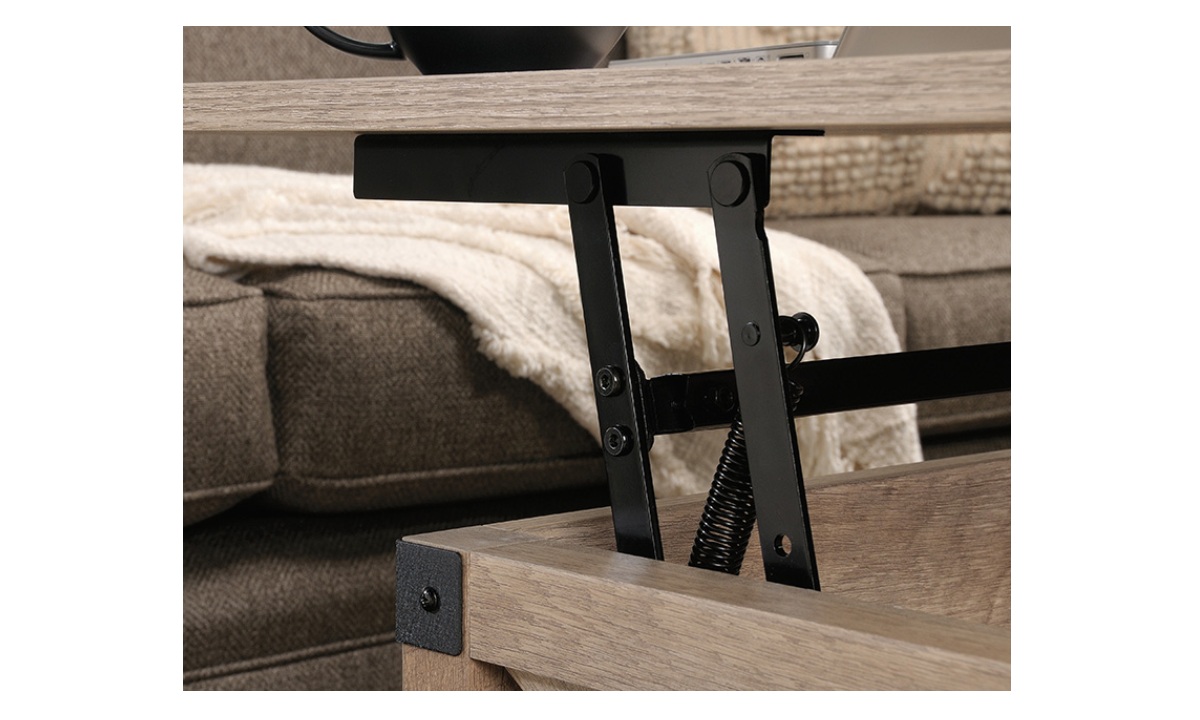 Create a warm centerpiece to any living room or den with the farmhouse style of this lift-top coffee table from the Bridge Acre™ collection. This wood lift-top coffee table features a spacious top surface that lifts up and toward you to create a multipurpose space in your living room. With this pop-up coffee table, you can work from your laptop or enjoy a delicious dinner– all while relaxing from the seat of your own couch. Beneath the lift-top of this farmhouse coffee table is a hidden storage area that is perfect for storing books, remotes, and blankets. The lower open shelf provides you with additional storage space for items like magazines, organizing bins, and extra candles. This wood top coffee table is finished on all sides for versatile placement throughout your home and looks polished from any angle. Finished in Lintel Oak® and detailed with attractive hardware, this coffee table with lift-top is sure to stand out in your home.
