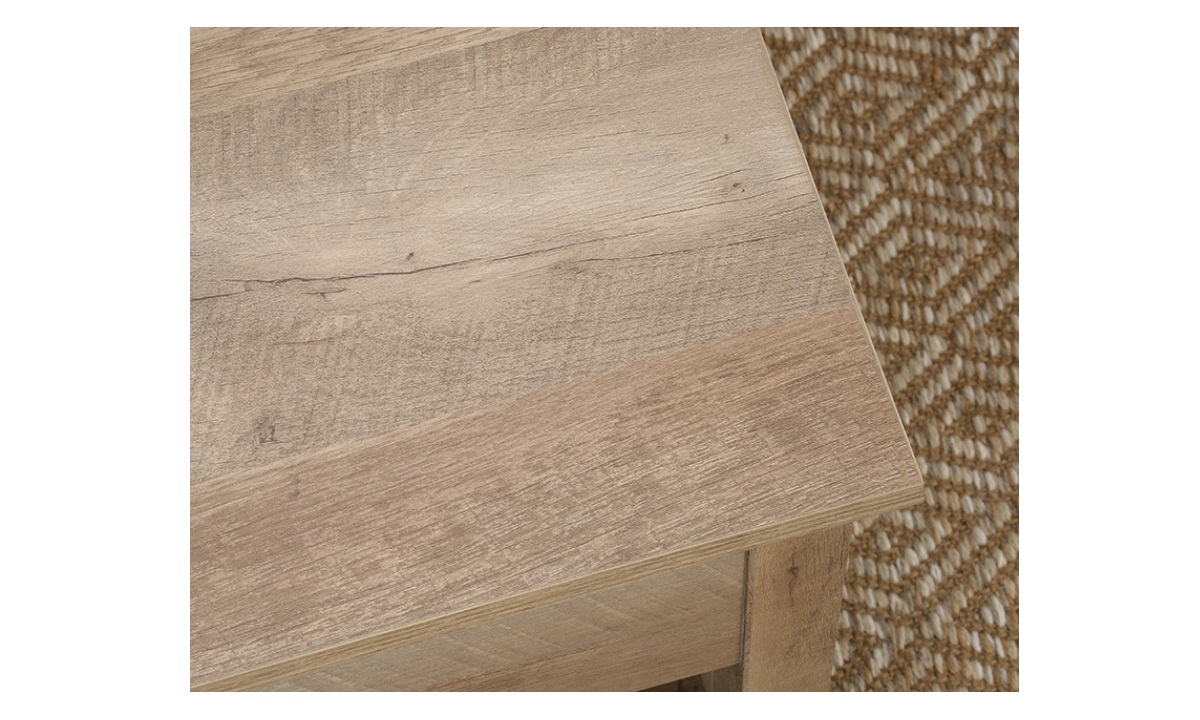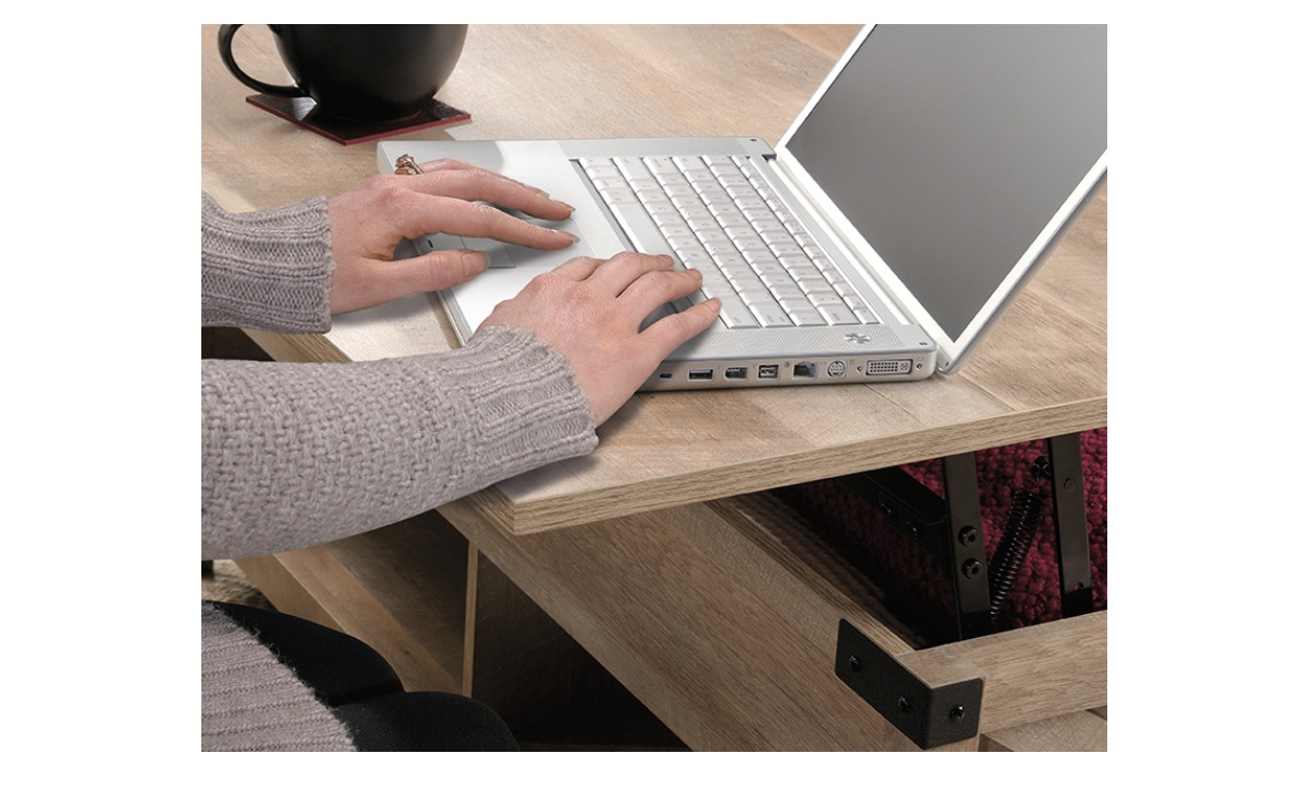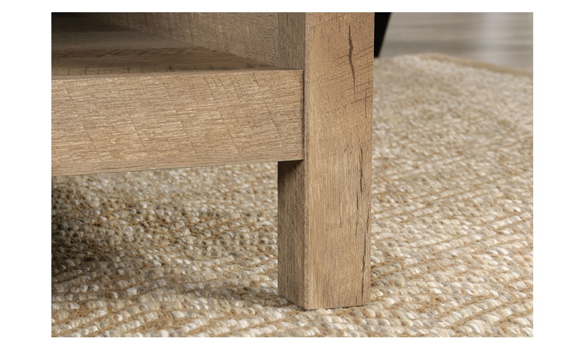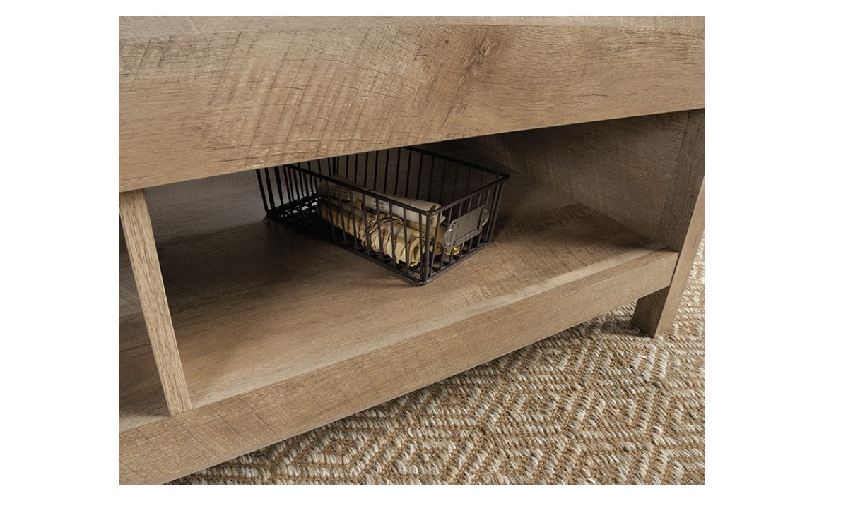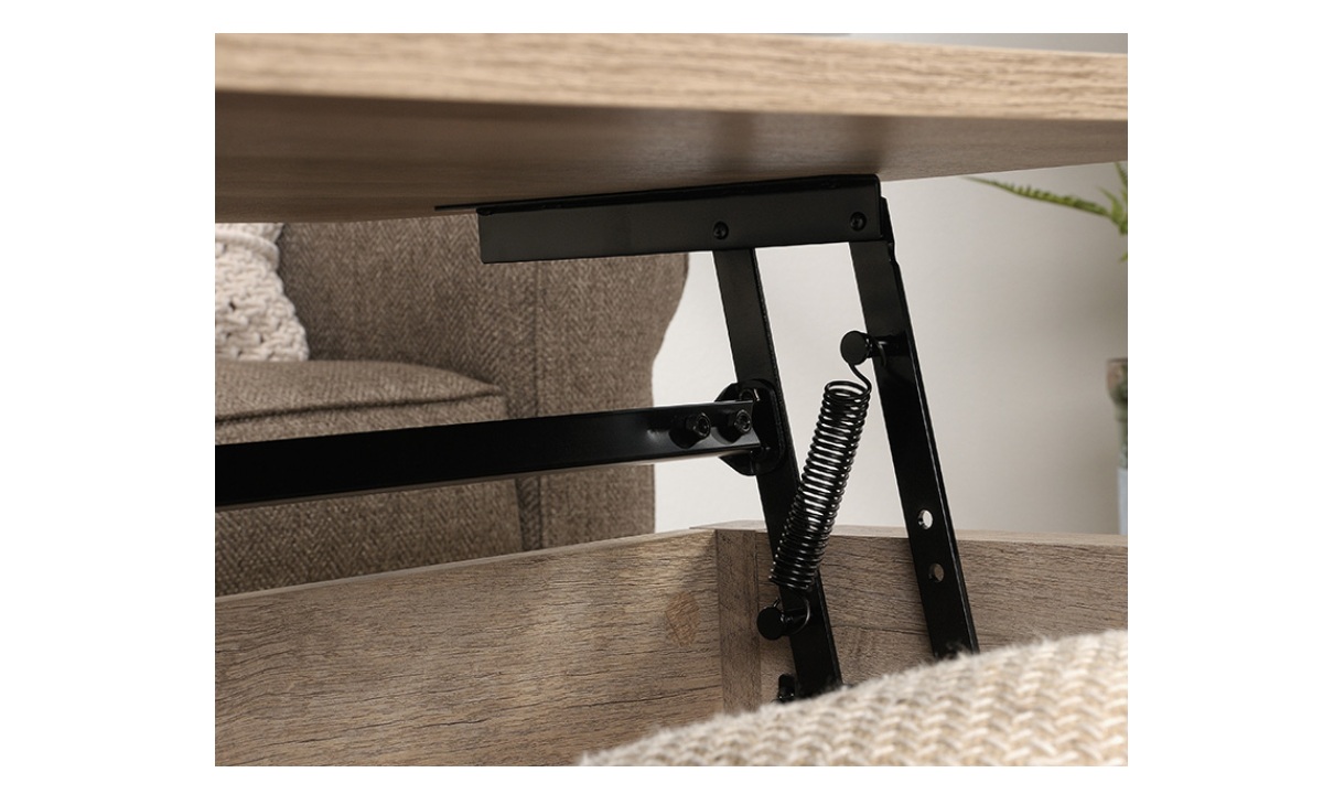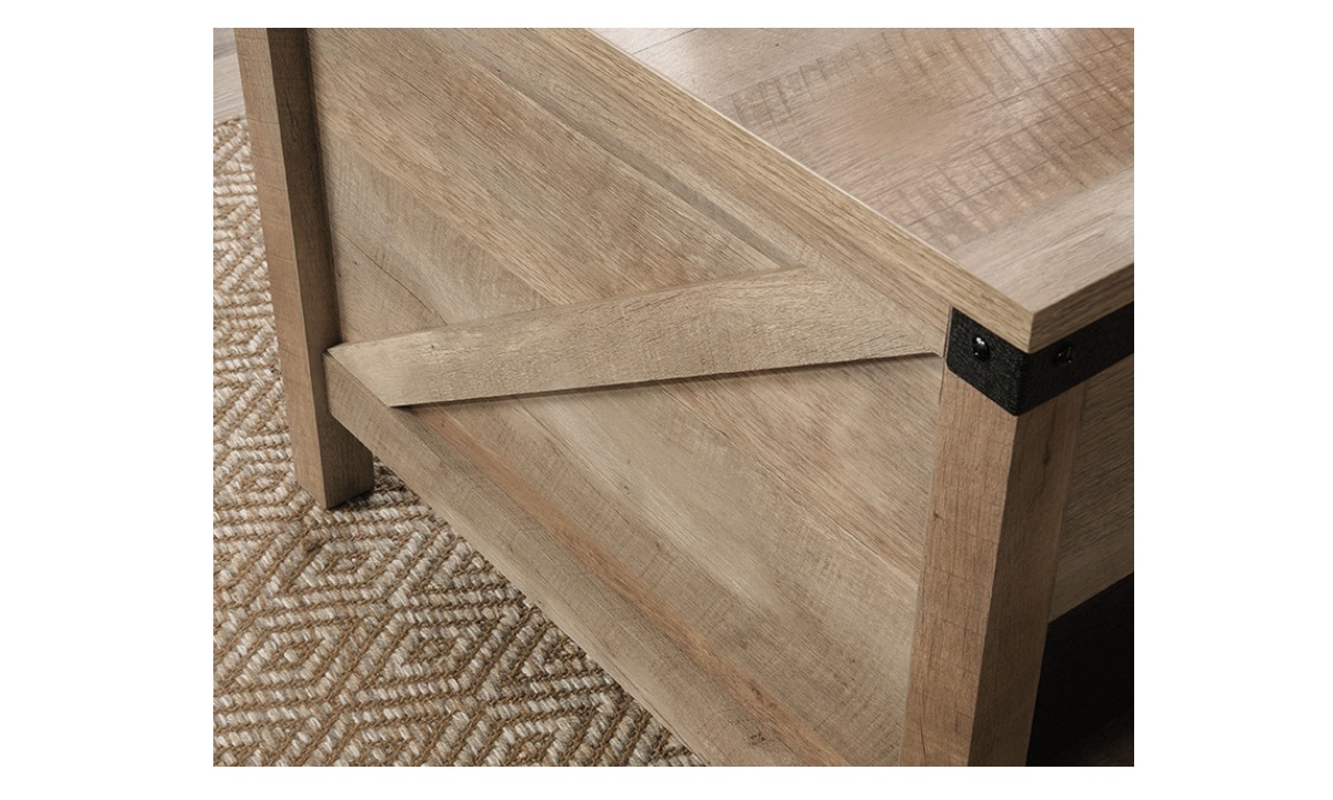 Create a warm centerpiece to any living room or den with the farmhouse style of this lift-top coffee table from the Bridge Acre™ collection. This wood lift-top coffee table features a spacious top surface that lifts up and toward you to create a multipurpose space in your living room. With this pop-up coffee table, you can work from your laptop or enjoy a delicious dinner– all while relaxing from the seat of your own couch. Beneath the lift-top of this farmhouse coffee table is a hidden storage area that is perfect for storing books, remotes, and blankets. The lower open shelf provides you with additional storage space for items like magazines, organizing bins, and extra candles. This wood top coffee table is finished on all sides for versatile placement throughout your home and looks polished from any angle. Finished in Lintel Oak® and detailed with attractive hardware, this coffee table with lift-top is sure to stand out in your home.