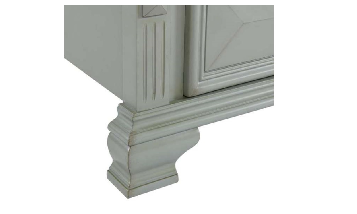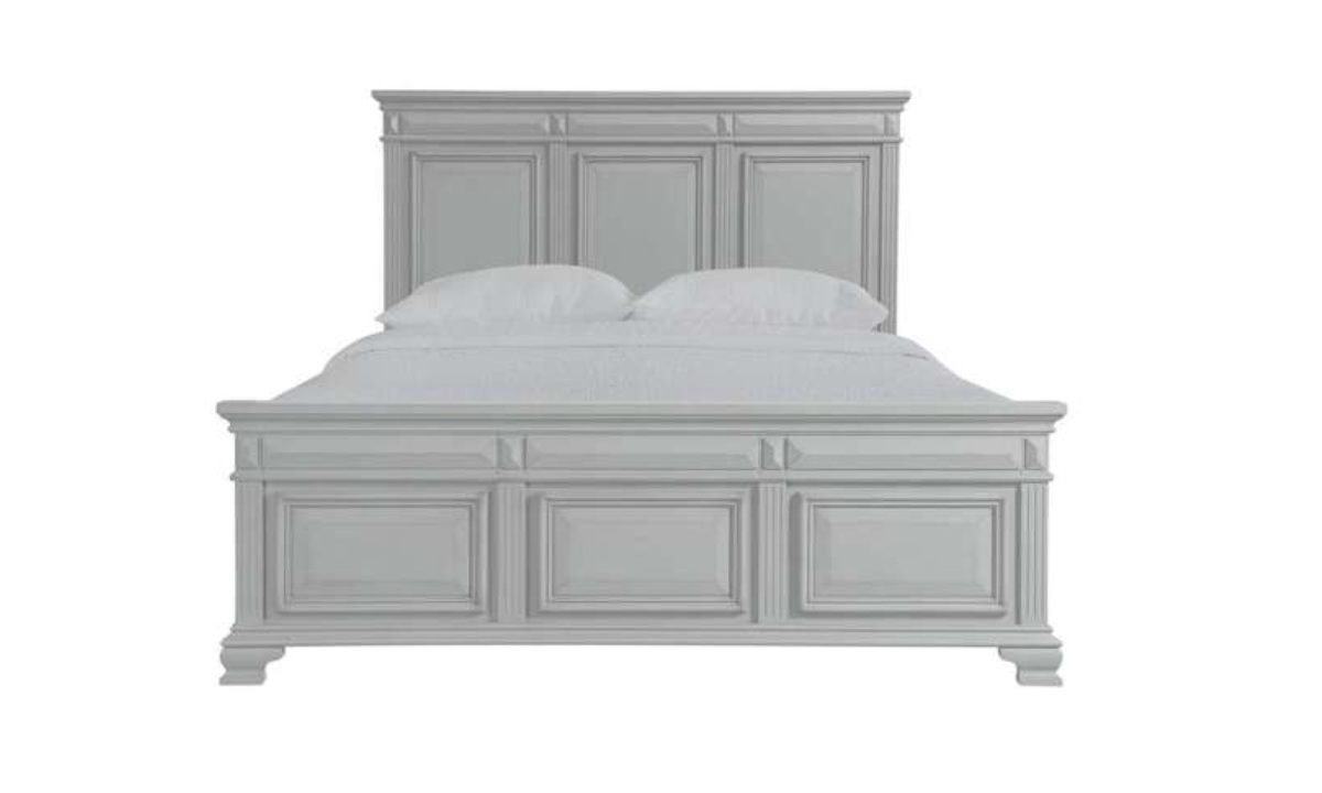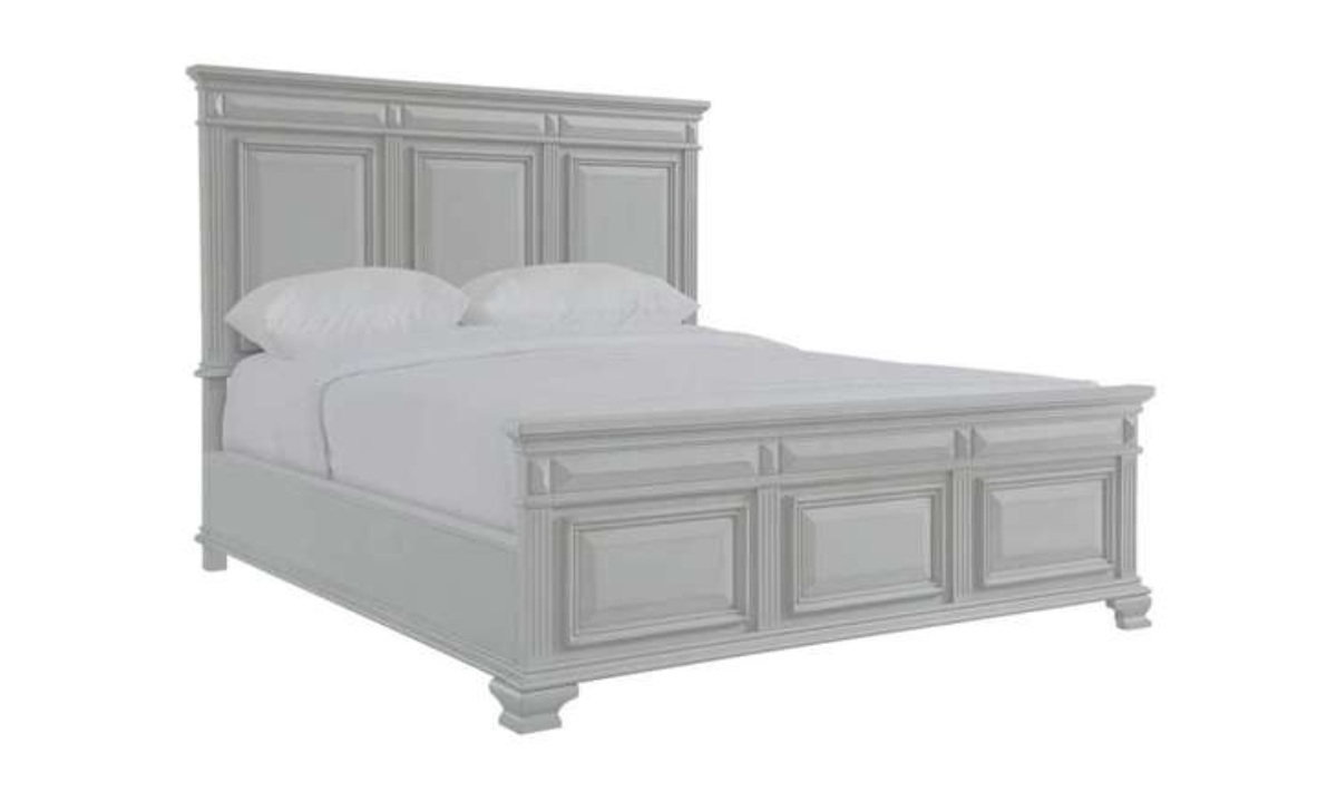 The Calloway King Panel Bed is the perfect addition to your bedroom! This panel bed features a high profile headboard, adding a little extra drama to your bedroom. Both the headboard and footboard feature a tri-panel design, making this bed a standout for years to come. Bevel edges are prevalent throughout, adding a classic touch to this transitional bed. Bracket feet combined with the grey finish will make this panel bed a staple in your home year after year.