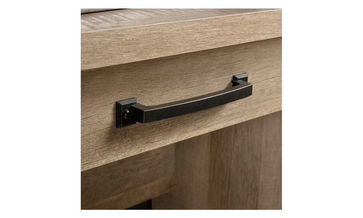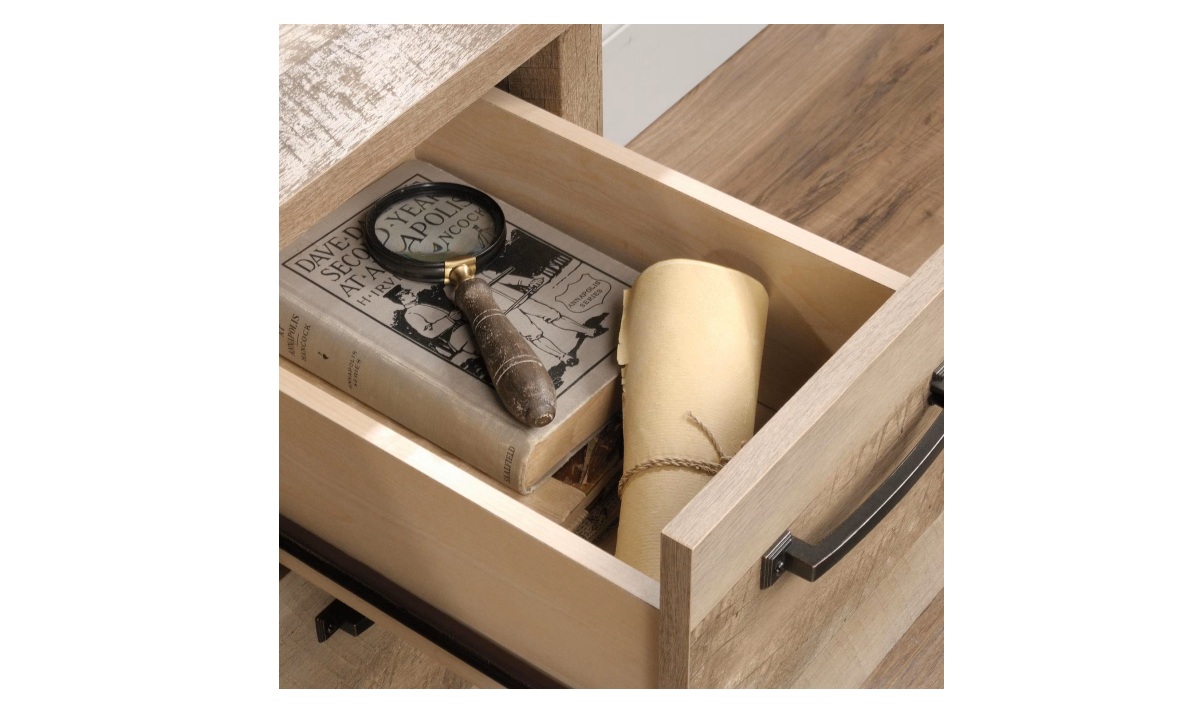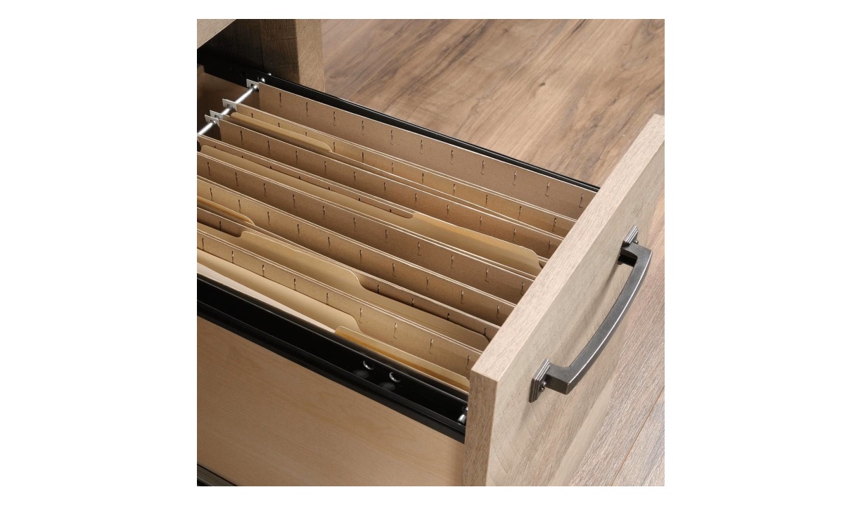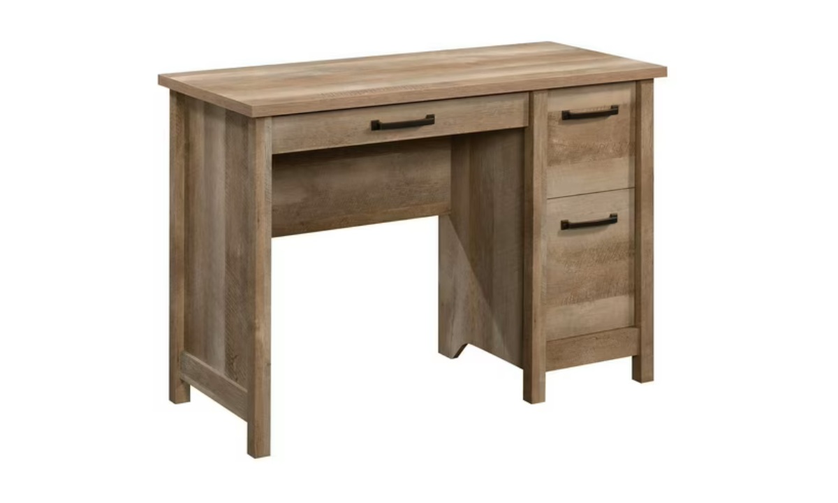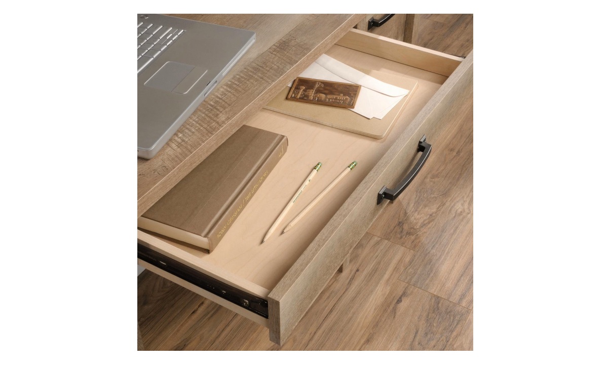 Updating the style of your home office space has never been easier. Add a touch of rustic-inspired design and beauty to your home with this desk from the Cannery Bridge collection. This home office desk offers a spacious top surface that provides you with the room you need for various items like your laptop, an accent lamp, stacks of notepads and your hot cup of coffee. The pencil drawer and small storage drawer both open and close on smooth metal runners for easy access storage of items like folders, envelopes and other miscellaneous supplies. The lower drawer with full extension slides can hold letter-size hanging files for increased organization options. It’s versatile design and charming good looks make this writing desk a great addition to any room in your home. Finished in Lintel Oak and detailed with attractive hardware, this handsome desk will have you motivated and ready to tackle all your projects.