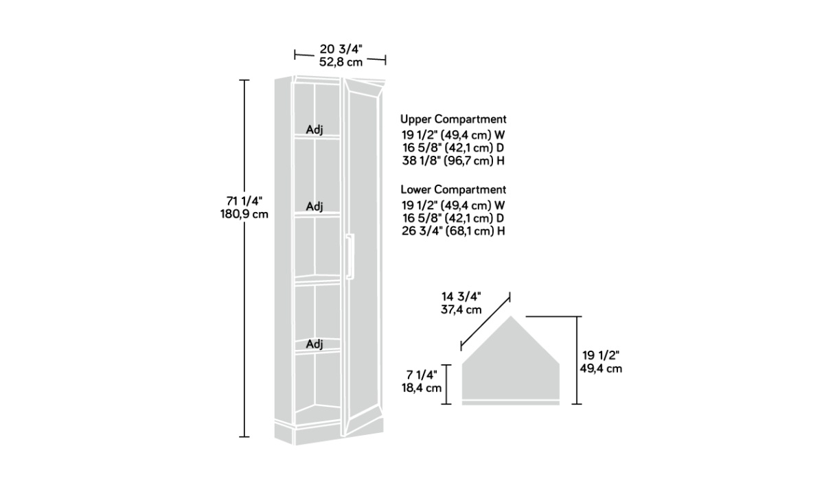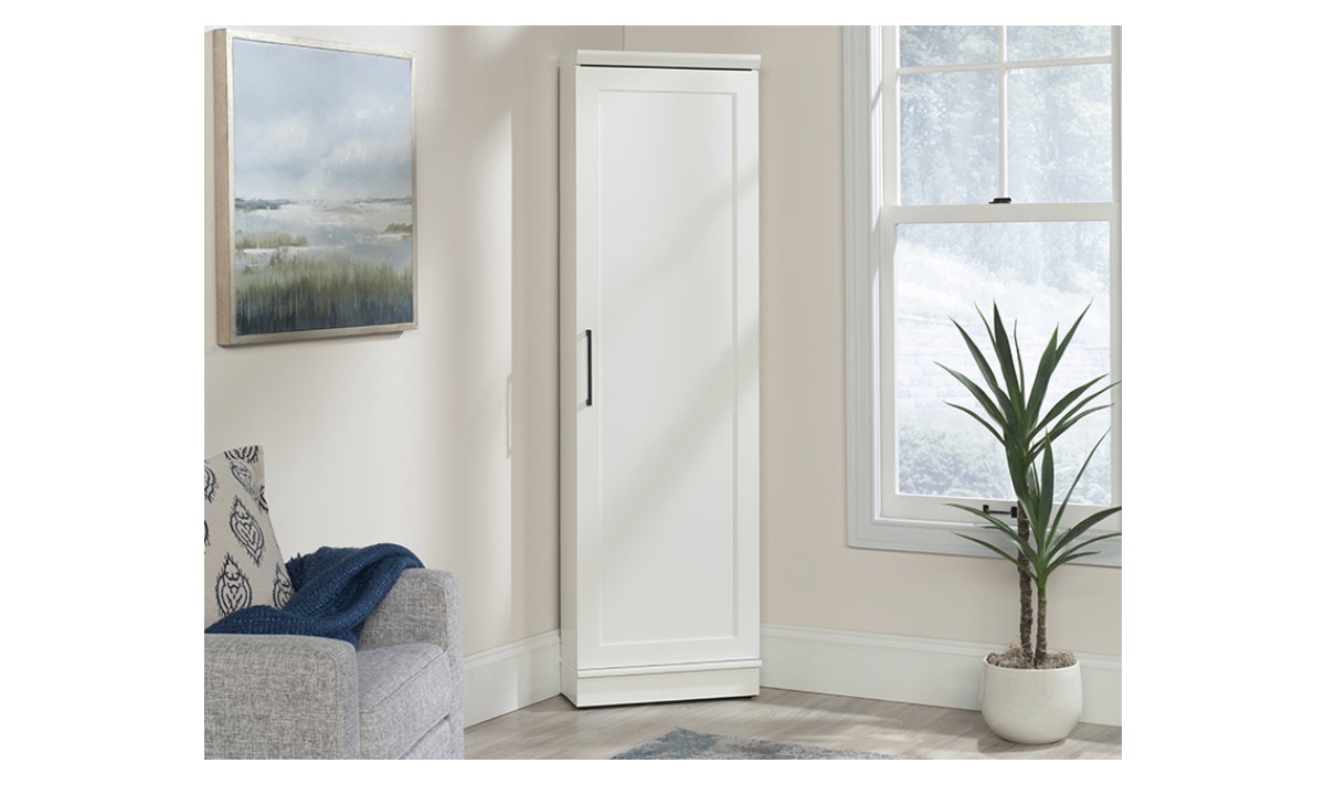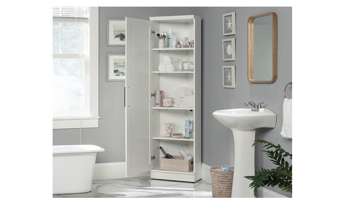 Storage doesn’t need to be the focal point of the room. Maximize space in rooms large or small with the stylish corner storage cabinet from the HomePlus collection. Designed to bring easy function with a space-saving, corner-cut configuration to any living space, this 5-shelf corner cabinet will seamlessly blend into any décor a laundry room, or crafting space, while providing versatile storage options. This reversible door cabinet has three adjustable shelves providing a customizable storage space to suit a variety of needs, whether for office supplies, pantry staples, or bathroom essentials. A fixed middle and bottom shelf provide additional space for sturdy, reliable storage in a bedroom as well. The reversible door design of this adjustable shelf cabinet offers adaptability, allowing it to open either the left or the right side, depending on the available space. The adjustable levelers of this white storage cabinet provide confidence that it will remain stable even on uneven flooring. Finished in Soft White®, this corner cabinet will enhance any home organization with a transitional style and practical storage solution.
