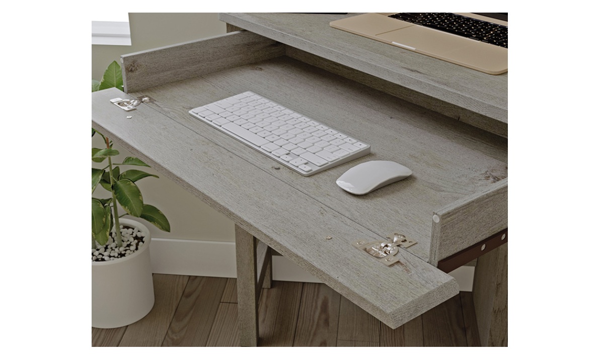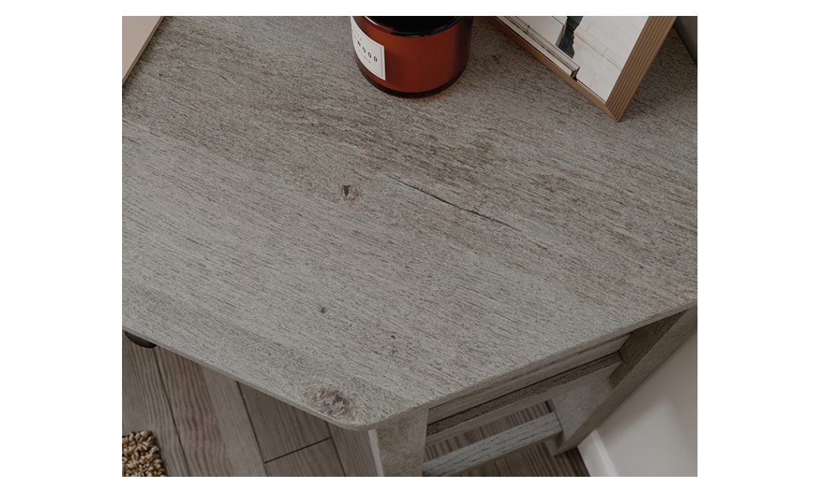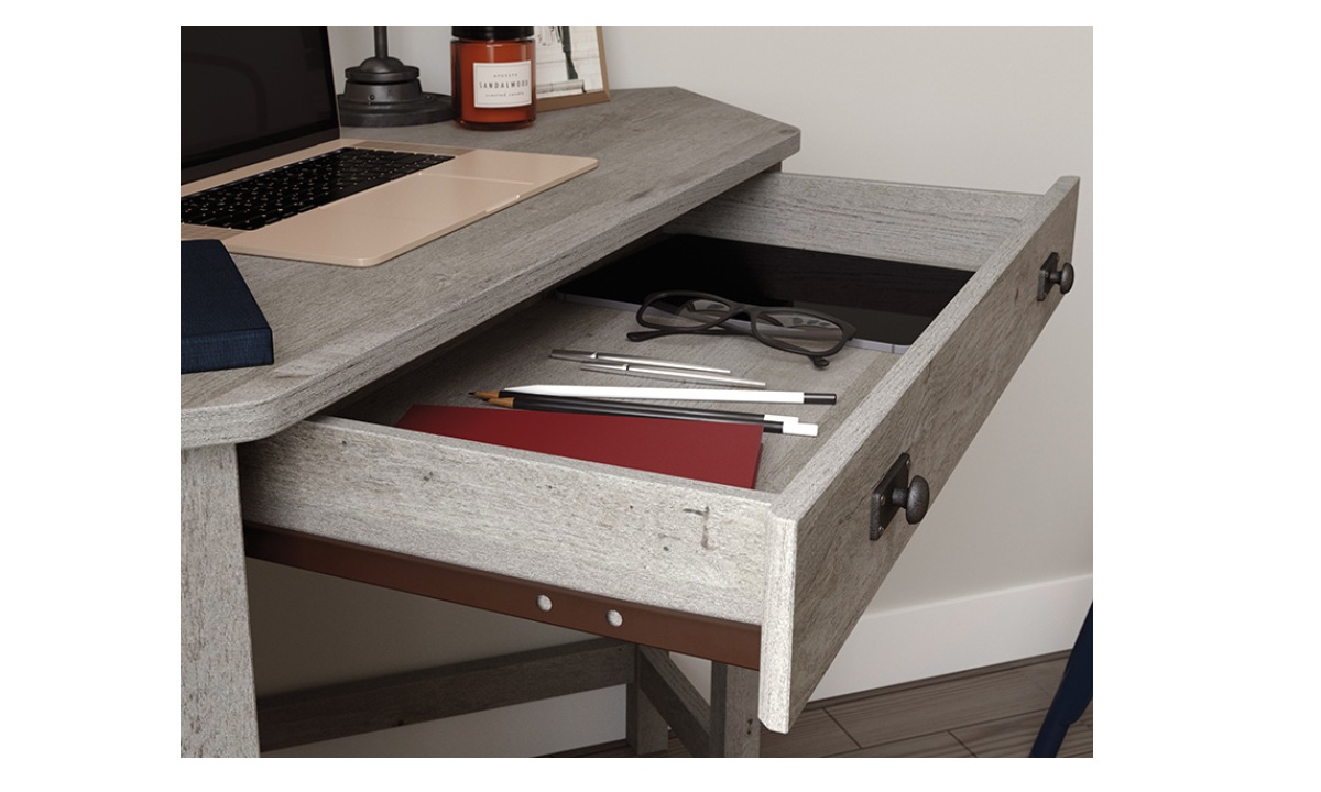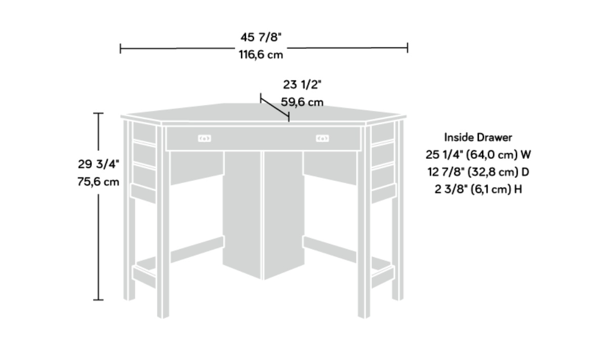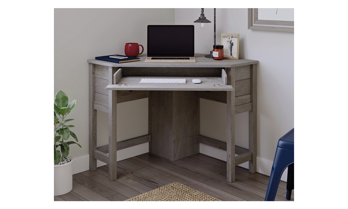 Need a space saving desk for every corner of the house? Look no further than this computer desk with drawer from the Cottage Road® collection. This corner computer desk features a space-saving design that allows for maximum conservation of floor space. Use this corner desk in the home office, guest bedroom, living room, or wherever you need to work on projects. This computer desk with storage includes a drawer/shelf that features a flip-down panel for laptop or keyboard/mouse to keep the top surface of your desk free of unnecessary clutter. Use the top surface for your computer monitor, a cup of coffee, photos of loved ones, and more. Finished in Mystic Oak®, seamlessly incorporate this home office desk into your space wherever you need it. We hope you like what you see with this space saving corner desk. Sauder designers travel the world and bring back the best and latest in style, finish, and color trends. This inspiring world travel is evident in the cutting edge and innovative furniture solutions we offer to you!