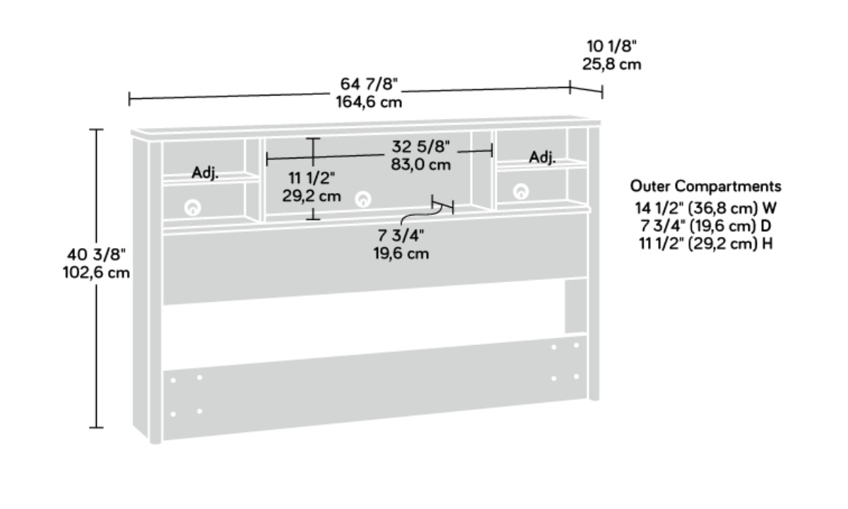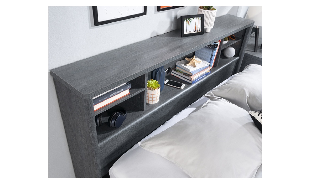 With a distinctly transitional style defined by rounded corners and edges that lend a subtle softness, this queen headboard with storage will help keep the sleeping space clutter-free. This headboard attaches to either a full or queen-size bed for versatile and family-friendly bedroom swap possibilities. With convenient cubby storage, this full-size bookcase headboard is ideal for adult or youth bedrooms alike. A spacious display area above the head is a convenient place for a cell phone, an alarm clock, or the latest novel. Two adjustable shelves provide additional storage versatility. An enclosed back panel provides cord access to keep charging cables and cords organized and out of sight. Finished in modern and trendy Denim Oak® this queen bookcase headboard from the Dover Edge® collection combines style and function to optimize any bedroom.
