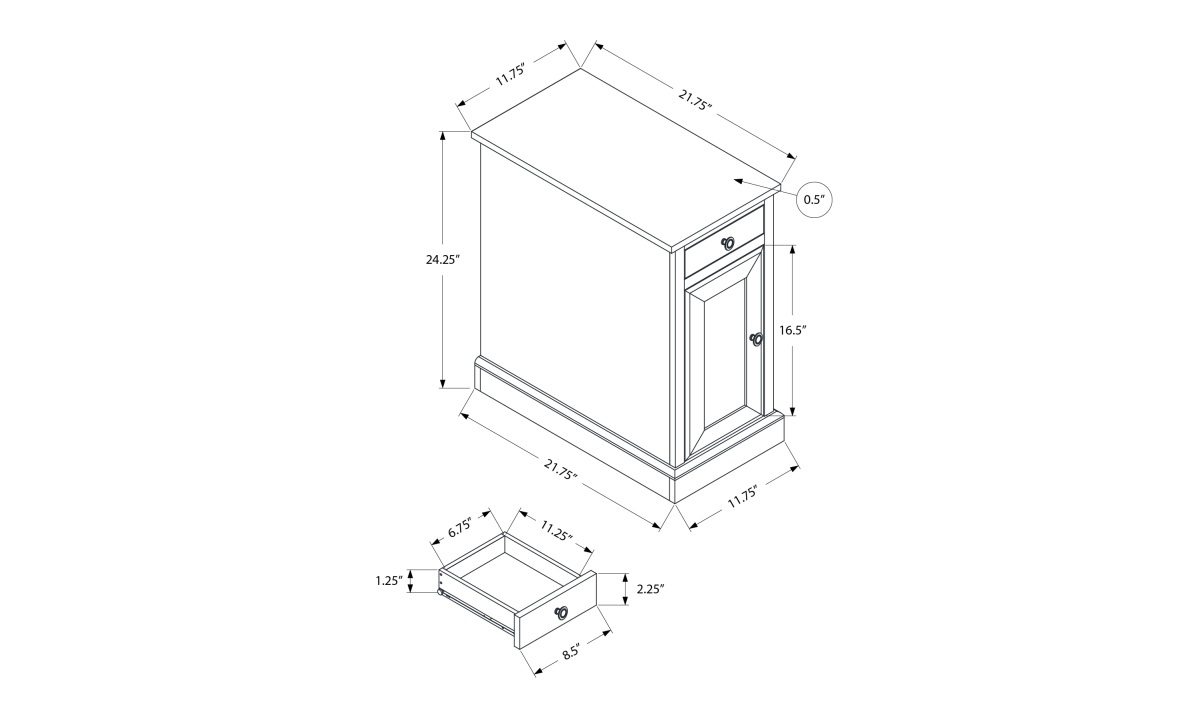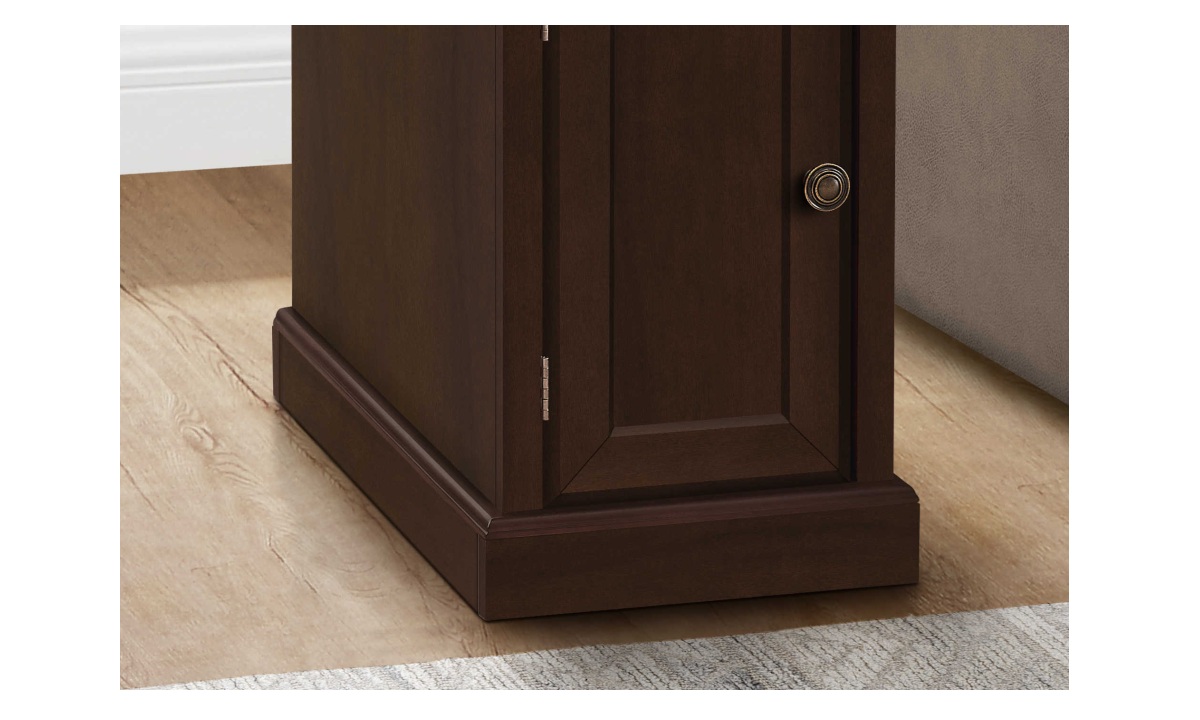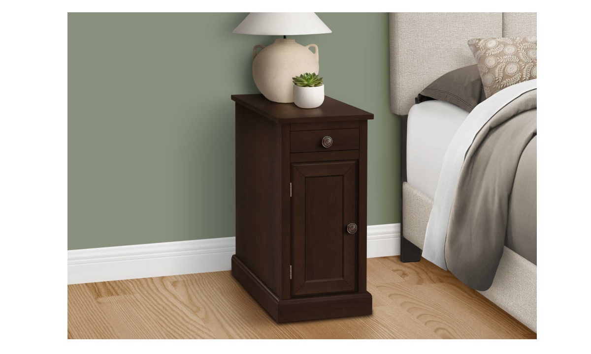 If you want an accent table that combines both practicality and style, then look no further than this narrow 24 inch high dark espresso brown veneer end table with a storage drawer. This fashionable side accent table with an easy to clean top is perfect to set next to a sofa or chair in your living room or setup a reading lamp on top and place in your bedroom as a charming nightstand. This traditional accent table with a space saving design has plenty of storage options that include a drawer and cabinet both accented with elegant metal knobs in a bronze finish, great to tuck away books, magazines, glasses or remotes. It includes an adjustable shelf inside the cabinet for added practicality. Durably designed and easy to assemble with full illustrated instructions and hardware, you will enjoy this fashionable style side table in your home for years to come.