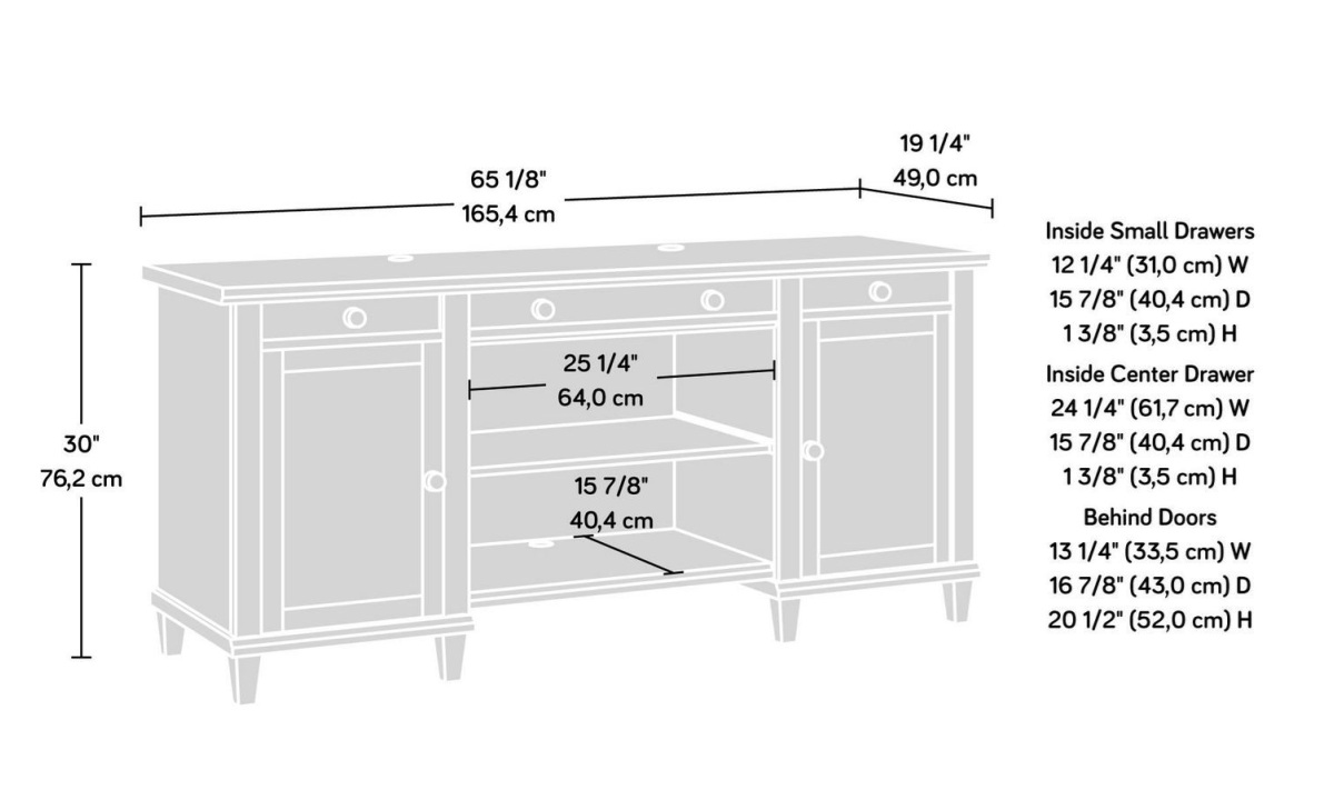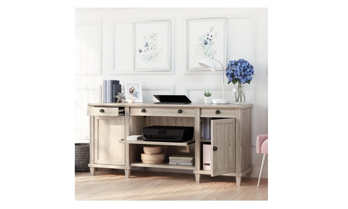 A home office credenza adds display and storage space in one stylish accent piece. The office credenza from the Hammond collection complements the pieces you already own while adding a touch of fresh style into your home. With a durable, 1 in. thick top, this double pedestal credenza has a top surface you can use to display pictures of your loved ones, pieces of home decor that make the office feel like home, and of course, essential office supplies like a lamp or binders. All three drawers of this wood storage credenza feature full extension slides for ease of use. Behind each door is an adjustable shelf so you can customize your credenza to accommodate your items of various heights. A pull-out, adjustable printer shelf means that your printer is always close by and has no need to be tucked away in a storage cabinet. This credenza desk features a cord management system that includes two desktop grommet holes to keep your electrical cords organized and out of sight. With solid wood ft. detailing and a Chalk Oak finish, this wood storage credenza adds style and much needed storage to any room it’s in.
