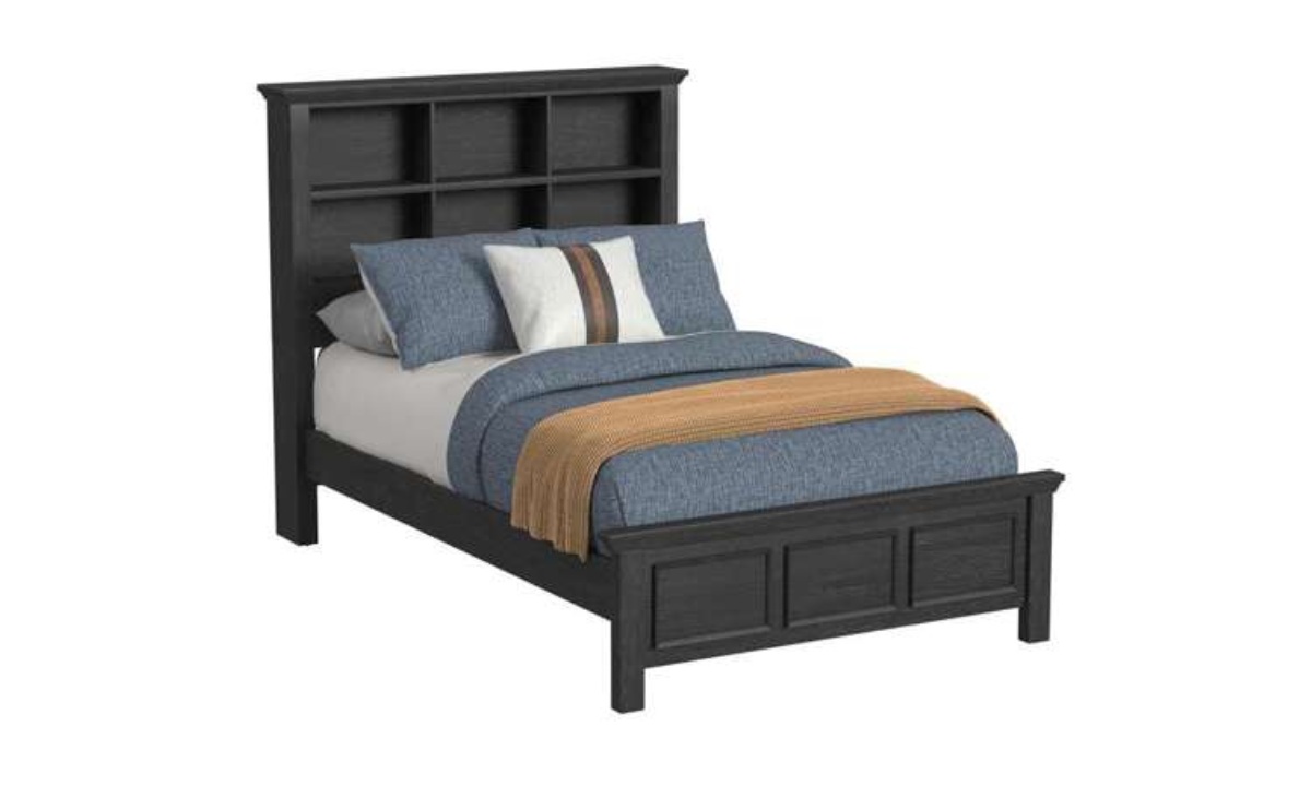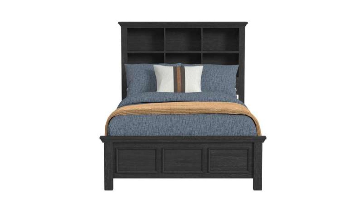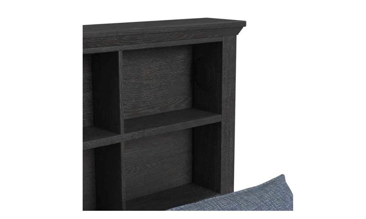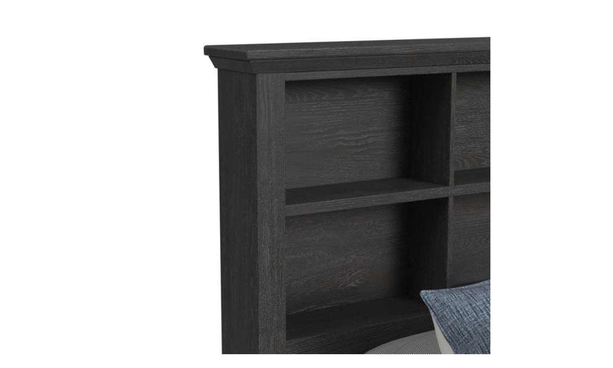 Maximize your child’s bedroom space with the sophisticated Hampton Kids Full Bookcase Bed in Charcoal. Designed with durability in mind, this piece is built with solid wood with a grained oak veneer that creates the illusion of depth. Speakers in the bed’s headboard along with built-in shelving add a touch of modern practicality without sacrificing style or comfort. Clean lines and unadorned block feet create timeless elegance that adapts easily into various décor styles. For modern comfort, durability, and ageless style, the Hampton Kids Full Bookcase Bed is the clear choice.