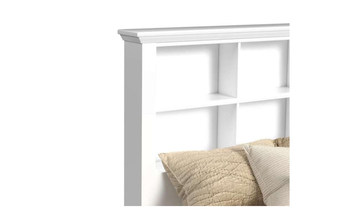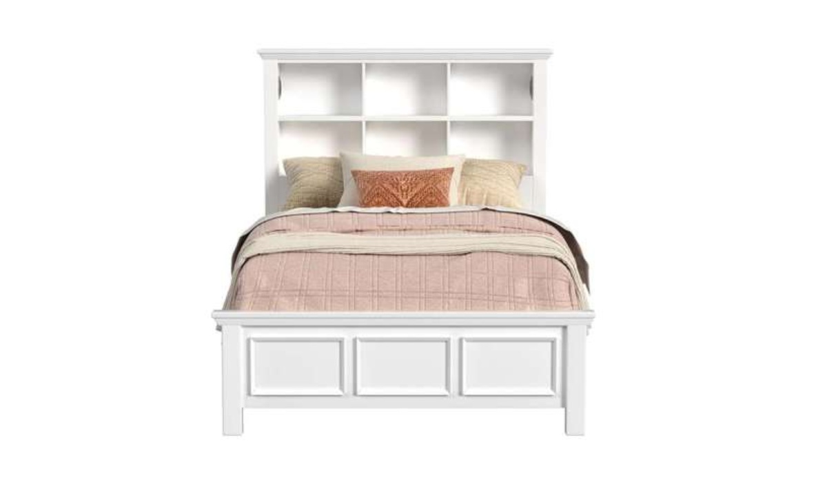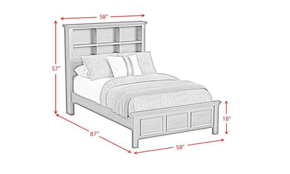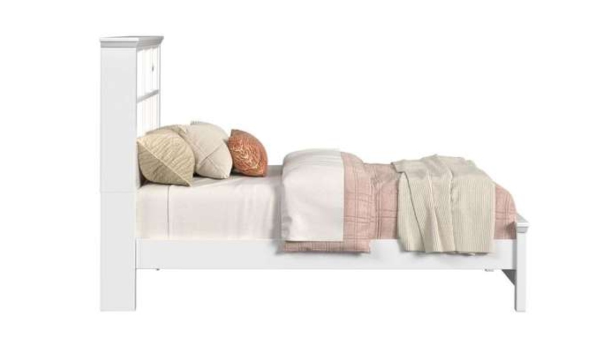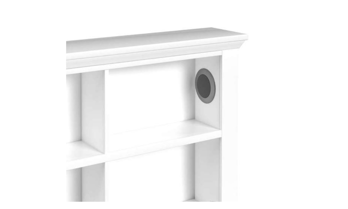 Maximize your child’s bedroom space with the sophisticated Hampton Kids Full Bookcase Bed in White. Designed with durability in mind, this piece is built with solid wood with a grained oak veneer that creates the illusion of depth. Speakers in the bed’s headboard along with built-in shelving add a touch of modern practicality without sacrificing style or comfort. Clean lines and unadorned block feet create timeless elegance that adapts easily into various décor styles. For modern comfort, durability, and ageless style, the Hampton Kids Full Bookcase Bed is the clear choice.