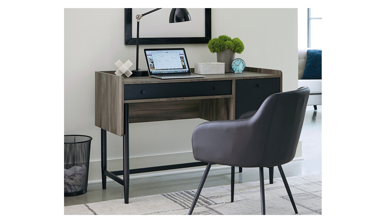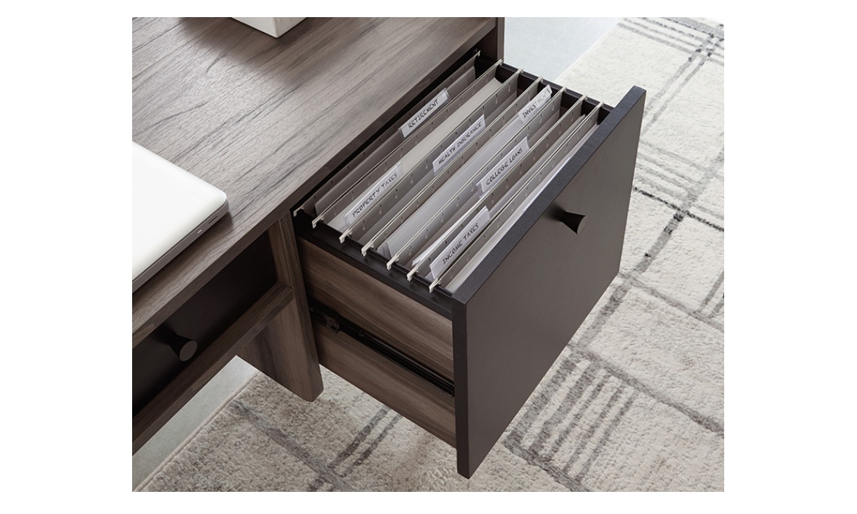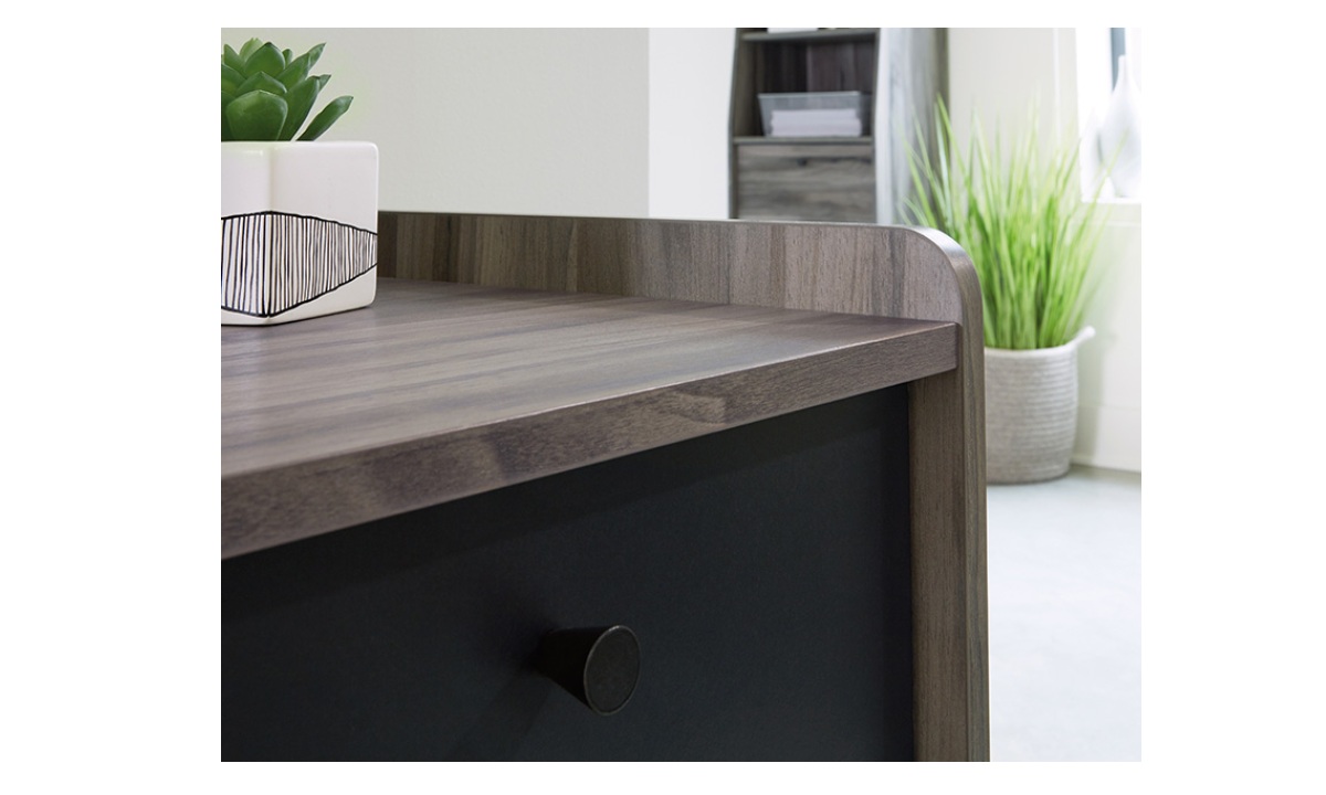 “Work” never felt so easy. Enhance your home office space with this desk from the Harvey Park® collection. This modern home office desk features a spacious work surface that offers room for all your desk essentials – laptop, books, papers, your planner, and most importantly, your to-do list. This computer desk with storage features an easy gliding pencil drawer with safety stops for storing close-at-hand items like pens, sticky notes, and more. A file drawer with full extension slides holds letter-size hanging files, making this metal and wood desk the optimal place to store your most important files. This desk with file drawer is finished on all sides, so it will look polished from every angle. A Jet Acacia® finish with black accents and powder coated metal base are the details that send this home office desk to the top of your “to buy” list.