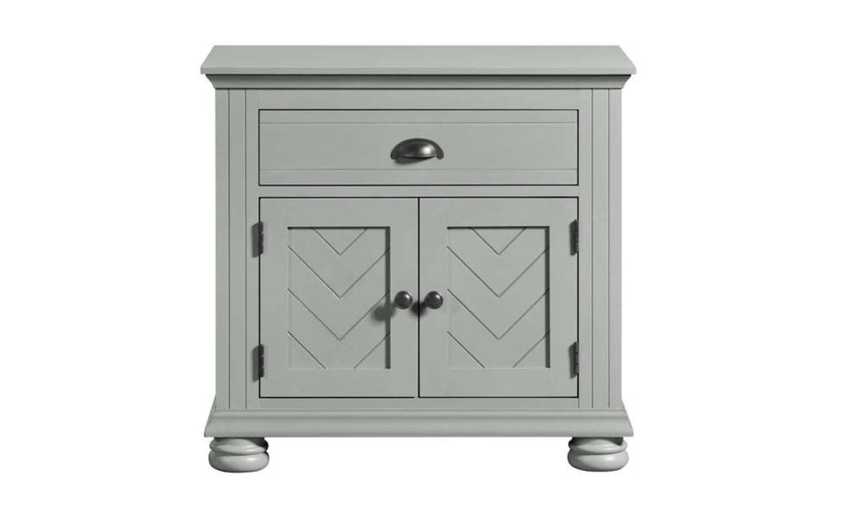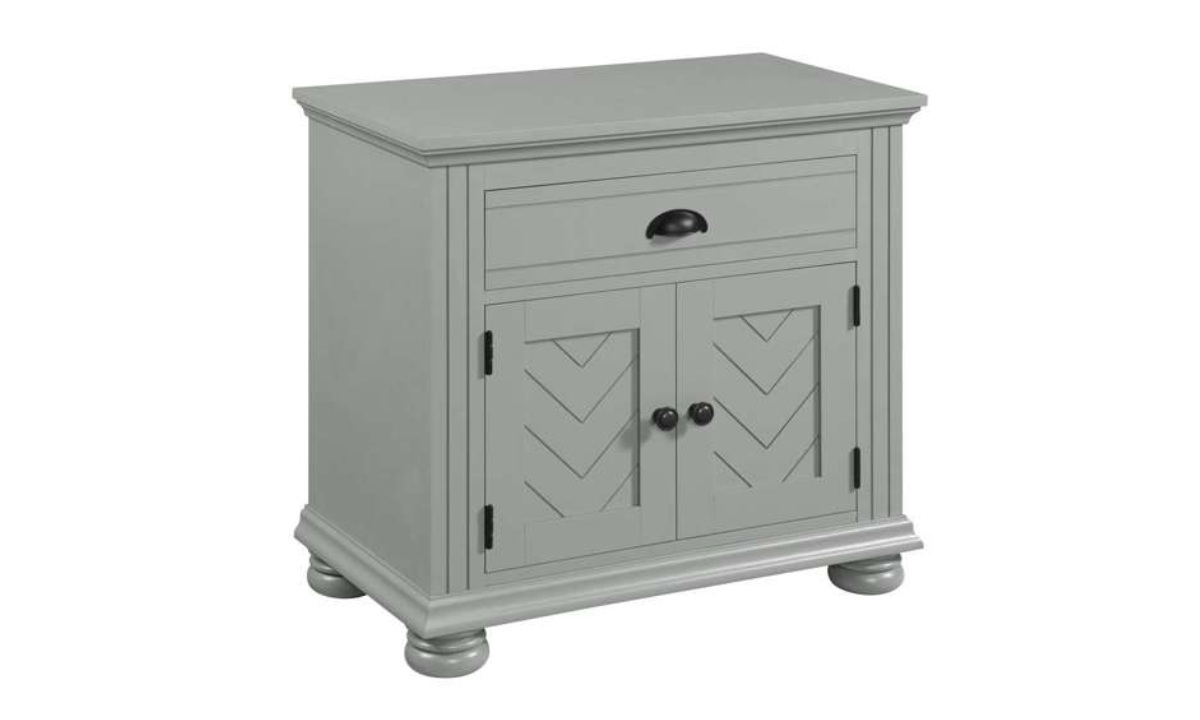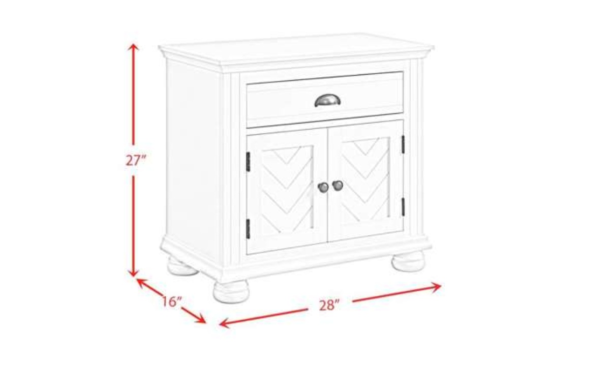 Introducing the Kona Nightstand, the perfect blend of style and functionality for your bedroom. The chevron pattern detail on the cabinet door fronts adds a touch of elegance, while the black knob and cup pull hardware give it a modern flair. The drawer is lined with felt to keep your belongings safe and secure, and the dust-proofing bottom layer ensures that this nightstand will last for years to come. With bun feet that elevate the nightstand off of the floor and a Kenlin drawer guide for smooth operation, the Kona Nightstand is the ideal addition to any bedroom decor.