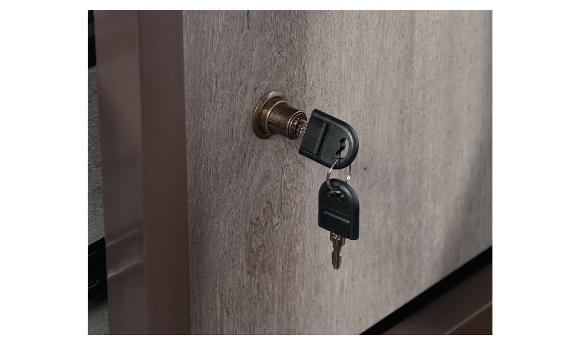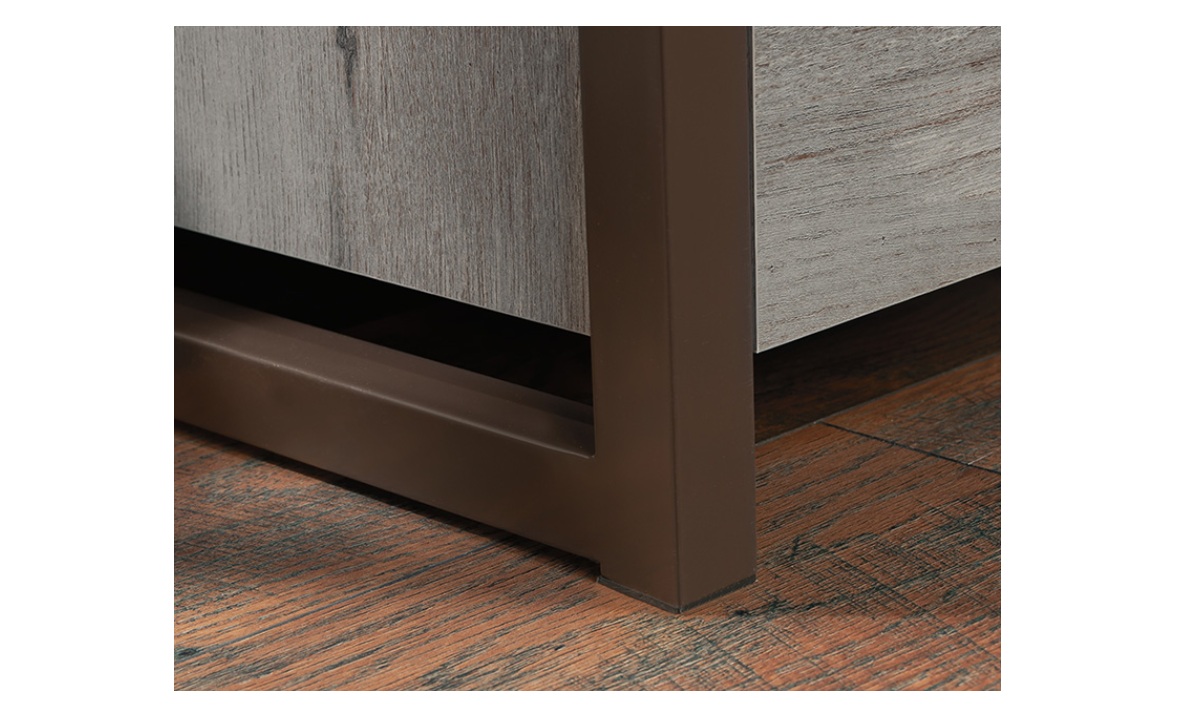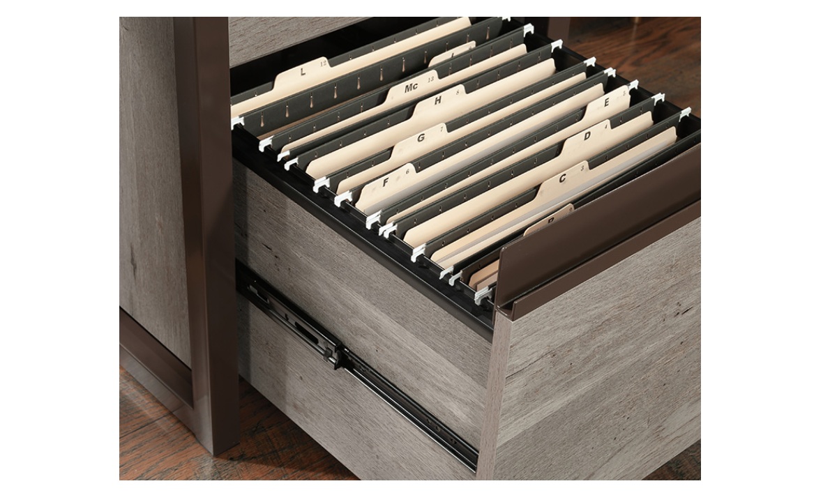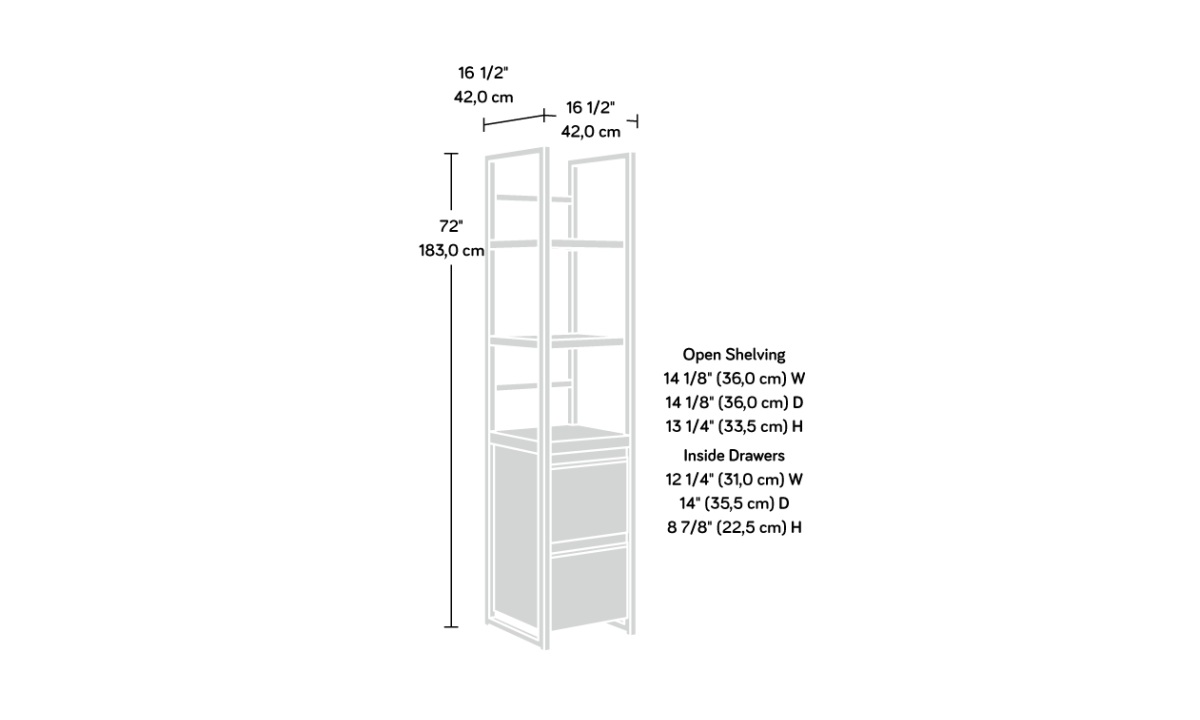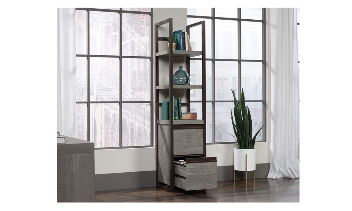 Storage with limited space in mind. Add style while considering the space in your home with this narrow bookcase from the Manhattan Gate® collection. This 2-shelf narrow bookcase features two shelves to store and display books, plants, décor and more! This narrow bookcase with drawers includes two file drawers with full extension slides to hold letter-size hanging files so your most important documents are organized and free of clutter. The lower drawer of this mid-century modern bookcase locks for security, and a safety mechanism allows only one drawer to open at a time. With strong and lightweight panel construction, a wall anchor for added stability, and powder coated metal frames and pulls, this narrow bookshelf has durability as well as style in mind. Finished in Mystic Oak®, this bookcase with storage upgrades your home or office with simple but elegant design.