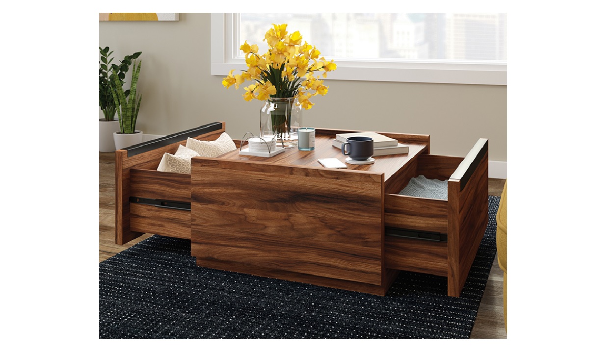 A square coffee table sets a room apart. This Manhattan Gate® coffee table takes what you know about the centerpiece of a living room and gives it a new century lift. This modern coffee table is built with strong and lightweight panel construction that makes assembly and rearranging in your home easy and stress free. This square coffee table with storage features two storage drawers with full extension slides that holds remotes, pillows, small blankets, magazines, and whatever you need to hide or stow away. The top surface space of this coffee table with drawers is spacious enough for home décor, drink coasters, a candle, and more. Finished on all sides for versatile placement anywhere in your home, this modern coffee table with storage will look polished from every angle. A Blaze Acacia® finish takes this square coffee table from wow to WOW!