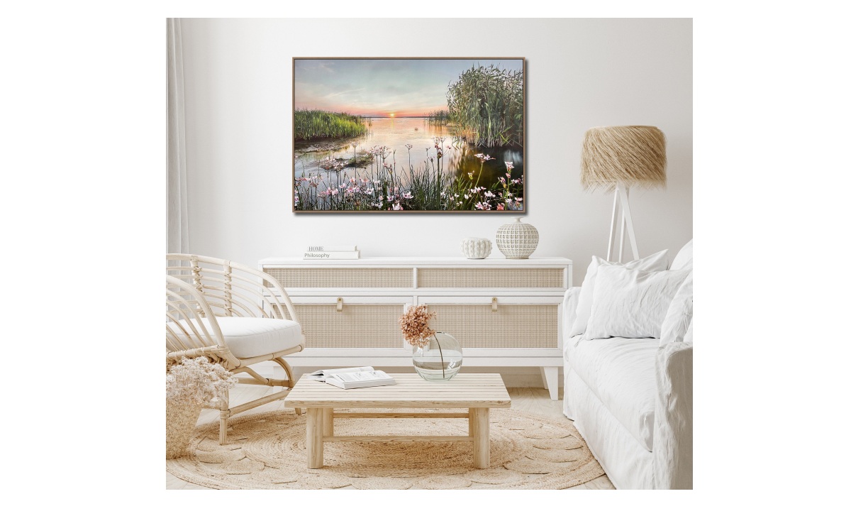 Hand embellished and lightly textured canvas art in an oak colored floating frame