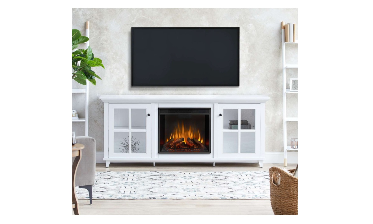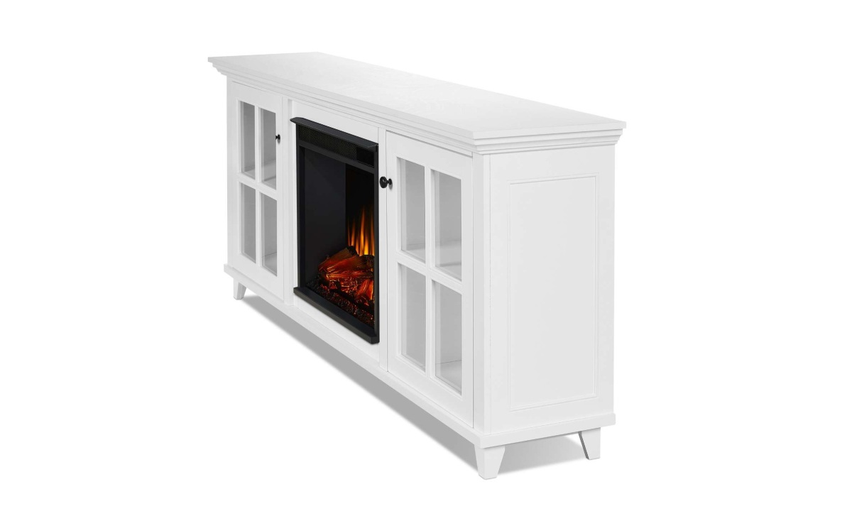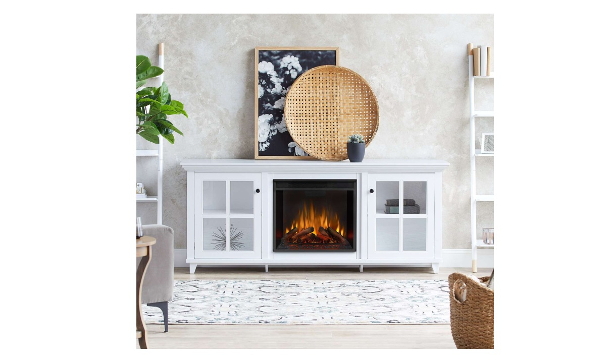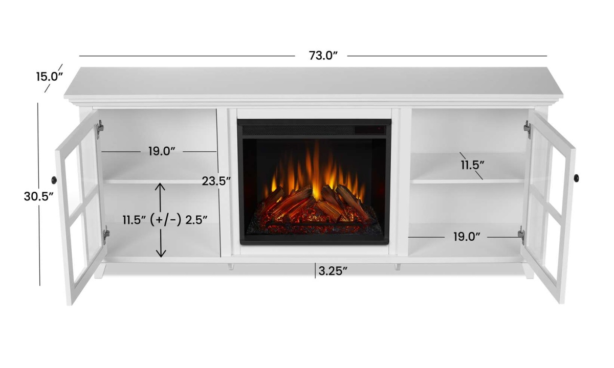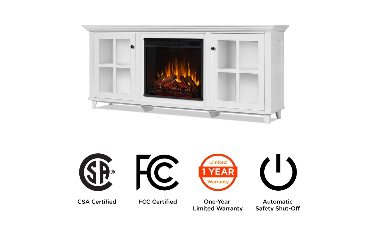 Discover the possibilities of interior design and transform your home into a warm and welcoming space with the addition of the Norwell electric fireplace TV stand. With plenty of shelving behind glass doors, things can stay neat and tidy while you enjoy the beauty and comfort of an indoor fireplace. The Real Flame® VividFlame™ electric firebox mimics the look of a real, flickering fire, but does not require a chimney or vents and conveniently plugs into a standard outlet. This free-standing fireplace entertainment center can accommodate a TV up to 70″. Features a mantel with a real wood finish, six flame colors, five flame brightness levels, adjustable thermostat, timer function and automatic safety shut-off. The electric fireplace insert provides supplemental heat for rooms up to 1,000 sq ft or the heater can be turned off so you can enjoy the comforting ambiance of a glowing fireplace year-round. Mantel, firebox with log set, hardware and remote control are included.
