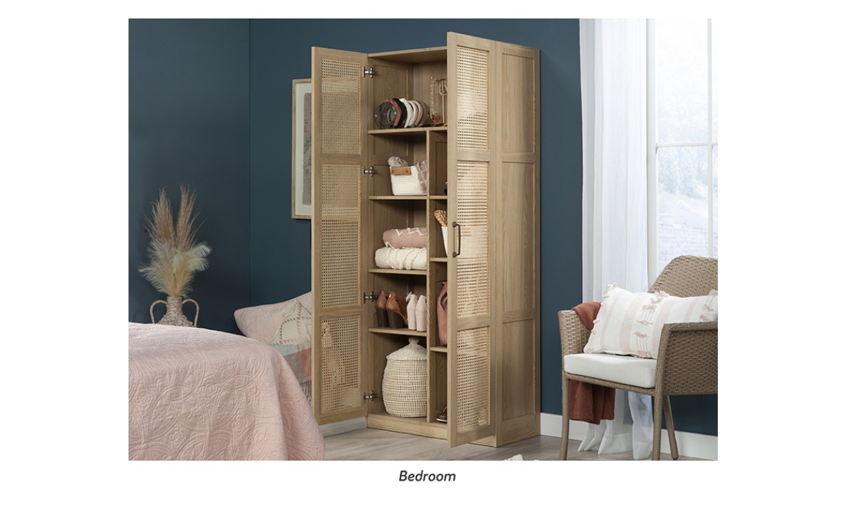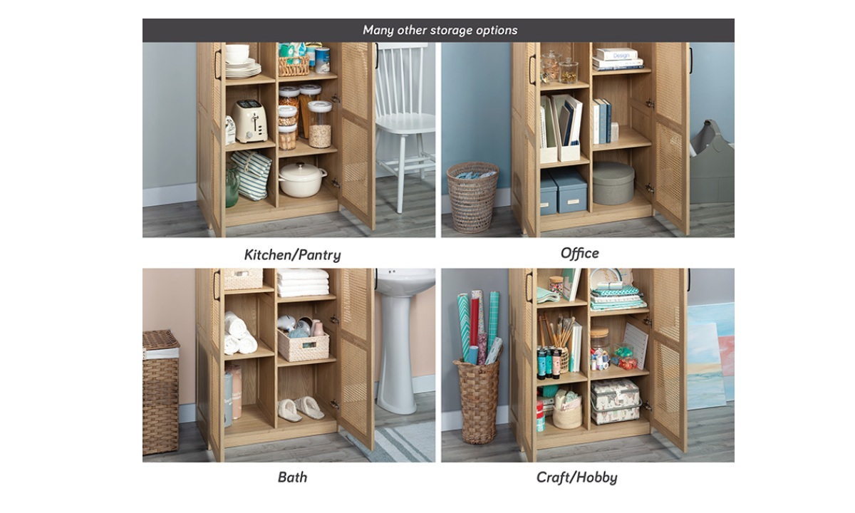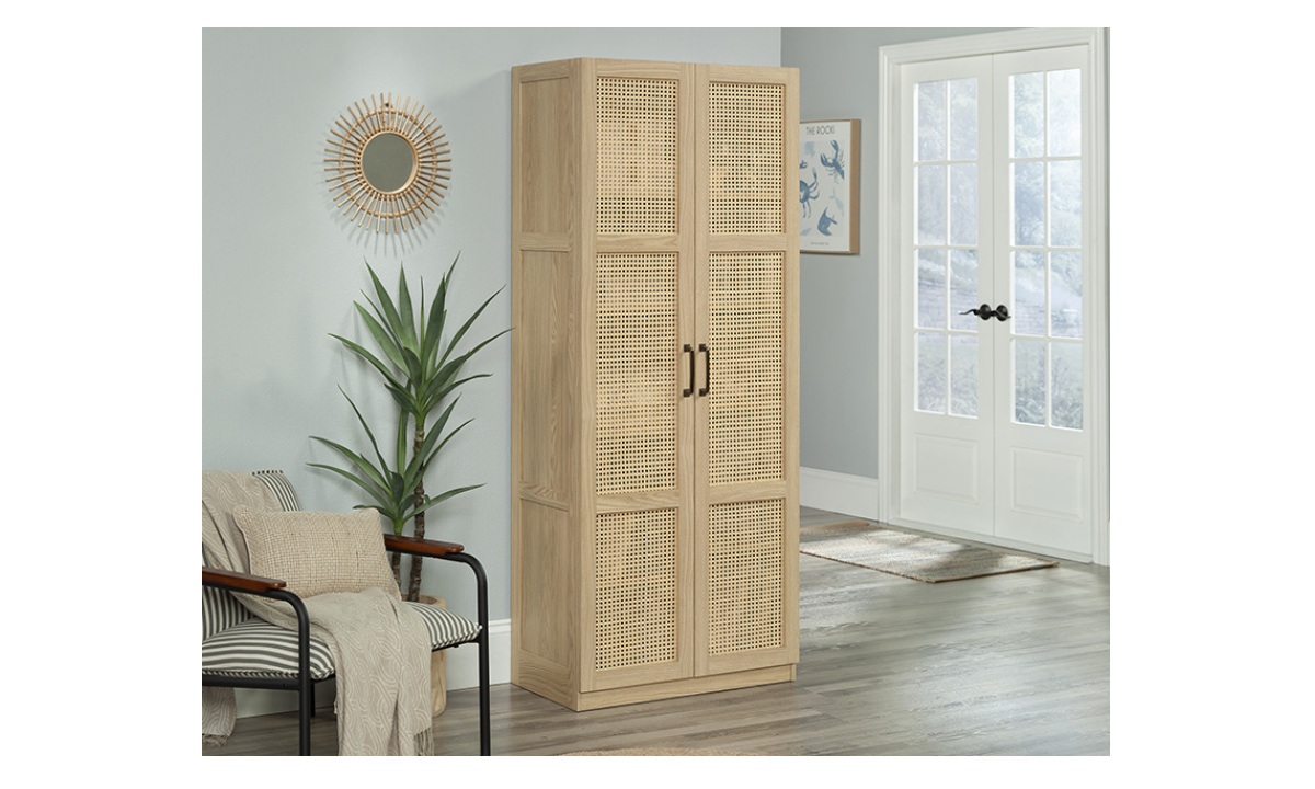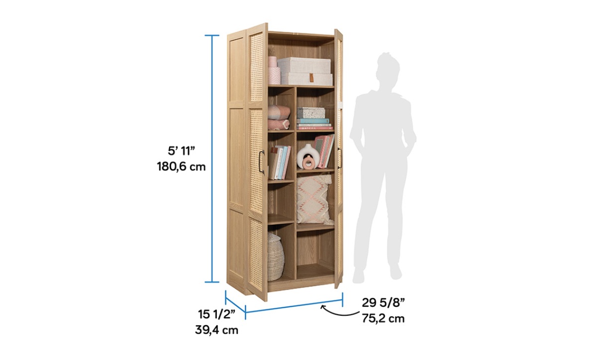 Enjoy the rustic luxury of the rattan door storage cabinet from Sauder® for a laid-back style on the outside that conceals an organizational mastermind within. Hidden storage lies behind doors with delicate, soft-closing hinges, which prevents slamming and pinches. The six adjustable shelves of this 2-door storage cabinet provide versatile storage for items short or tall. Keep big bottles of laundry detergent well organized in the utility room, or organize stacks of towels, sheets and blankets. The full upper shelf of this storage cabinet with doors provides space for things like wide board game boxes, or boxes of office supplies or bins for crafting items. The door fronts feature rattan inserts that will infuse the peaceful essence of nature into the daily routine of life. With a minimalist-inspired Harmony Ash™ finish and the tranquil aesthetic of the nature, this double door storage cabinet transfers any space from cluttered to calm.