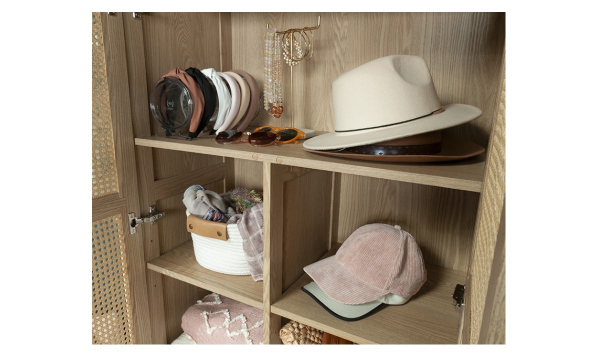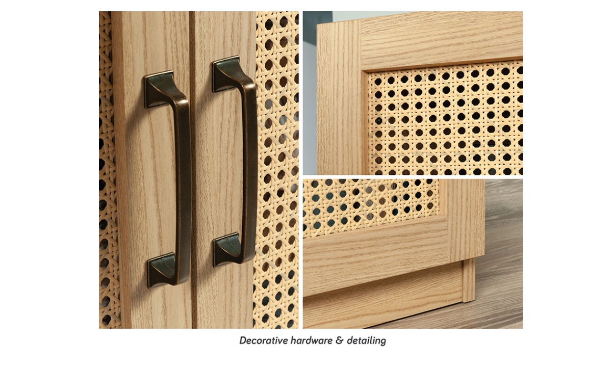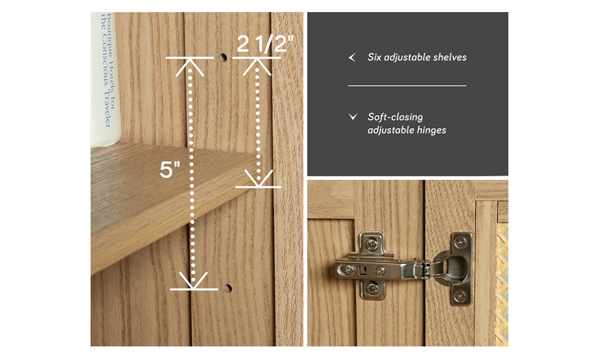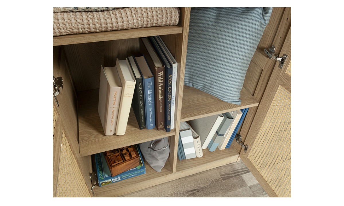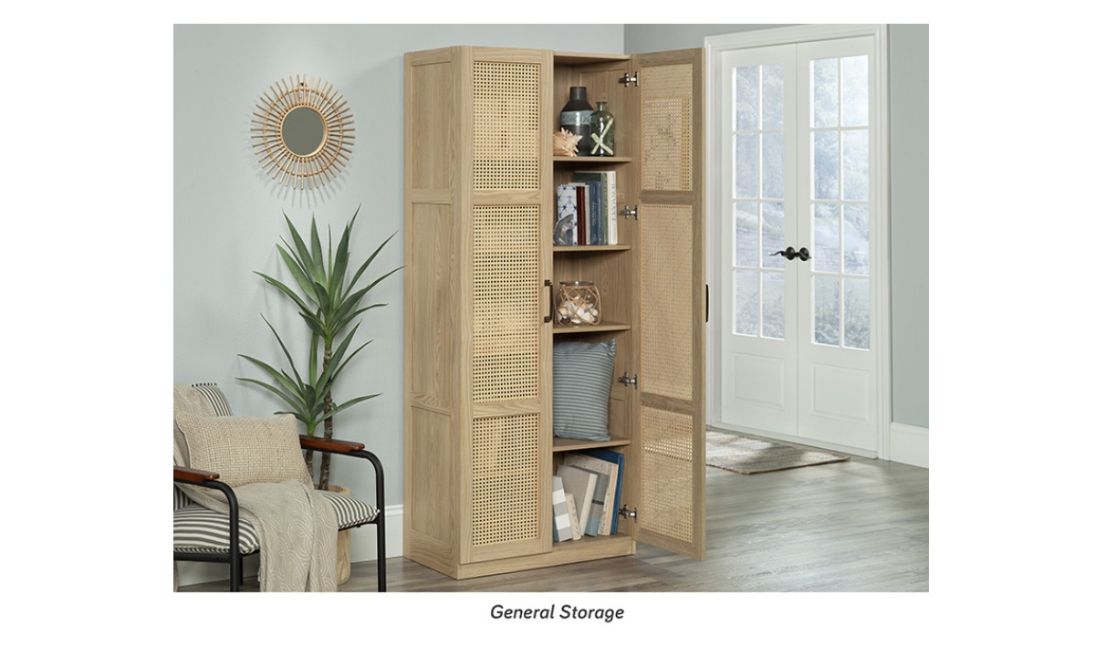 Enjoy the rustic luxury of the rattan door storage cabinet from Sauder® for a laid-back style on the outside that conceals an organizational mastermind within. Hidden storage lies behind doors with delicate, soft-closing hinges, which prevents slamming and pinches. The six adjustable shelves of this 2-door storage cabinet provide versatile storage for items short or tall. Keep big bottles of laundry detergent well organized in the utility room, or organize stacks of towels, sheets and blankets. The full upper shelf of this storage cabinet with doors provides space for things like wide board game boxes, or boxes of office supplies or bins for crafting items. The door fronts feature rattan inserts that will infuse the peaceful essence of nature into the daily routine of life. With a minimalist-inspired Harmony Ash™ finish and the tranquil aesthetic of the nature, this double door storage cabinet transfers any space from cluttered to calm.