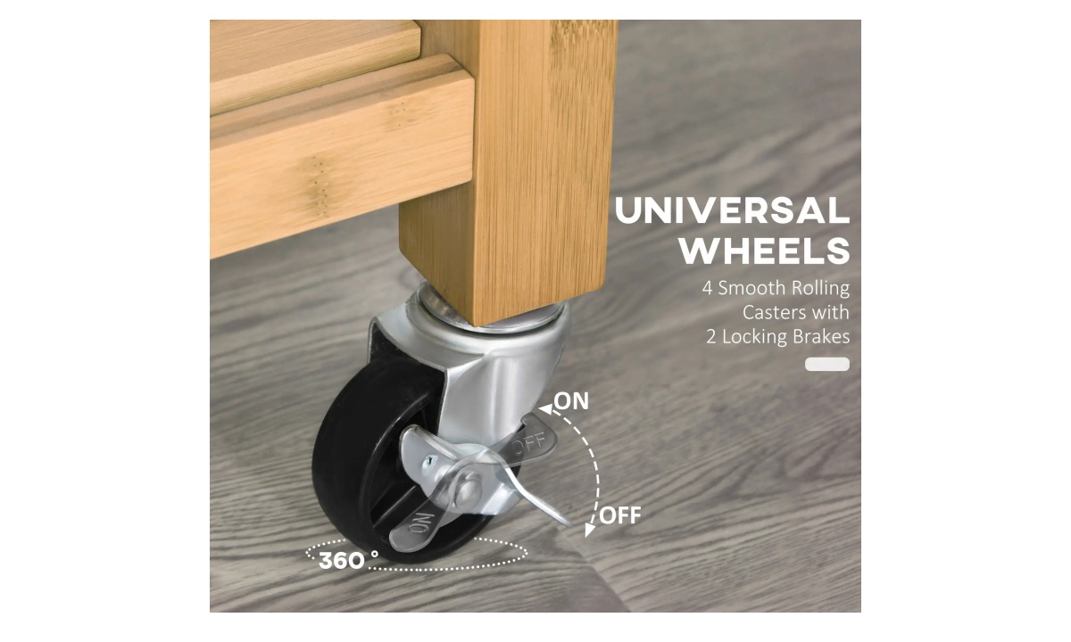 - Durable Material: This trolley cart on wheels is crafted from varnished bamboo, which ensures long lasting use and easy cleaning. The countertop is designed with a juice and water groove, collecting all moistures from running off the food preparation surface.