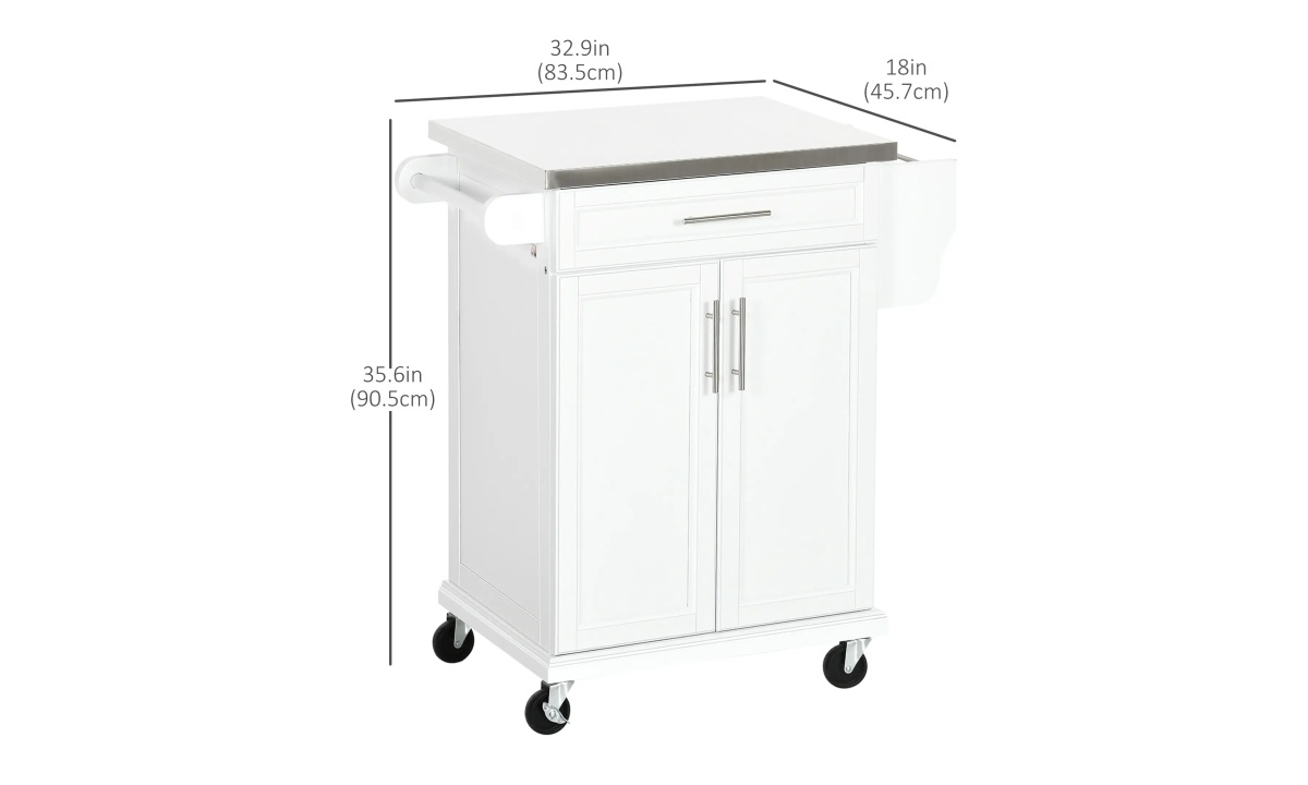 - Kitchen Cart with Wheels Info: Overall Dimension: 32.9″ W x 18″ D x 35.6″ H (83.5 x 45.7 x 90.5 cm). Weight Capacity: 77lbs/35 kg (total), 15lbs/7 kg (shelf), 33lbs/15 kg (top), 9lbs/4 kg (drawer), 2lbs/1 kg (spice rack/towel rack). Assembly required.