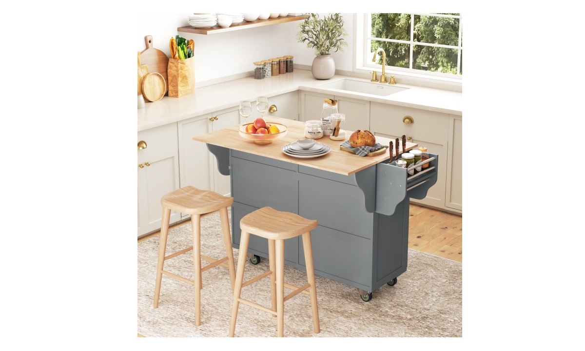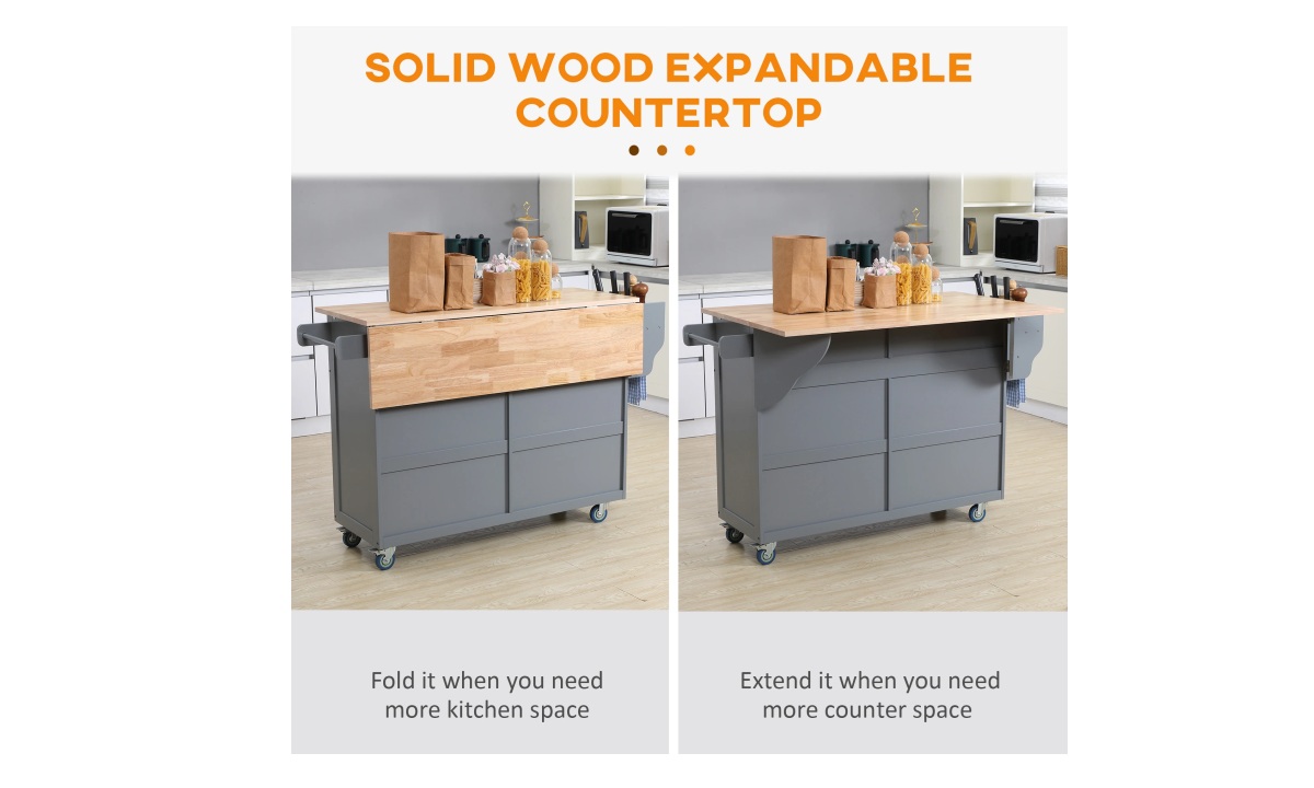 • Expandable Workspace: The rubberwood drop leaf countertop on this kitchen cart easily folds for space-saving or expands for additional dining spot or counter space with your bar stools, offering a water and scratch-resistant surface for your cooking needs.