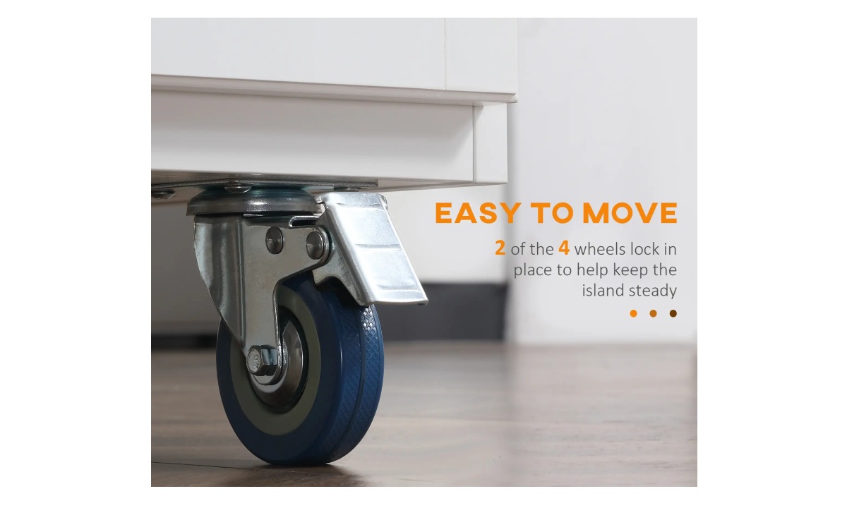 • Easy to Move Around: The rolling design on wheels lets you easily move the kitchen island cart around the kitchen or your home. 2 of the 4 wheels lock in place to help keep the island steady.
