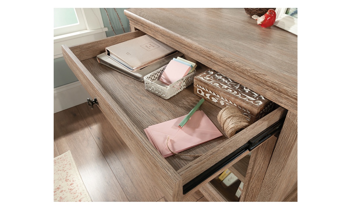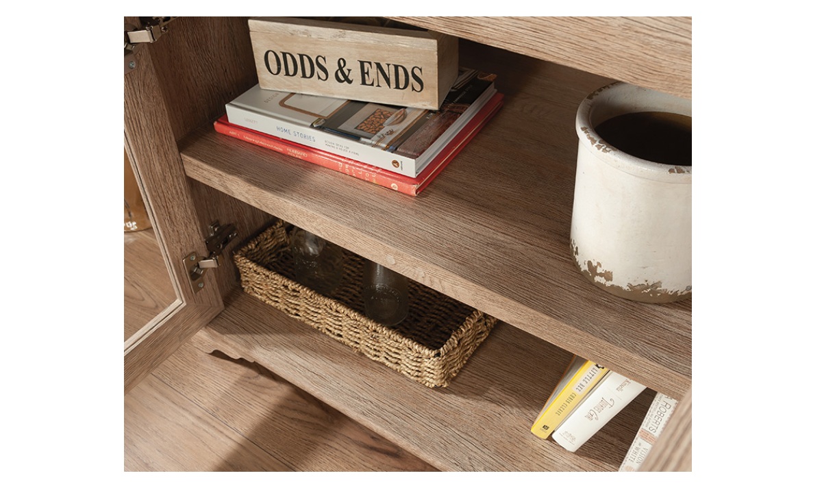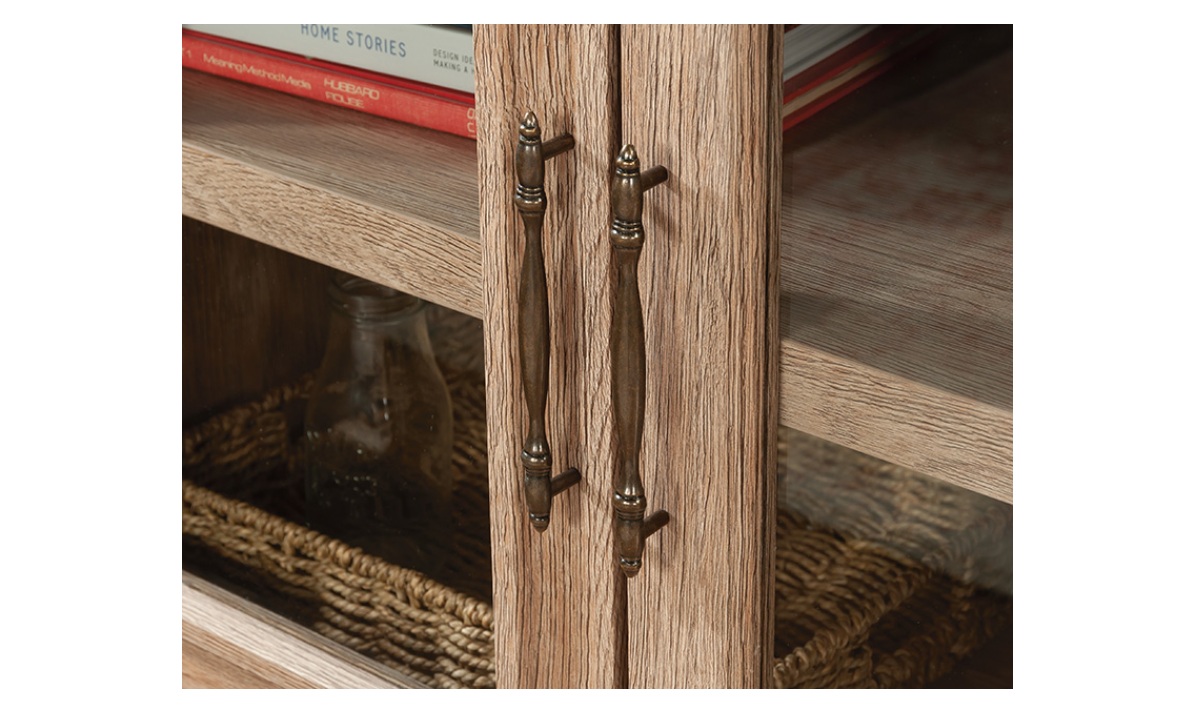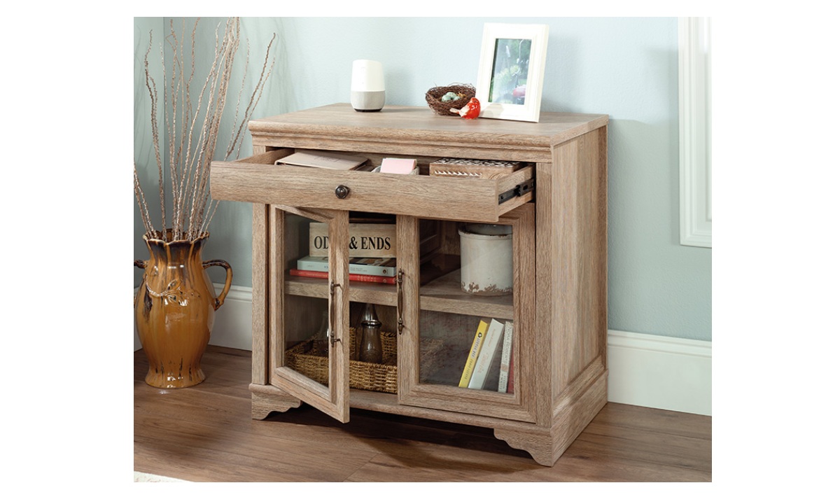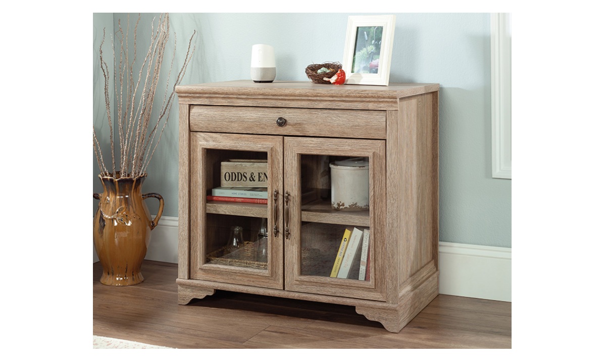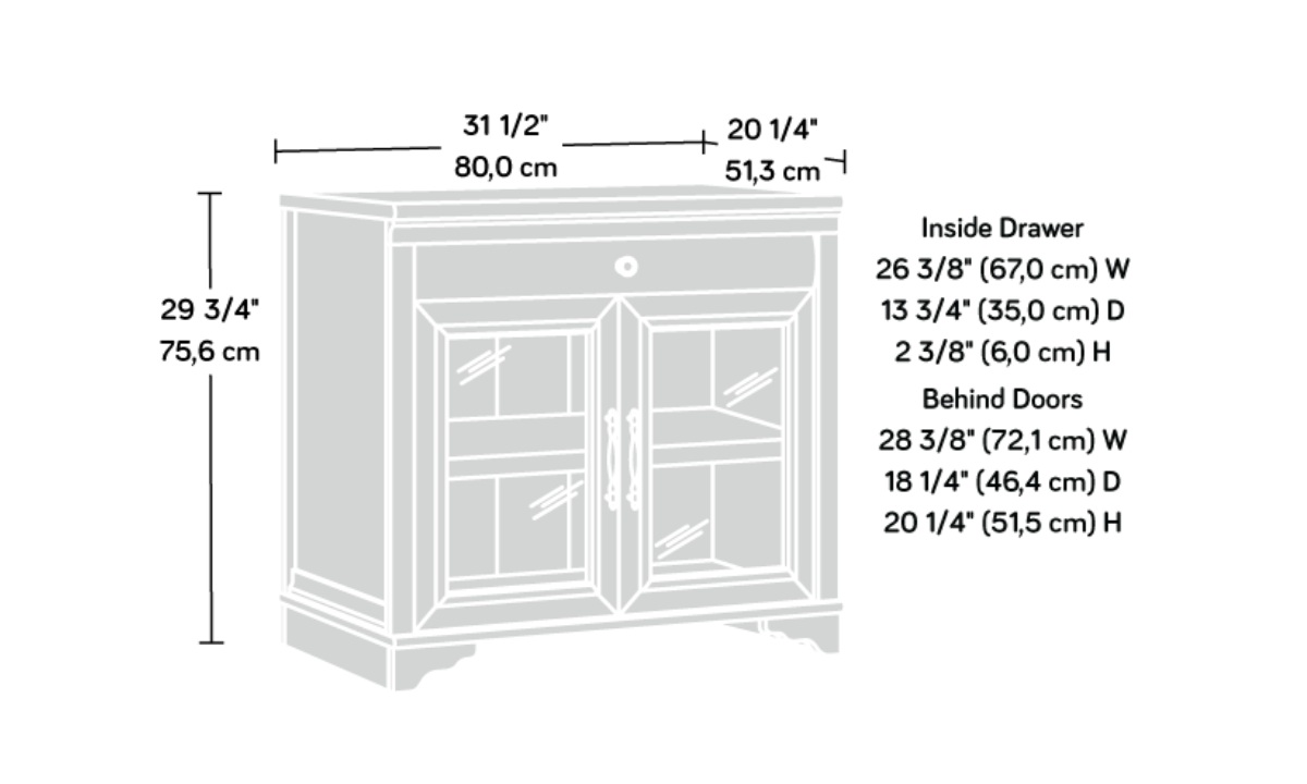 Add extra, compact, storage space in your home office with this storage cabinet from the Rollingwood® collection. With a durable, 1” thick top, this storage cabinet with doors is the perfect spot to display books, home décor or your favorite accent lamp. This office cabinet features a storage drawer with full extension slides for smaller items like pens, notepads, and a calculator. This home office cabinet features concealed storage behind the framed, safety tempered glass doors. A large adjustable shelf to accommodate items of various heights ensures that your new library base can hold a variety of items. Finished in Brushed Oak™, this office cabinet with drawer adds versatile storage in a compact design to your office space. We hope you like what you see. Sauder designers travel the world and bring back the best and latest in style, finish, and color trends. This inspiring world travel is evident in the cutting edge and innovative commercial furniture solutions we offer to you!