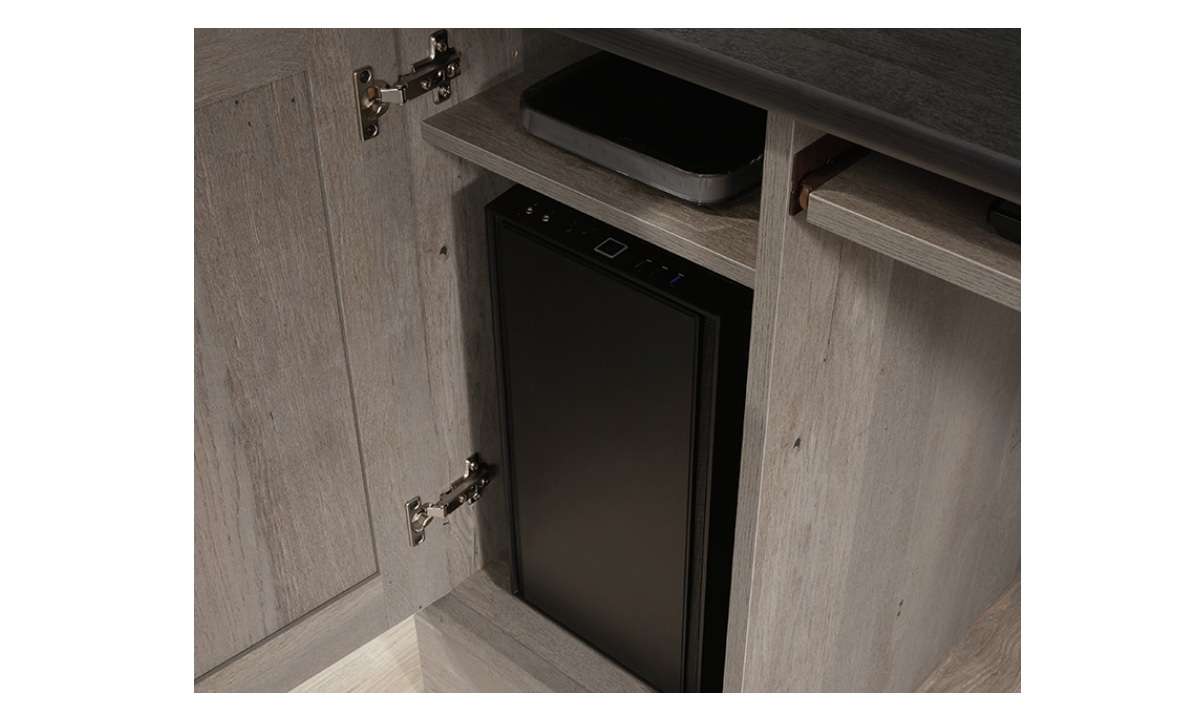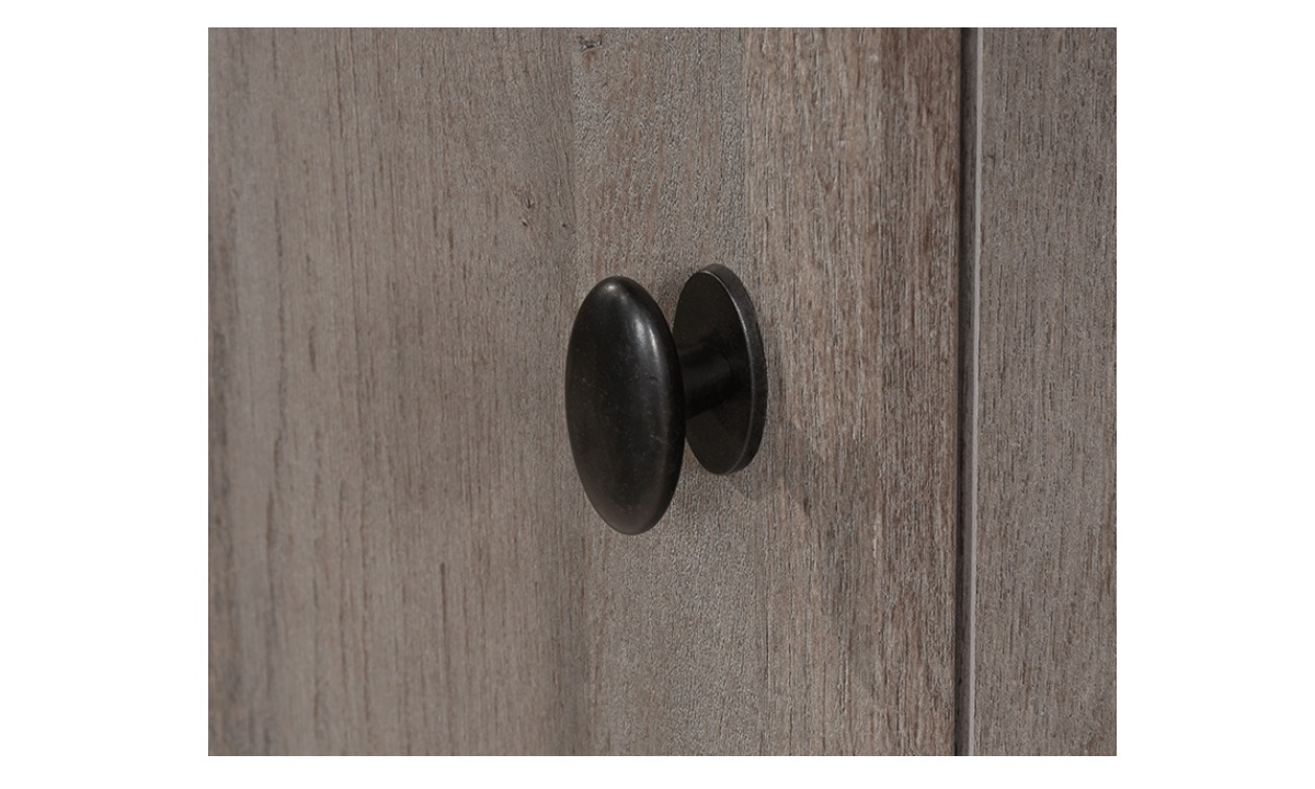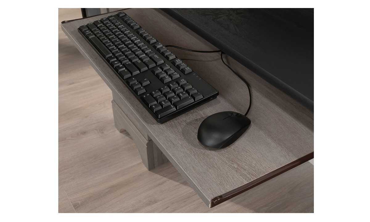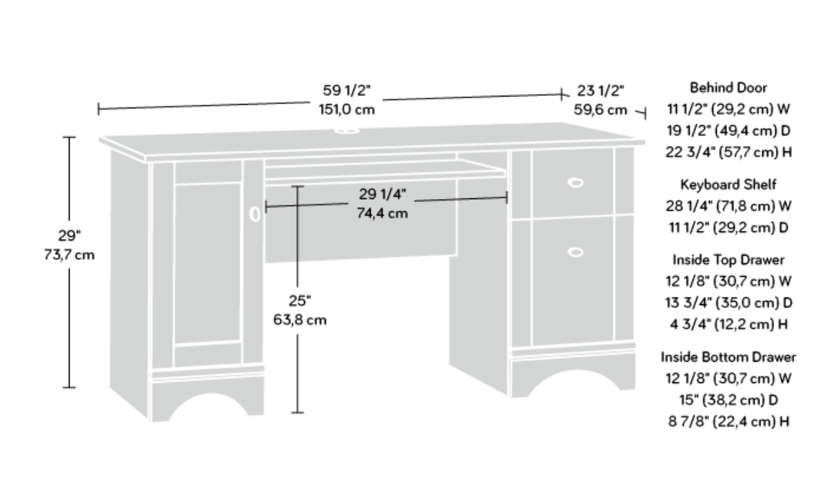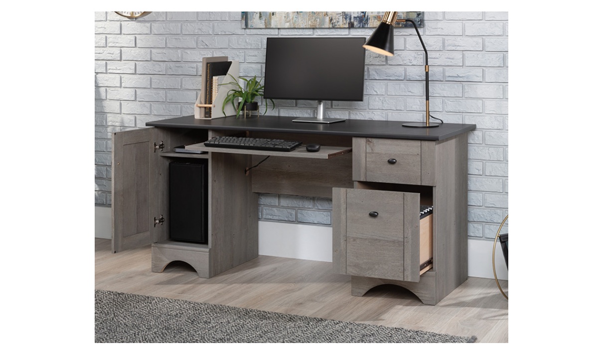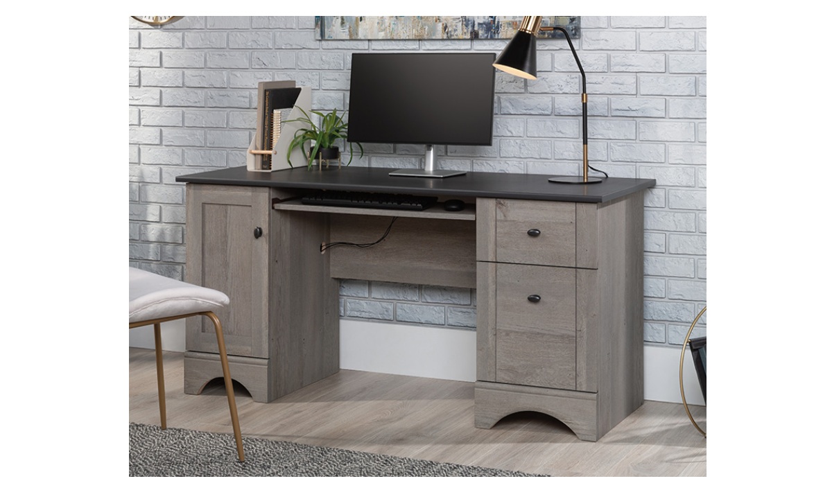 Simple, but effective. And oh, so popular. This computer desk with drawers from the Sauder Select collection is the perfect work from home solution. With style and function plentiful, this home office desk features a slide-out keyboard/mouse shelf with metal runners and safety stops to keep the surface workspace free, while providing the user with important ergonomic benefits. A double pedestal desk, one side features two easy gliding drawers. The top drawer provides storage space for pens, paperclips, note pads, envelopes and more. The lower drawer is a filing cabinet which can hold letter or European sized hanging files, allowing your most important documents to be organized and easy to find. The opposite pedestal of this computer desk with storage contains space behind the door, which can hold a vertical CPU tower, and includes an adjustable shelf to customize your storage to your size and space preferences. The computer desk with keyboard shelf can be assembled in a snap with a T-slot drawer system, with concise storage and plenty of surface workspace for even the smallest office space. Finished all over in Mystic Oak® with a contrasting Raven Oak® top surface, this computer desk has a look that stands out in any home office setting.