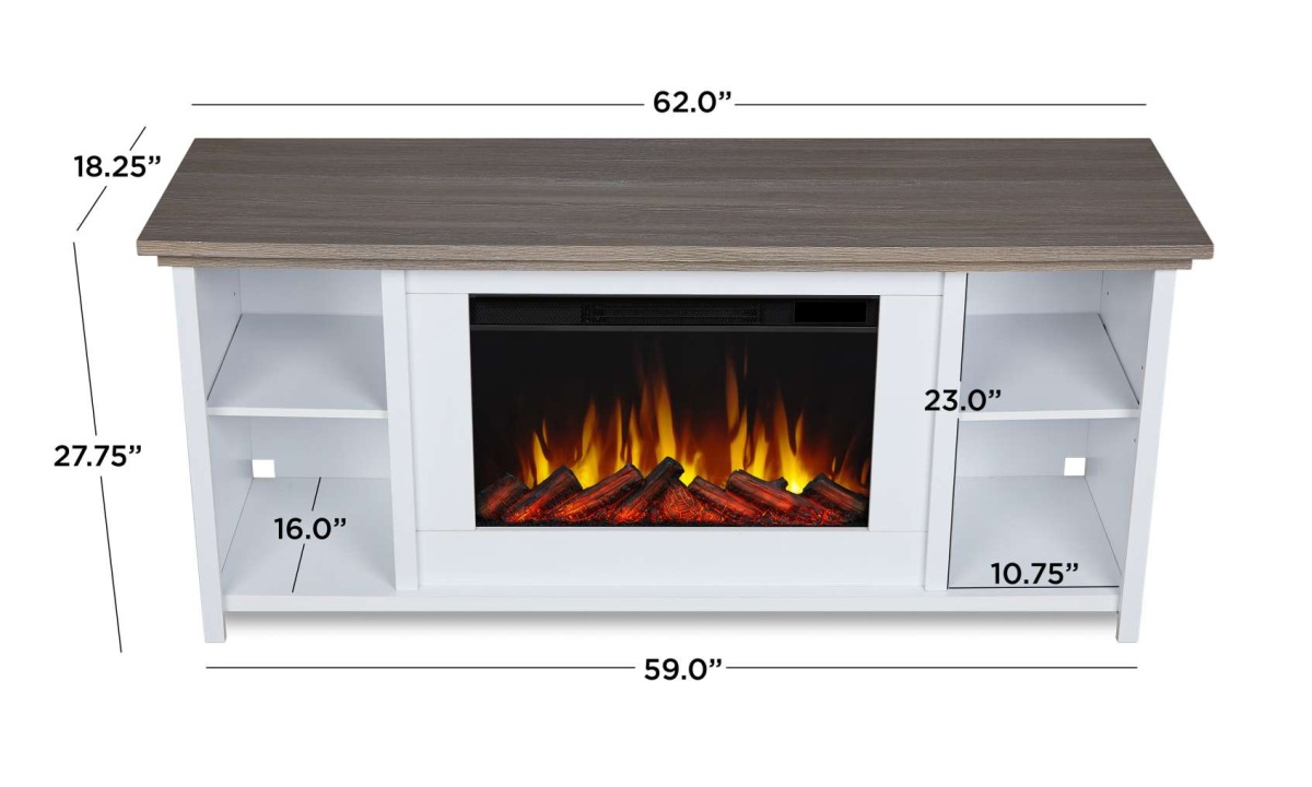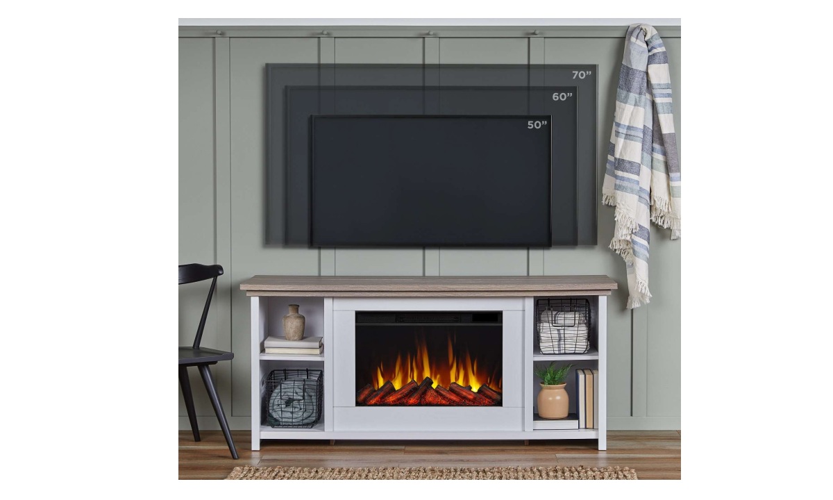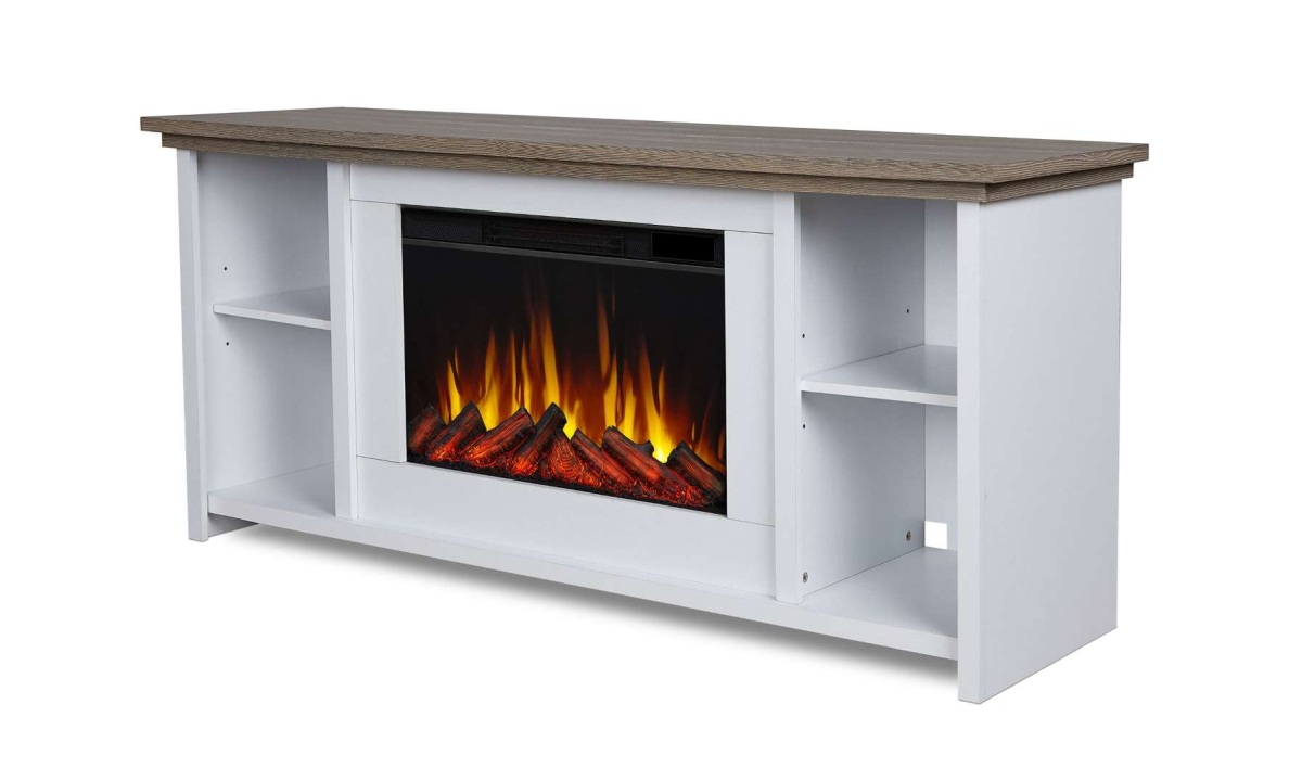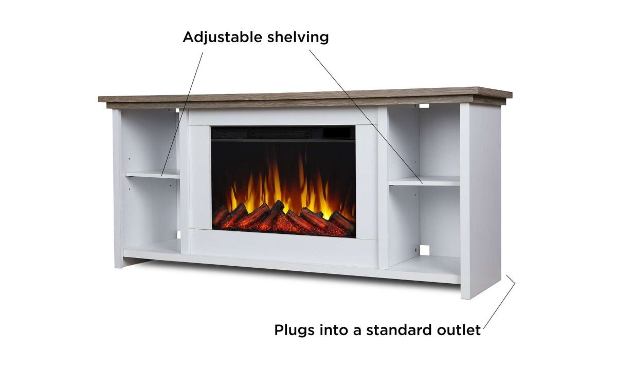 Refresh your home or office with the modern farmhouse style of the Tramore electric fireplace. With a narrow footprint and plenty of shelving, this free-standing, versatile fireplace can enhance a variety of spaces, such as dining rooms, kitchens, or entryways. Part of the Real Flame® VividFlame™ Slim Series, the space-saving electric firebox mimics the look of a real, flickering fire, but does not require a chimney or vents and conveniently plugs into a standard outlet. This indoor fireplace entertainment center can accommodate TVs up to 60″ and features six flame colors, five flame brightness levels, adjustable thermostat, timer function and automatic safety shut-off. The electric fireplace insert provides supplemental heat for rooms up to 1,000 sq ft or the heater can be turned off so you can enjoy the comforting ambiance of a glowing fireplace year-round. Mantel, firebox with log set, hardware and remote control are included.