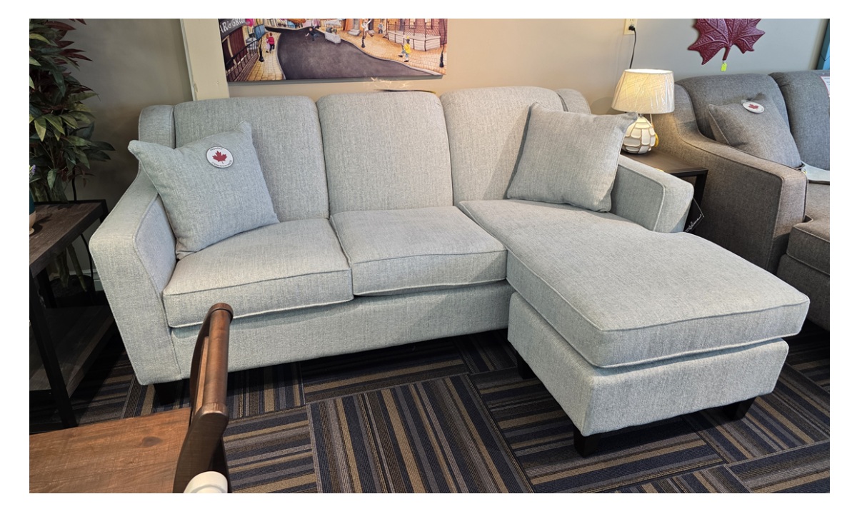 Trendline offers Canadian made sofa sets at economical prices!! The frame is constructed with a combination of hardwood and plywood and has a tight back. Each sofa/chaise comes with a matching set of toss pillows. Chaise is movable to left or right side of sofa. Loveseat, matching chair and sofa/chaise are also available. Available to order in lots of fabric and colour options.