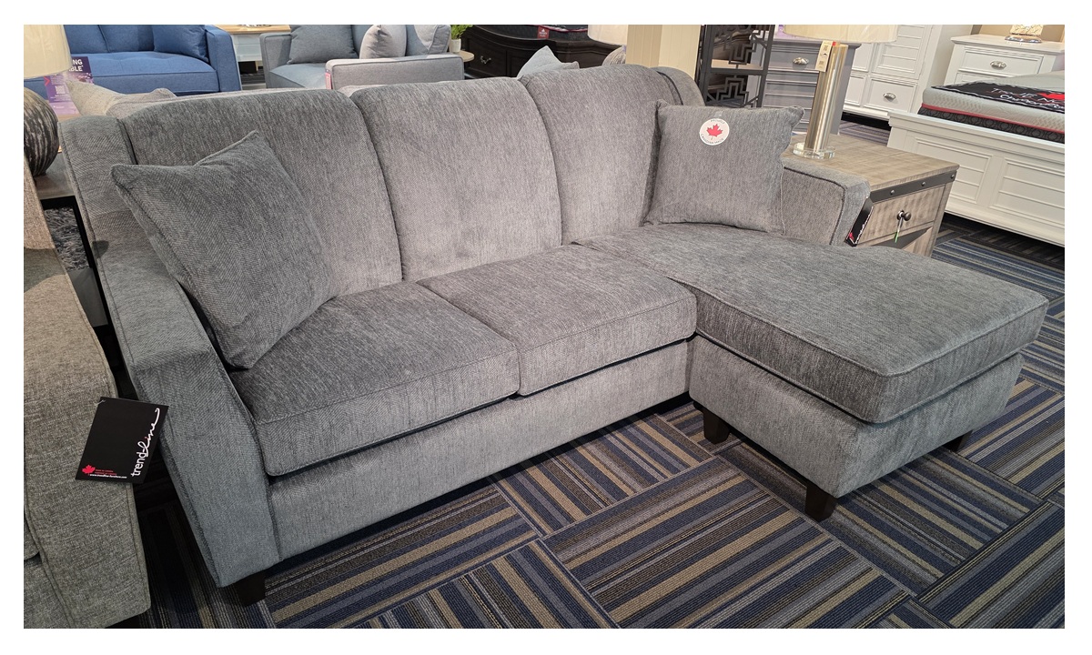 Trendline offers Canadian made sofa sets at economical prices!! The frame is constructed with a combination of hardwood and plywood and has a tight back.  Each sofa/chaise comes with a matching set of toss pillows. Chaise is movable to left or right side of sofa.  Loveseat, matching chair and sofa are also available.  Available to order in lots of fabric and colour options.